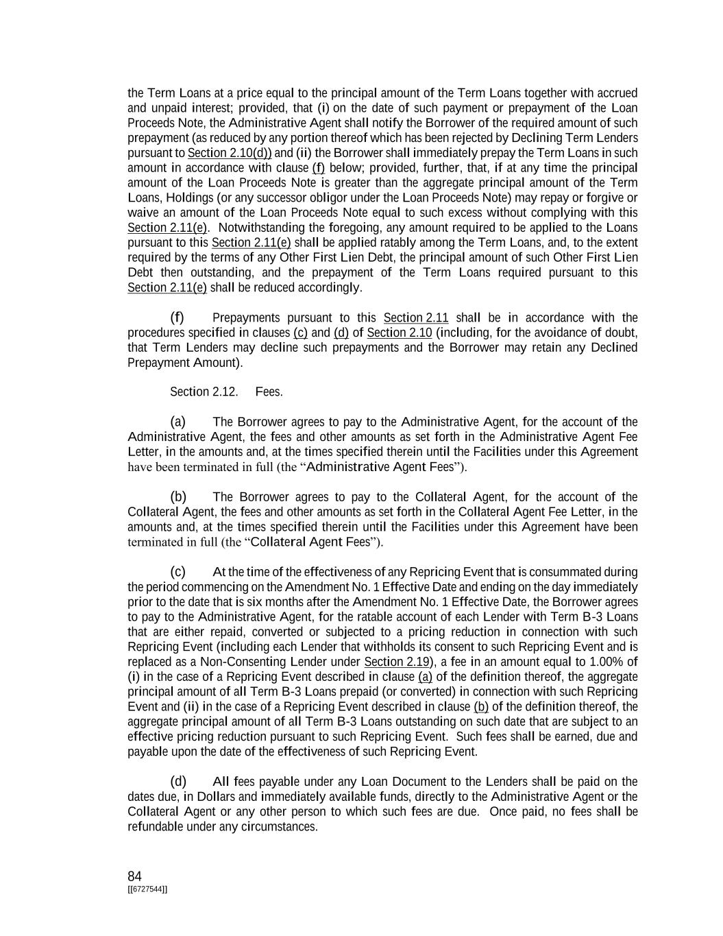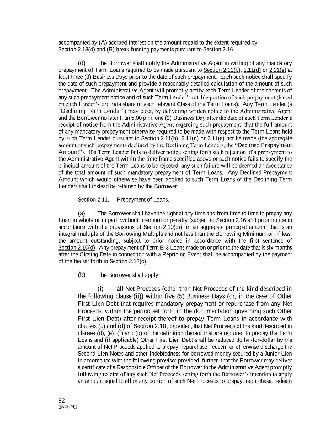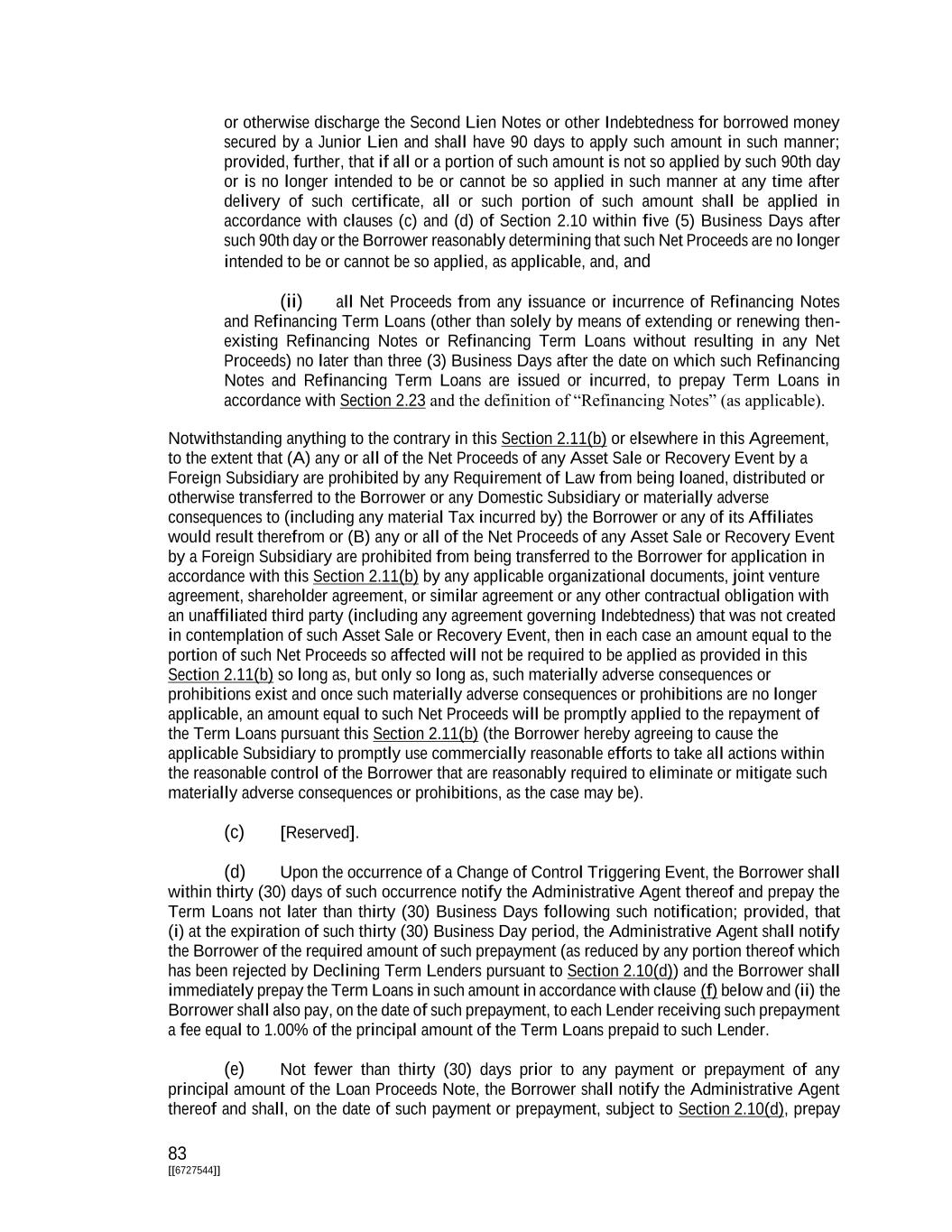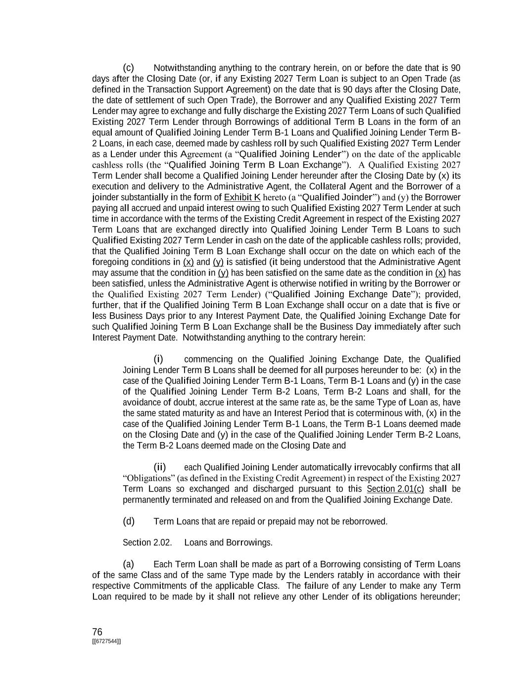 76 [[6727544]] (c) Notwithstanding anything to the contrary herein, on or before the date that is 90 days after the Closing Date (or, if any Existing 2027 Term Loan is subject to an Open Trade (as defined in the Transaction Support Agreement) on the date that is 90 days after the Closing Date, the date of settlement of such Open Trade), the Borrower and any Qualified Existing 2027 Term Lender may agree to exchange and fully discharge the Existing 2027 Term Loans of such Qualified Existing 2027 Term Lender through Borrowings of additional Term B Loans in the form of an equal amount of Qualified Joining Lender Term B-1 Loans and Qualified Joining Lender Term B- 2 Loans, in each case, deemed made by cashless roll by such Qualified Existing 2027 Term Lender as a Lender under this Agreement (a “Qualified Joining Lender”) on the date of the applicable cashless rolls (the “Qualified Joining Term B Loan Exchange”). A Qualified Existing 2027 Term Lender shall become a Qualified Joining Lender hereunder after the Closing Date by (x) its execution and delivery to the Administrative Agent, the Collateral Agent and the Borrower of a joinder substantially in the form of Exhibit K hereto (a “Qualified Joinder”) and (y) the Borrower paying all accrued and unpaid interest owing to such Qualified Existing 2027 Term Lender at such time in accordance with the terms of the Existing Credit Agreement in respect of the Existing 2027 Term Loans that are exchanged directly into Qualified Joining Lender Term B Loans to such Qualified Existing 2027 Term Lender in cash on the date of the applicable cashless rolls; provided, that the Qualified Joining Term B Loan Exchange shall occur on the date on which each of the foregoing conditions in (x) and (y) is satisfied (it being understood that the Administrative Agent may assume that the condition in (y) has been satisfied on the same date as the condition in (x) has been satisfied, unless the Administrative Agent is otherwise notified in writing by the Borrower or the Qualified Existing 2027 Term Lender) (“Qualified Joining Exchange Date”); provided, further, that if the Qualified Joining Term B Loan Exchange shall occur on a date that is five or less Business Days prior to any Interest Payment Date, the Qualified Joining Exchange Date for such Qualified Joining Term B Loan Exchange shall be the Business Day immediately after such Interest Payment Date. Notwithstanding anything to the contrary herein: (i) commencing on the Qualified Joining Exchange Date, the Qualified Joining Lender Term B Loans shall be deemed for all purposes hereunder to be: (x) in the case of the Qualified Joining Lender Term B-1 Loans, Term B-1 Loans and (y) in the case of the Qualified Joining Lender Term B-2 Loans, Term B-2 Loans and shall, for the avoidance of doubt, accrue interest at the same rate as, be the same Type of Loan as, have the same stated maturity as and have an Interest Period that is coterminous with, (x) in the case of the Qualified Joining Lender Term B-1 Loans, the Term B-1 Loans deemed made on the Closing Date and (y) in the case of the Qualified Joining Lender Term B-2 Loans, the Term B-2 Loans deemed made on the Closing Date and (ii) each Qualified Joining Lender automatically irrevocably confirms that all “Obligations” (as defined in the Existing Credit Agreement) in respect of the Existing 2027 Term Loans so exchanged and discharged pursuant to this Section 2.01(c) shall be permanently terminated and released on and from the Qualified Joining Exchange Date. (d) Term Loans that are repaid or prepaid may not be reborrowed. Section 2.02. Loans and Borrowings. (a) Each Term Loan shall be made as part of a Borrowing consisting of Term Loans of the same Class and of the same Type made by the Lenders ratably in accordance with their respective Commitments of the applicable Class. The failure of any Lender to make any Term Loan required to be made by it shall not relieve any other Lender of its obligations hereunder;