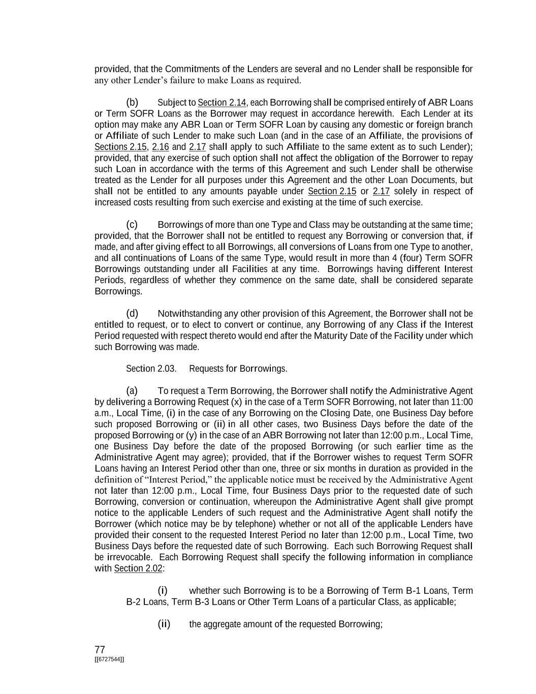 77 [[6727544]] provided, that the Commitments of the Lenders are several and no Lender shall be responsible for any other Lender’s failure to make Loans as required. (b) Subject to Section 2.14, each Borrowing shall be comprised entirely of ABR Loans or Term SOFR Loans as the Borrower may request in accordance herewith. Each Lender at its option may make any ABR Loan or Term SOFR Loan by causing any domestic or foreign branch or Affiliate of such Lender to make such Loan (and in the case of an Affiliate, the provisions of Sections 2.15, 2.16 and 2.17 shall apply to such Affiliate to the same extent as to such Lender); provided, that any exercise of such option shall not affect the obligation of the Borrower to repay such Loan in accordance with the terms of this Agreement and such Lender shall be otherwise treated as the Lender for all purposes under this Agreement and the other Loan Documents, but shall not be entitled to any amounts payable under Section 2.15 or 2.17 solely in respect of increased costs resulting from such exercise and existing at the time of such exercise. (c) Borrowings of more than one Type and Class may be outstanding at the same time; provided, that the Borrower shall not be entitled to request any Borrowing or conversion that, if made, and after giving effect to all Borrowings, all conversions of Loans from one Type to another, and all continuations of Loans of the same Type, would result in more than 4 (four) Term SOFR Borrowings outstanding under all Facilities at any time. Borrowings having different Interest Periods, regardless of whether they commence on the same date, shall be considered separate Borrowings. (d) Notwithstanding any other provision of this Agreement, the Borrower shall not be entitled to request, or to elect to convert or continue, any Borrowing of any Class if the Interest Period requested with respect thereto would end after the Maturity Date of the Facility under which such Borrowing was made. Section 2.03. Requests for Borrowings. (a) To request a Term Borrowing, the Borrower shall notify the Administrative Agent by delivering a Borrowing Request (x) in the case of a Term SOFR Borrowing, not later than 11:00 a.m., Local Time, (i) in the case of any Borrowing on the Closing Date, one Business Day before such proposed Borrowing or (ii) in all other cases, two Business Days before the date of the proposed Borrowing or (y) in the case of an ABR Borrowing not later than 12:00 p.m., Local Time, one Business Day before the date of the proposed Borrowing (or such earlier time as the Administrative Agent may agree); provided, that if the Borrower wishes to request Term SOFR Loans having an Interest Period other than one, three or six months in duration as provided in the definition of “Interest Period,” the applicable notice must be received by the Administrative Agent not later than 12:00 p.m., Local Time, four Business Days prior to the requested date of such Borrowing, conversion or continuation, whereupon the Administrative Agent shall give prompt notice to the applicable Lenders of such request and the Administrative Agent shall notify the Borrower (which notice may be by telephone) whether or not all of the applicable Lenders have provided their consent to the requested Interest Period no later than 12:00 p.m., Local Time, two Business Days before the requested date of such Borrowing. Each such Borrowing Request shall be irrevocable. Each Borrowing Request shall specify the following information in compliance with Section 2.02: (i) whether such Borrowing is to be a Borrowing of Term B-1 Loans, Term B-2 Loans, Term B-3 Loans or Other Term Loans of a particular Class, as applicable; (ii) the aggregate amount of the requested Borrowing;