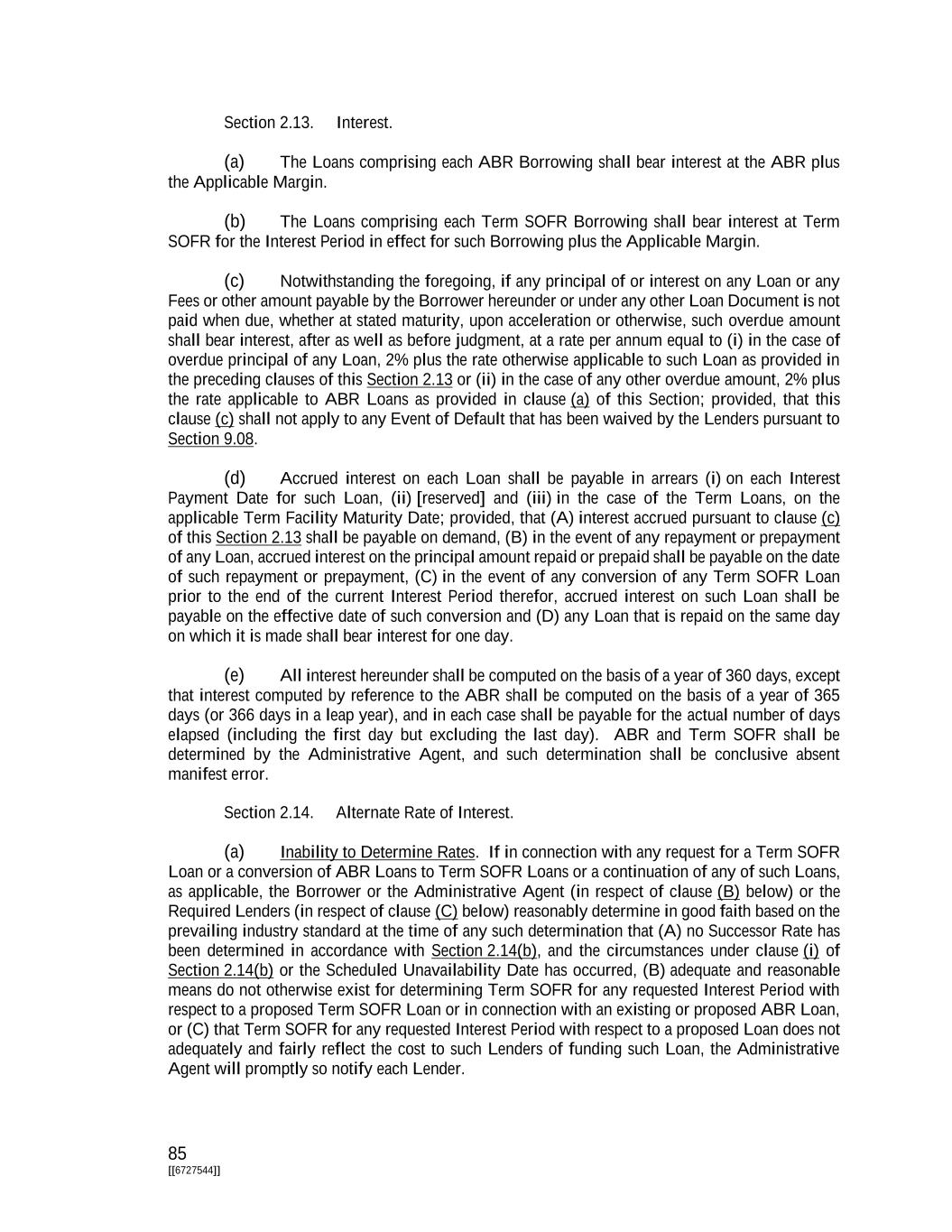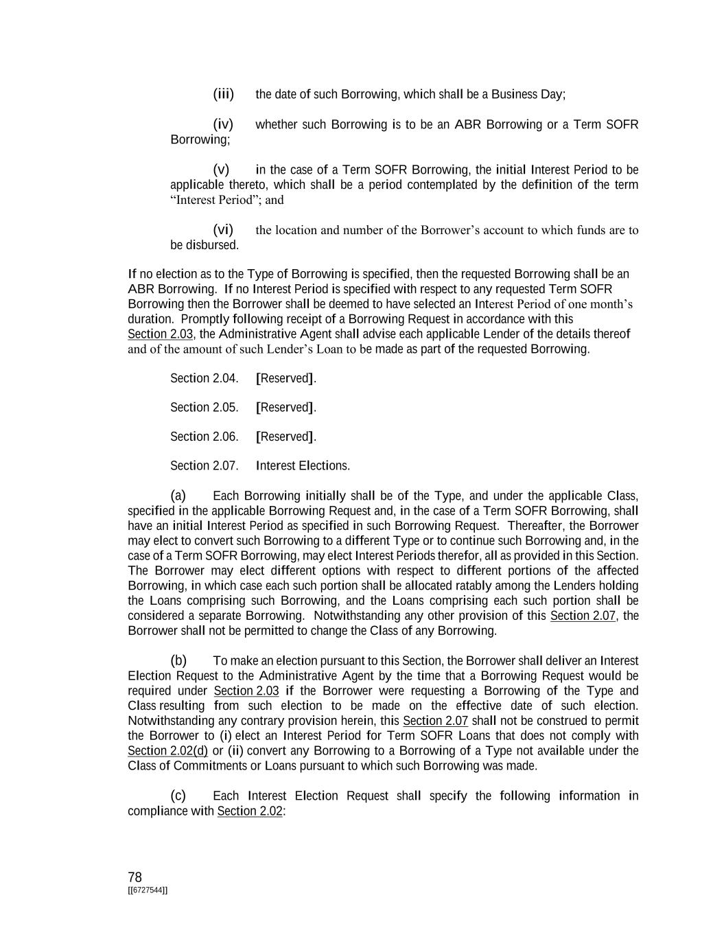 78 [[6727544]] (iii) the date of such Borrowing, which shall be a Business Day; (iv) whether such Borrowing is to be an ABR Borrowing or a Term SOFR Borrowing; (v) in the case of a Term SOFR Borrowing, the initial Interest Period to be applicable thereto, which shall be a period contemplated by the definition of the term “Interest Period”; and (vi) the location and number of the Borrower’s account to which funds are to be disbursed. If no election as to the Type of Borrowing is specified, then the requested Borrowing shall be an ABR Borrowing. If no Interest Period is specified with respect to any requested Term SOFR Borrowing then the Borrower shall be deemed to have selected an Interest Period of one month’s duration. Promptly following receipt of a Borrowing Request in accordance with this Section 2.03, the Administrative Agent shall advise each applicable Lender of the details thereof and of the amount of such Lender’s Loan to be made as part of the requested Borrowing. Section 2.04. [Reserved]. Section 2.05. [Reserved]. Section 2.06. [Reserved]. Section 2.07. Interest Elections. (a) Each Borrowing initially shall be of the Type, and under the applicable Class, specified in the applicable Borrowing Request and, in the case of a Term SOFR Borrowing, shall have an initial Interest Period as specified in such Borrowing Request. Thereafter, the Borrower may elect to convert such Borrowing to a different Type or to continue such Borrowing and, in the case of a Term SOFR Borrowing, may elect Interest Periods therefor, all as provided in this Section. The Borrower may elect different options with respect to different portions of the affected Borrowing, in which case each such portion shall be allocated ratably among the Lenders holding the Loans comprising such Borrowing, and the Loans comprising each such portion shall be considered a separate Borrowing. Notwithstanding any other provision of this Section 2.07, the Borrower shall not be permitted to change the Class of any Borrowing. (b) To make an election pursuant to this Section, the Borrower shall deliver an Interest Election Request to the Administrative Agent by the time that a Borrowing Request would be required under Section 2.03 if the Borrower were requesting a Borrowing of the Type and Class resulting from such election to be made on the effective date of such election. Notwithstanding any contrary provision herein, this Section 2.07 shall not be construed to permit the Borrower to (i) elect an Interest Period for Term SOFR Loans that does not comply with Section 2.02(d) or (ii) convert any Borrowing to a Borrowing of a Type not available under the Class of Commitments or Loans pursuant to which such Borrowing was made. (c) Each Interest Election Request shall specify the following information in compliance with Section 2.02: