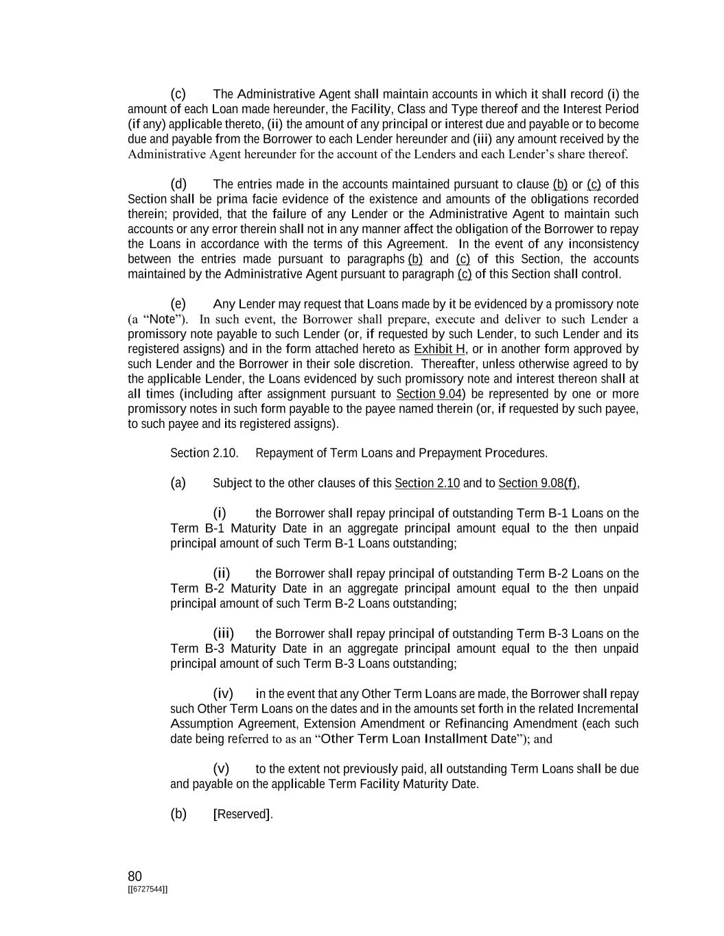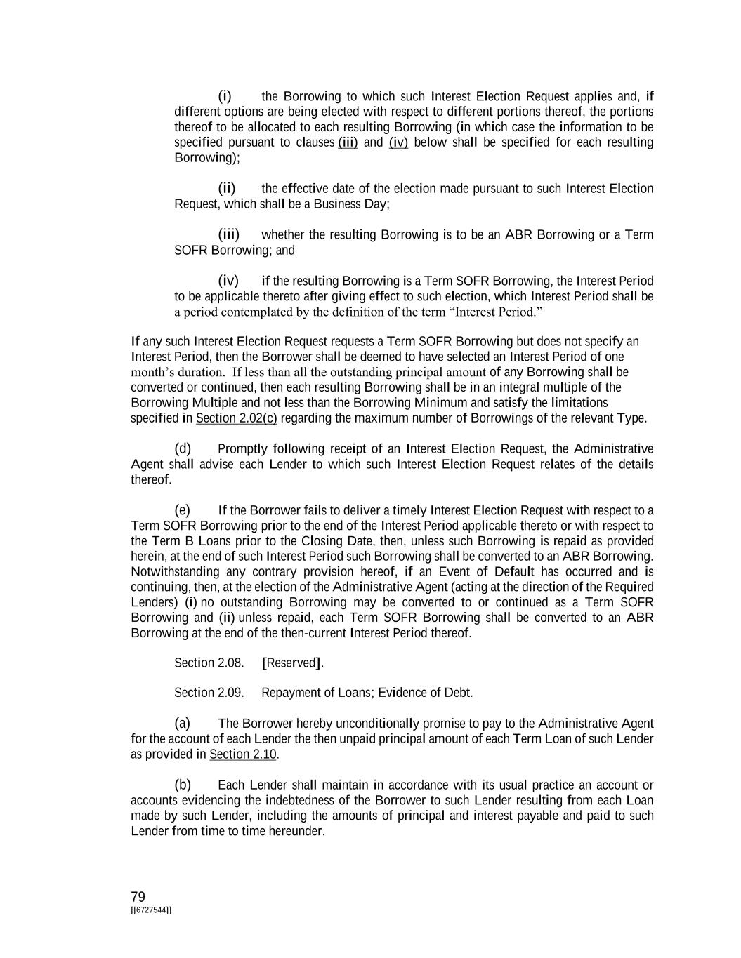 79 [[6727544]] (i) the Borrowing to which such Interest Election Request applies and, if different options are being elected with respect to different portions thereof, the portions thereof to be allocated to each resulting Borrowing (in which case the information to be specified pursuant to clauses (iii) and (iv) below shall be specified for each resulting Borrowing); (ii) the effective date of the election made pursuant to such Interest Election Request, which shall be a Business Day; (iii) whether the resulting Borrowing is to be an ABR Borrowing or a Term SOFR Borrowing; and (iv) if the resulting Borrowing is a Term SOFR Borrowing, the Interest Period to be applicable thereto after giving effect to such election, which Interest Period shall be a period contemplated by the definition of the term “Interest Period.” If any such Interest Election Request requests a Term SOFR Borrowing but does not specify an Interest Period, then the Borrower shall be deemed to have selected an Interest Period of one month’s duration. If less than all the outstanding principal amount of any Borrowing shall be converted or continued, then each resulting Borrowing shall be in an integral multiple of the Borrowing Multiple and not less than the Borrowing Minimum and satisfy the limitations specified in Section 2.02(c) regarding the maximum number of Borrowings of the relevant Type. (d) Promptly following receipt of an Interest Election Request, the Administrative Agent shall advise each Lender to which such Interest Election Request relates of the details thereof. (e) If the Borrower fails to deliver a timely Interest Election Request with respect to a Term SOFR Borrowing prior to the end of the Interest Period applicable thereto or with respect to the Term B Loans prior to the Closing Date, then, unless such Borrowing is repaid as provided herein, at the end of such Interest Period such Borrowing shall be converted to an ABR Borrowing. Notwithstanding any contrary provision hereof, if an Event of Default has occurred and is continuing, then, at the election of the Administrative Agent (acting at the direction of the Required Lenders) (i) no outstanding Borrowing may be converted to or continued as a Term SOFR Borrowing and (ii) unless repaid, each Term SOFR Borrowing shall be converted to an ABR Borrowing at the end of the then-current Interest Period thereof. Section 2.08. [Reserved]. Section 2.09. Repayment of Loans; Evidence of Debt. (a) The Borrower hereby unconditionally promise to pay to the Administrative Agent for the account of each Lender the then unpaid principal amount of each Term Loan of such Lender as provided in Section 2.10. (b) Each Lender shall maintain in accordance with its usual practice an account or accounts evidencing the indebtedness of the Borrower to such Lender resulting from each Loan made by such Lender, including the amounts of principal and interest payable and paid to such Lender from time to time hereunder.