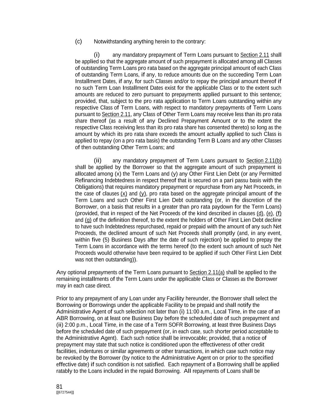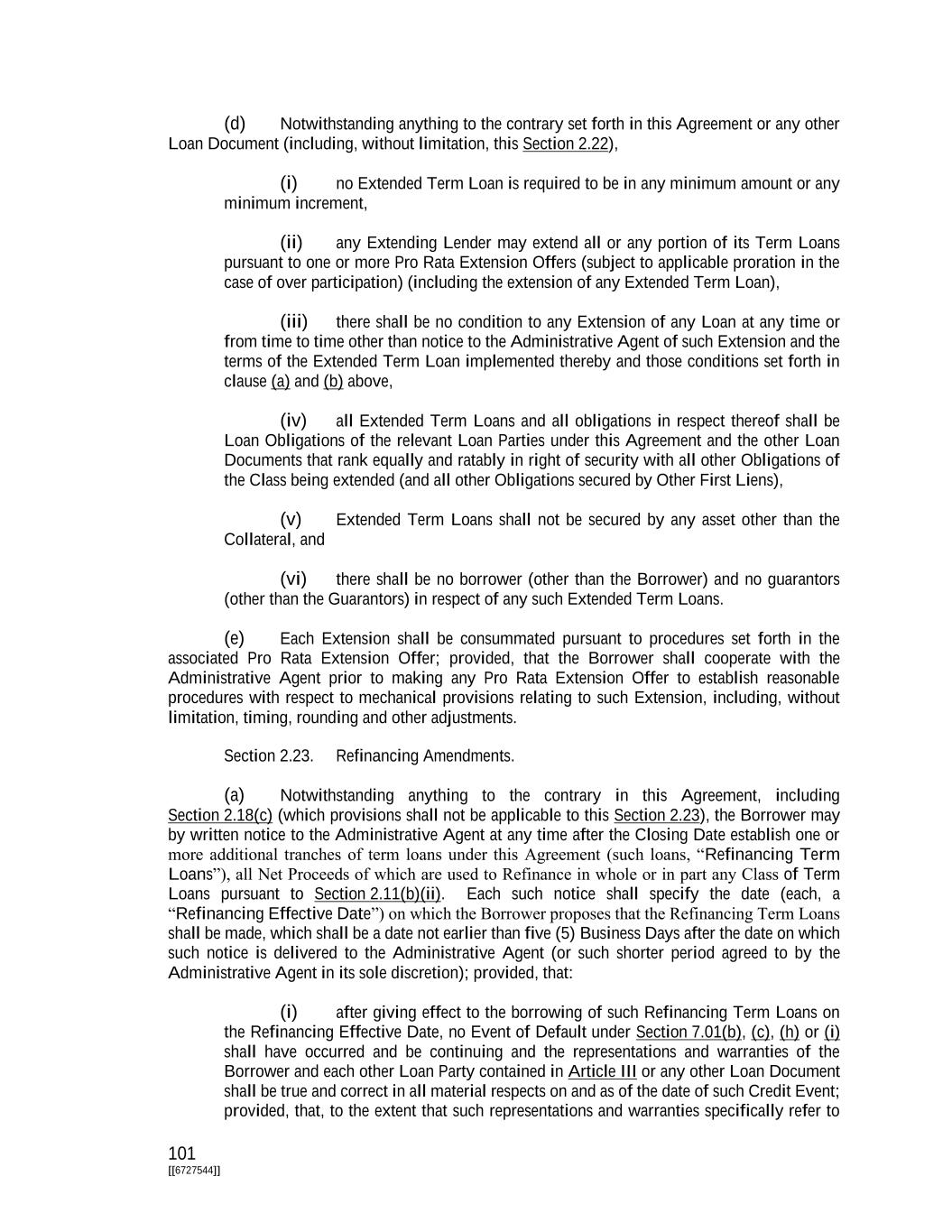 101 [[6727544]] (d) Notwithstanding anything to the contrary set forth in this Agreement or any other Loan Document (including, without limitation, this Section 2.22), (i) no Extended Term Loan is required to be in any minimum amount or any minimum increment, (ii) any Extending Lender may extend all or any portion of its Term Loans pursuant to one or more Pro Rata Extension Offers (subject to applicable proration in the case of over participation) (including the extension of any Extended Term Loan), (iii) there shall be no condition to any Extension of any Loan at any time or from time to time other than notice to the Administrative Agent of such Extension and the terms of the Extended Term Loan implemented thereby and those conditions set forth in clause (a) and (b) above, (iv) all Extended Term Loans and all obligations in respect thereof shall be Loan Obligations of the relevant Loan Parties under this Agreement and the other Loan Documents that rank equally and ratably in right of security with all other Obligations of the Class being extended (and all other Obligations secured by Other First Liens), (v) Extended Term Loans shall not be secured by any asset other than the Collateral, and (vi) there shall be no borrower (other than the Borrower) and no guarantors (other than the Guarantors) in respect of any such Extended Term Loans. (e) Each Extension shall be consummated pursuant to procedures set forth in the associated Pro Rata Extension Offer; provided, that the Borrower shall cooperate with the Administrative Agent prior to making any Pro Rata Extension Offer to establish reasonable procedures with respect to mechanical provisions relating to such Extension, including, without limitation, timing, rounding and other adjustments. Section 2.23. Refinancing Amendments. (a) Notwithstanding anything to the contrary in this Agreement, including Section 2.18(c) (which provisions shall not be applicable to this Section 2.23), the Borrower may by written notice to the Administrative Agent at any time after the Closing Date establish one or more additional tranches of term loans under this Agreement (such loans, “Refinancing Term Loans”), all Net Proceeds of which are used to Refinance in whole or in part any Class of Term Loans pursuant to Section 2.11(b)(ii). Each such notice shall specify the date (each, a “Refinancing Effective Date”) on which the Borrower proposes that the Refinancing Term Loans shall be made, which shall be a date not earlier than five (5) Business Days after the date on which such notice is delivered to the Administrative Agent (or such shorter period agreed to by the Administrative Agent in its sole discretion); provided, that: (i) after giving effect to the borrowing of such Refinancing Term Loans on the Refinancing Effective Date, no Event of Default under Section 7.01(b), (c), (h) or (i) shall have occurred and be continuing and the representations and warranties of the Borrower and each other Loan Party contained in Article III or any other Loan Document shall be true and correct in all material respects on and as of the date of such Credit Event; provided, that, to the extent that such representations and warranties specifically refer to
