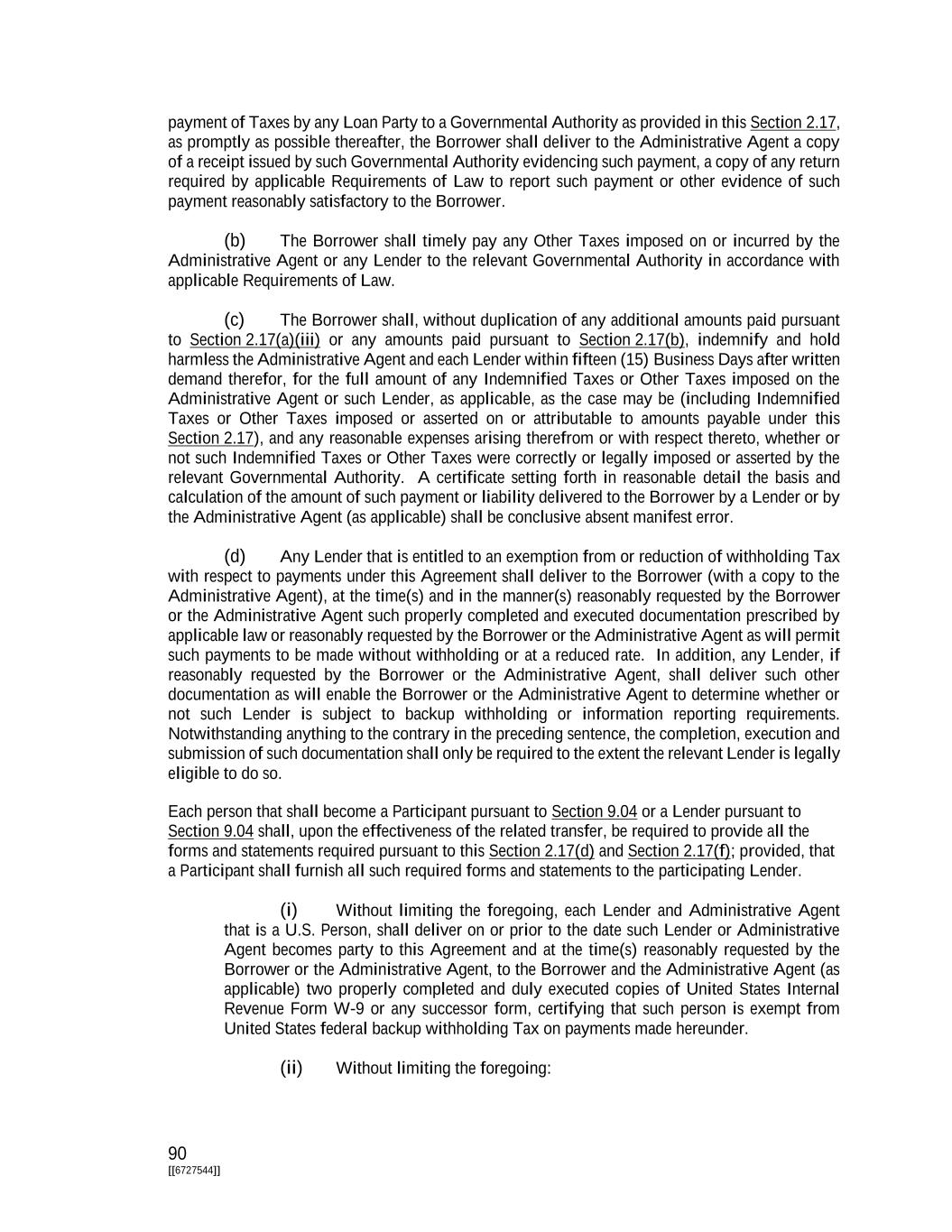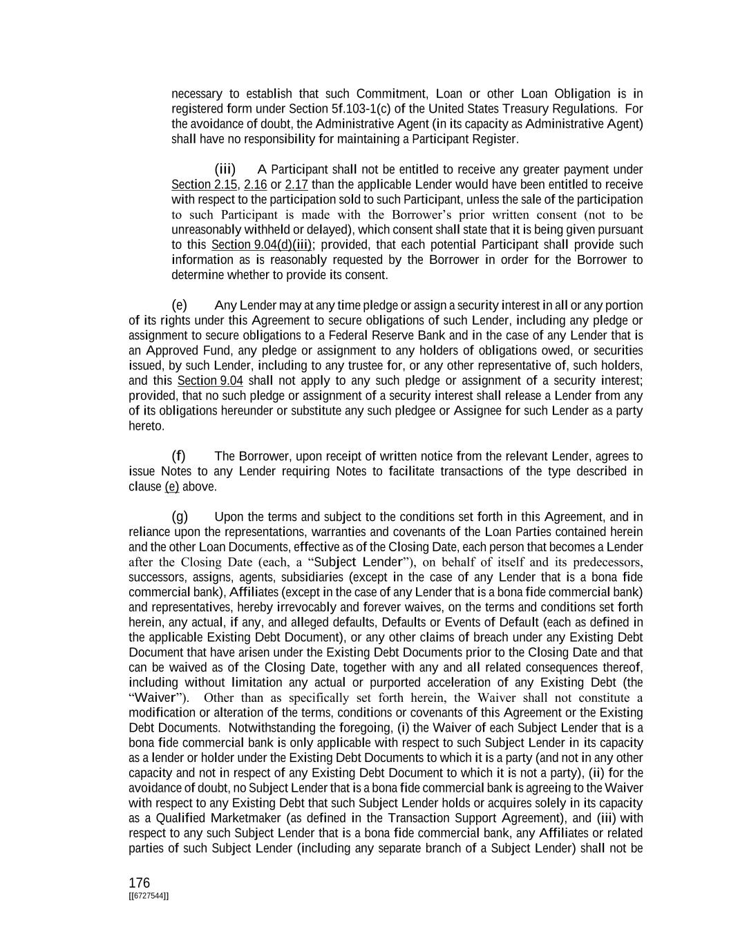 176 [[6727544]] necessary to establish that such Commitment, Loan or other Loan Obligation is in registered form under Section 5f.103-1(c) of the United States Treasury Regulations. For the avoidance of doubt, the Administrative Agent (in its capacity as Administrative Agent) shall have no responsibility for maintaining a Participant Register. (iii) A Participant shall not be entitled to receive any greater payment under Section 2.15, 2.16 or 2.17 than the applicable Lender would have been entitled to receive with respect to the participation sold to such Participant, unless the sale of the participation to such Participant is made with the Borrower’s prior written consent (not to be unreasonably withheld or delayed), which consent shall state that it is being given pursuant to this Section 9.04(d)(iii); provided, that each potential Participant shall provide such information as is reasonably requested by the Borrower in order for the Borrower to determine whether to provide its consent. (e) Any Lender may at any time pledge or assign a security interest in all or any portion of its rights under this Agreement to secure obligations of such Lender, including any pledge or assignment to secure obligations to a Federal Reserve Bank and in the case of any Lender that is an Approved Fund, any pledge or assignment to any holders of obligations owed, or securities issued, by such Lender, including to any trustee for, or any other representative of, such holders, and this Section 9.04 shall not apply to any such pledge or assignment of a security interest; provided, that no such pledge or assignment of a security interest shall release a Lender from any of its obligations hereunder or substitute any such pledgee or Assignee for such Lender as a party hereto. (f) The Borrower, upon receipt of written notice from the relevant Lender, agrees to issue Notes to any Lender requiring Notes to facilitate transactions of the type described in clause (e) above. (g) Upon the terms and subject to the conditions set forth in this Agreement, and in reliance upon the representations, warranties and covenants of the Loan Parties contained herein and the other Loan Documents, effective as of the Closing Date, each person that becomes a Lender after the Closing Date (each, a “Subject Lender”), on behalf of itself and its predecessors, successors, assigns, agents, subsidiaries (except in the case of any Lender that is a bona fide commercial bank), Affiliates (except in the case of any Lender that is a bona fide commercial bank) and representatives, hereby irrevocably and forever waives, on the terms and conditions set forth herein, any actual, if any, and alleged defaults, Defaults or Events of Default (each as defined in the applicable Existing Debt Document), or any other claims of breach under any Existing Debt Document that have arisen under the Existing Debt Documents prior to the Closing Date and that can be waived as of the Closing Date, together with any and all related consequences thereof, including without limitation any actual or purported acceleration of any Existing Debt (the “Waiver”). Other than as specifically set forth herein, the Waiver shall not constitute a modification or alteration of the terms, conditions or covenants of this Agreement or the Existing Debt Documents. Notwithstanding the foregoing, (i) the Waiver of each Subject Lender that is a bona fide commercial bank is only applicable with respect to such Subject Lender in its capacity as a lender or holder under the Existing Debt Documents to which it is a party (and not in any other capacity and not in respect of any Existing Debt Document to which it is not a party), (ii) for the avoidance of doubt, no Subject Lender that is a bona fide commercial bank is agreeing to the Waiver with respect to any Existing Debt that such Subject Lender holds or acquires solely in its capacity as a Qualified Marketmaker (as defined in the Transaction Support Agreement), and (iii) with respect to any such Subject Lender that is a bona fide commercial bank, any Affiliates or related parties of such Subject Lender (including any separate branch of a Subject Lender) shall not be