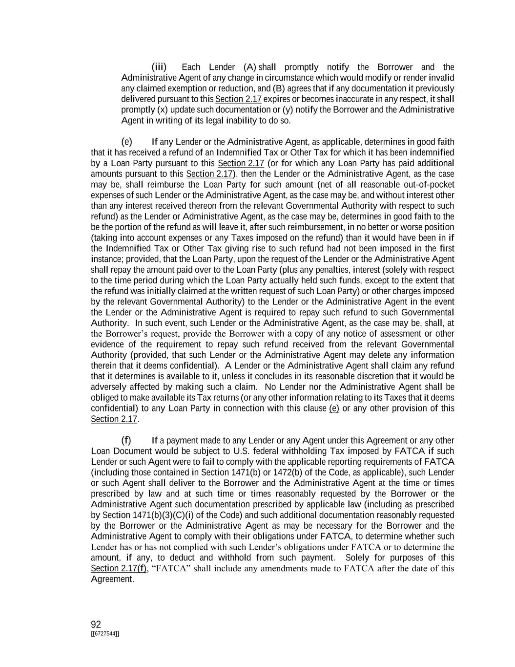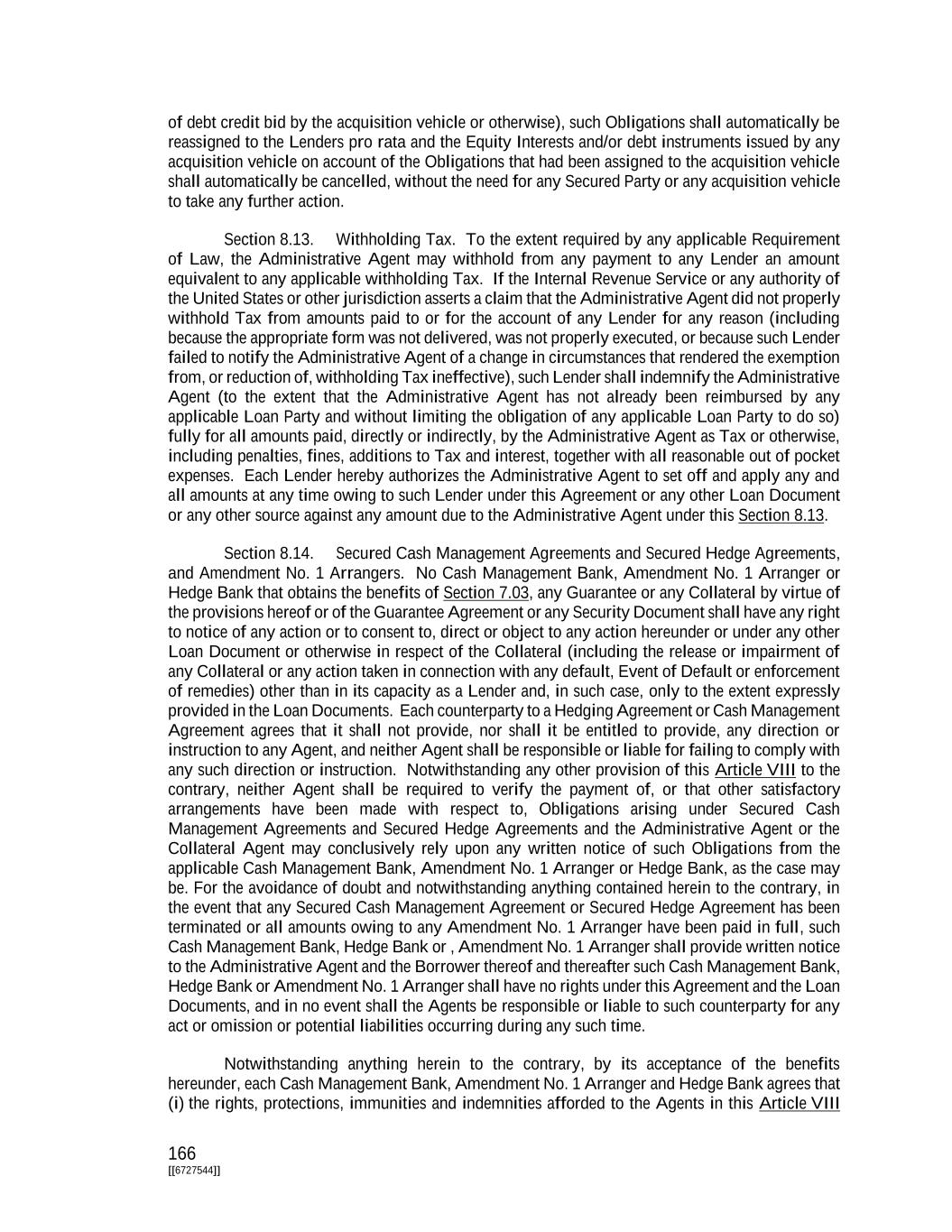 166 [[6727544]] of debt credit bid by the acquisition vehicle or otherwise), such Obligations shall automatically be reassigned to the Lenders pro rata and the Equity Interests and/or debt instruments issued by any acquisition vehicle on account of the Obligations that had been assigned to the acquisition vehicle shall automatically be cancelled, without the need for any Secured Party or any acquisition vehicle to take any further action. Section 8.13. Withholding Tax. To the extent required by any applicable Requirement of Law, the Administrative Agent may withhold from any payment to any Lender an amount equivalent to any applicable withholding Tax. If the Internal Revenue Service or any authority of the United States or other jurisdiction asserts a claim that the Administrative Agent did not properly withhold Tax from amounts paid to or for the account of any Lender for any reason (including because the appropriate form was not delivered, was not properly executed, or because such Lender failed to notify the Administrative Agent of a change in circumstances that rendered the exemption from, or reduction of, withholding Tax ineffective), such Lender shall indemnify the Administrative Agent (to the extent that the Administrative Agent has not already been reimbursed by any applicable Loan Party and without limiting the obligation of any applicable Loan Party to do so) fully for all amounts paid, directly or indirectly, by the Administrative Agent as Tax or otherwise, including penalties, fines, additions to Tax and interest, together with all reasonable out of pocket expenses. Each Lender hereby authorizes the Administrative Agent to set off and apply any and all amounts at any time owing to such Lender under this Agreement or any other Loan Document or any other source against any amount due to the Administrative Agent under this Section 8.13. Section 8.14. Secured Cash Management Agreements and Secured Hedge Agreements, and Amendment No. 1 Arrangers. No Cash Management Bank, Amendment No. 1 Arranger or Hedge Bank that obtains the benefits of Section 7.03, any Guarantee or any Collateral by virtue of the provisions hereof or of the Guarantee Agreement or any Security Document shall have any right to notice of any action or to consent to, direct or object to any action hereunder or under any other Loan Document or otherwise in respect of the Collateral (including the release or impairment of any Collateral or any action taken in connection with any default, Event of Default or enforcement of remedies) other than in its capacity as a Lender and, in such case, only to the extent expressly provided in the Loan Documents. Each counterparty to a Hedging Agreement or Cash Management Agreement agrees that it shall not provide, nor shall it be entitled to provide, any direction or instruction to any Agent, and neither Agent shall be responsible or liable for failing to comply with any such direction or instruction. Notwithstanding any other provision of this Article VIII to the contrary, neither Agent shall be required to verify the payment of, or that other satisfactory arrangements have been made with respect to, Obligations arising under Secured Cash Management Agreements and Secured Hedge Agreements and the Administrative Agent or the Collateral Agent may conclusively rely upon any written notice of such Obligations from the applicable Cash Management Bank, Amendment No. 1 Arranger or Hedge Bank, as the case may be. For the avoidance of doubt and notwithstanding anything contained herein to the contrary, in the event that any Secured Cash Management Agreement or Secured Hedge Agreement has been terminated or all amounts owing to any Amendment No. 1 Arranger have been paid in full, such Cash Management Bank, Hedge Bank or , Amendment No. 1 Arranger shall provide written notice to the Administrative Agent and the Borrower thereof and thereafter such Cash Management Bank, Hedge Bank or Amendment No. 1 Arranger shall have no rights under this Agreement and the Loan Documents, and in no event shall the Agents be responsible or liable to such counterparty for any act or omission or potential liabilities occurring during any such time. Notwithstanding anything herein to the contrary, by its acceptance of the benefits hereunder, each Cash Management Bank, Amendment No. 1 Arranger and Hedge Bank agrees that (i) the rights, protections, immunities and indemnities afforded to the Agents in this Article VIII