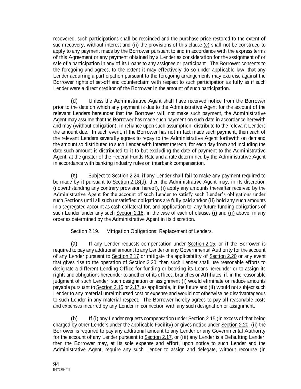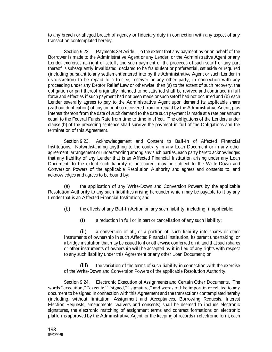 193 [[6727544]] to any breach or alleged breach of agency or fiduciary duty in connection with any aspect of any transaction contemplated hereby. Section 9.22. Payments Set Aside. To the extent that any payment by or on behalf of the Borrower is made to the Administrative Agent or any Lender, or the Administrative Agent or any Lender exercises its right of setoff, and such payment or the proceeds of such setoff or any part thereof is subsequently invalidated, declared to be fraudulent or preferential, set aside or required (including pursuant to any settlement entered into by the Administrative Agent or such Lender in its discretion) to be repaid to a trustee, receiver or any other party, in connection with any proceeding under any Debtor Relief Law or otherwise, then (a) to the extent of such recovery, the obligation or part thereof originally intended to be satisfied shall be revived and continued in full force and effect as if such payment had not been made or such setoff had not occurred and (b) each Lender severally agrees to pay to the Administrative Agent upon demand its applicable share (without duplication) of any amount so recovered from or repaid by the Administrative Agent, plus interest thereon from the date of such demand to the date such payment is made at a rate per annum equal to the Federal Funds Rate from time to time in effect. The obligations of the Lenders under clause (b) of the preceding sentence shall survive the payment in full of the Obligations and the termination of this Agreement. Section 9.23. Acknowledgement and Consent to Bail-In of Affected Financial Institutions. Notwithstanding anything to the contrary in any Loan Document or in any other agreement, arrangement or understanding among any such parties, each party hereto acknowledges that any liability of any Lender that is an Affected Financial Institution arising under any Loan Document, to the extent such liability is unsecured, may be subject to the Write-Down and Conversion Powers of the applicable Resolution Authority and agrees and consents to, and acknowledges and agrees to be bound by: (a) the application of any Write-Down and Conversion Powers by the applicable Resolution Authority to any such liabilities arising hereunder which may be payable to it by any Lender that is an Affected Financial Institution; and (b) the effects of any Bail-In Action on any such liability, including, if applicable: (i) a reduction in full or in part or cancellation of any such liability; (ii) a conversion of all, or a portion of, such liability into shares or other instruments of ownership in such Affected Financial Institution, its parent undertaking, or a bridge institution that may be issued to it or otherwise conferred on it, and that such shares or other instruments of ownership will be accepted by it in lieu of any rights with respect to any such liability under this Agreement or any other Loan Document; or (iii) the variation of the terms of such liability in connection with the exercise of the Write-Down and Conversion Powers of the applicable Resolution Authority. Section 9.24. Electronic Execution of Assignments and Certain Other Documents. The words “execution,” “execute,” “signed,” “signature,” and words of like import in or related to any document to be signed in connection with this Agreement and the transactions contemplated hereby (including, without limitation, Assignment and Acceptances, Borrowing Requests, Interest Election Requests, amendments, waivers and consents) shall be deemed to include electronic signatures, the electronic matching of assignment terms and contract formations on electronic platforms approved by the Administrative Agent, or the keeping of records in electronic form, each