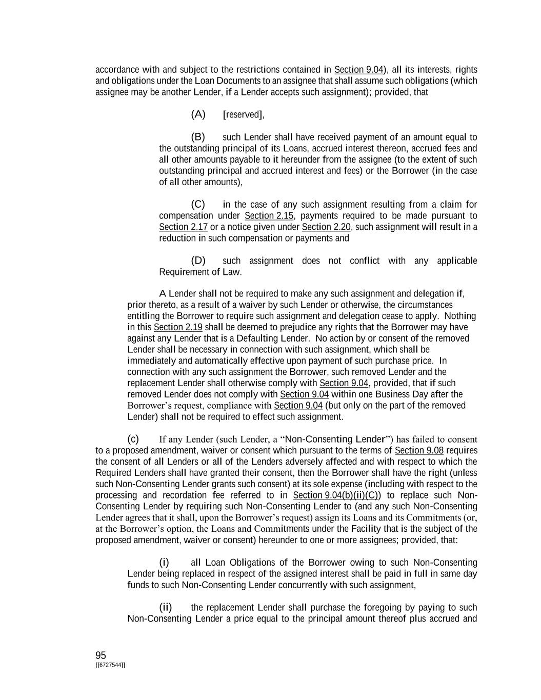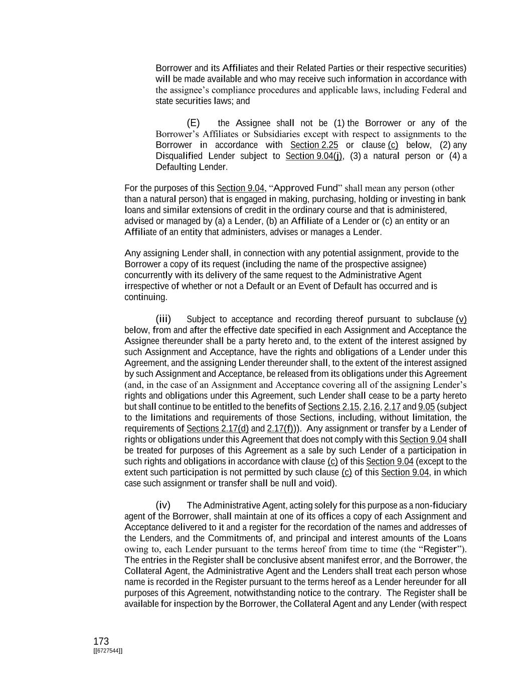 173 [[6727544]] Borrower and its Affiliates and their Related Parties or their respective securities) will be made available and who may receive such information in accordance with the assignee’s compliance procedures and applicable laws, including Federal and state securities laws; and (E) the Assignee shall not be (1) the Borrower or any of the Borrower’s Affiliates or Subsidiaries except with respect to assignments to the Borrower in accordance with Section 2.25 or clause (c) below, (2) any Disqualified Lender subject to Section 9.04(j), (3) a natural person or (4) a Defaulting Lender. For the purposes of this Section 9.04, “Approved Fund” shall mean any person (other than a natural person) that is engaged in making, purchasing, holding or investing in bank loans and similar extensions of credit in the ordinary course and that is administered, advised or managed by (a) a Lender, (b) an Affiliate of a Lender or (c) an entity or an Affiliate of an entity that administers, advises or manages a Lender. Any assigning Lender shall, in connection with any potential assignment, provide to the Borrower a copy of its request (including the name of the prospective assignee) concurrently with its delivery of the same request to the Administrative Agent irrespective of whether or not a Default or an Event of Default has occurred and is continuing. (iii) Subject to acceptance and recording thereof pursuant to subclause (v) below, from and after the effective date specified in each Assignment and Acceptance the Assignee thereunder shall be a party hereto and, to the extent of the interest assigned by such Assignment and Acceptance, have the rights and obligations of a Lender under this Agreement, and the assigning Lender thereunder shall, to the extent of the interest assigned by such Assignment and Acceptance, be released from its obligations under this Agreement (and, in the case of an Assignment and Acceptance covering all of the assigning Lender’s rights and obligations under this Agreement, such Lender shall cease to be a party hereto but shall continue to be entitled to the benefits of Sections 2.15, 2.16, 2.17 and 9.05 (subject to the limitations and requirements of those Sections, including, without limitation, the requirements of Sections 2.17(d) and 2.17(f))). Any assignment or transfer by a Lender of rights or obligations under this Agreement that does not comply with this Section 9.04 shall be treated for purposes of this Agreement as a sale by such Lender of a participation in such rights and obligations in accordance with clause (c) of this Section 9.04 (except to the extent such participation is not permitted by such clause (c) of this Section 9.04, in which case such assignment or transfer shall be null and void). (iv) The Administrative Agent, acting solely for this purpose as a non-fiduciary agent of the Borrower, shall maintain at one of its offices a copy of each Assignment and Acceptance delivered to it and a register for the recordation of the names and addresses of the Lenders, and the Commitments of, and principal and interest amounts of the Loans owing to, each Lender pursuant to the terms hereof from time to time (the “Register”). The entries in the Register shall be conclusive absent manifest error, and the Borrower, the Collateral Agent, the Administrative Agent and the Lenders shall treat each person whose name is recorded in the Register pursuant to the terms hereof as a Lender hereunder for all purposes of this Agreement, notwithstanding notice to the contrary. The Register shall be available for inspection by the Borrower, the Collateral Agent and any Lender (with respect