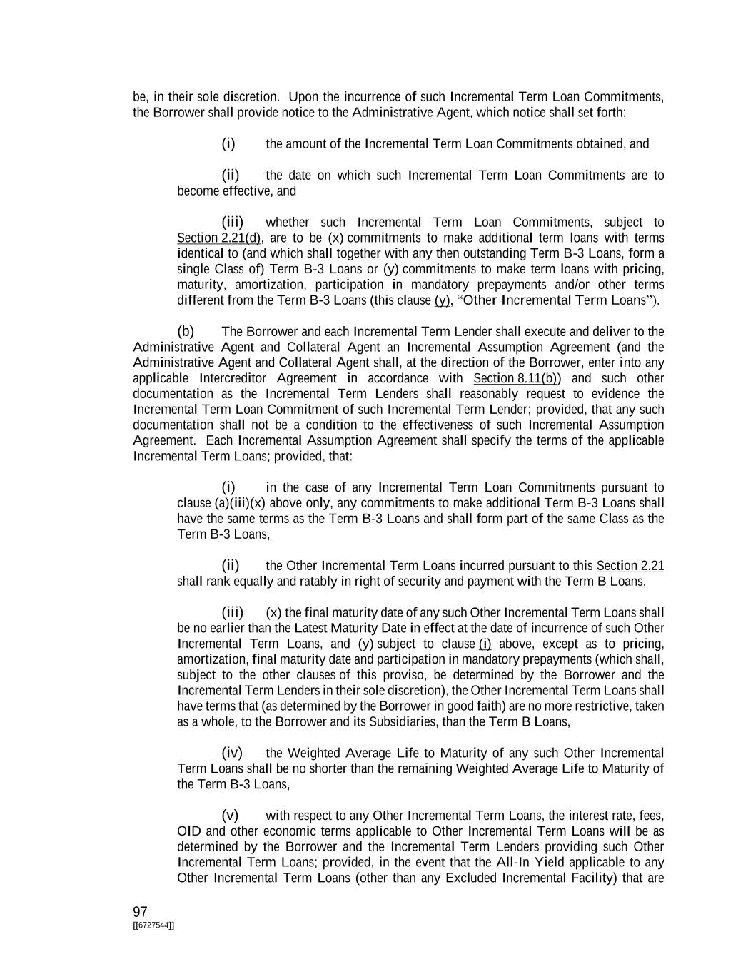 32 [[6727544]] “Incremental Assumption Agreement” shall mean an Incremental Assumption Agreement substantially in the form of Exhibit B hereto, among the Borrower and, if applicable, one or more Incremental Term Lenders. “Incremental Equivalent Debt” shall have the meaning assigned to such term in Section 6.01(v). “Incremental Facility” shall mean commitments and the Incremental Loans made thereunder. “Incremental Loan” shall mean an Incremental Term Loan. “Incremental Term Lender” shall mean a Lender with an Incremental Term Loan Commitment or an outstanding Incremental Term Loan. “Incremental Term Loan Commitment” shall mean the commitment of any Lender, established pursuant to Section 2.21, to make Incremental Term Loans to the Borrower. “Incremental Term Loans” shall mean (a) Term Loans made by one or more Lenders to the Borrower pursuant to Section 2.01(b) consisting of additional Term B-3 Loans and (b) to the extent permitted by Section 2.21 and provided for in the relevant Incremental Assumption Agreement, Other Incremental Term Loans. “Indebtedness” of any person shall mean, without duplication, (a) all obligations of such person for borrowed money, (b) all obligations of such person evidenced by bonds, debentures, notes or similar instruments (except any such obligation issued in the ordinary course of business with a maturity date of no more than six months in a transaction intended to extend payment terms of trade payables or similar obligations to trade creditors incurred in the ordinary course of business), (c) all obligations of such person under conditional sale or other title retention agreements relating to property or assets purchased by such person (except any such obligation that constitutes a trade payable or similar obligation to a trade creditor incurred in the ordinary course of business), (d) all obligations of such person issued or assumed as the deferred purchase price of property or services (except any such balance that (i) constitutes a trade payable or similar obligation to a trade creditor incurred in the ordinary course of business, (ii) any earn-out obligations until such obligation becomes a liability on the balance sheet of such person in accordance with GAAP and (iii) liabilities accrued in the ordinary course of business) which purchase price is due more than six months after the date of placing the property in service or taking delivery and title thereto, (e) all Guarantees by such person of Indebtedness of others, (f) all Capitalized Lease Obligations of such person, including any Capitalized Lease Obligations arising from a Sale and Leaseback Transaction,