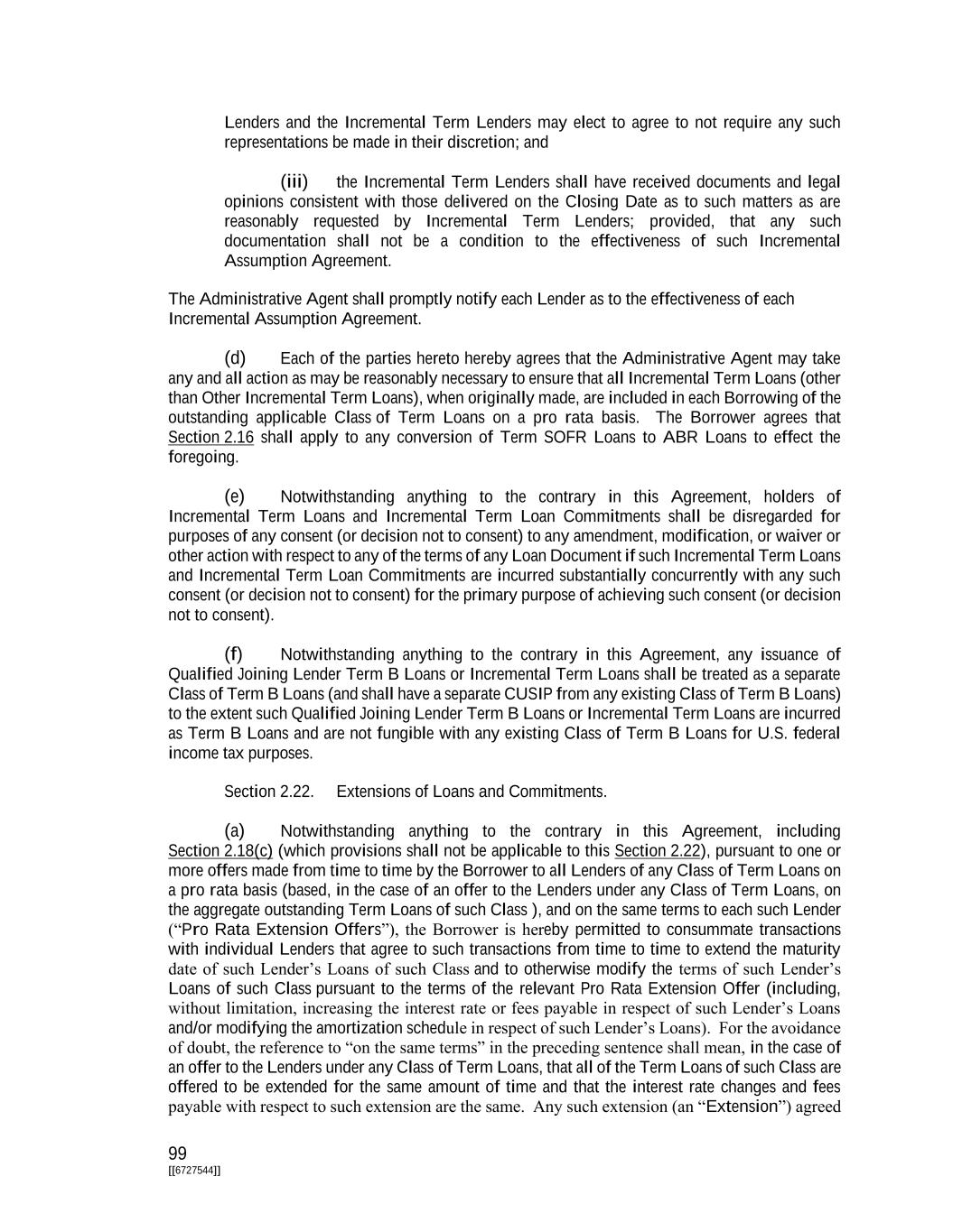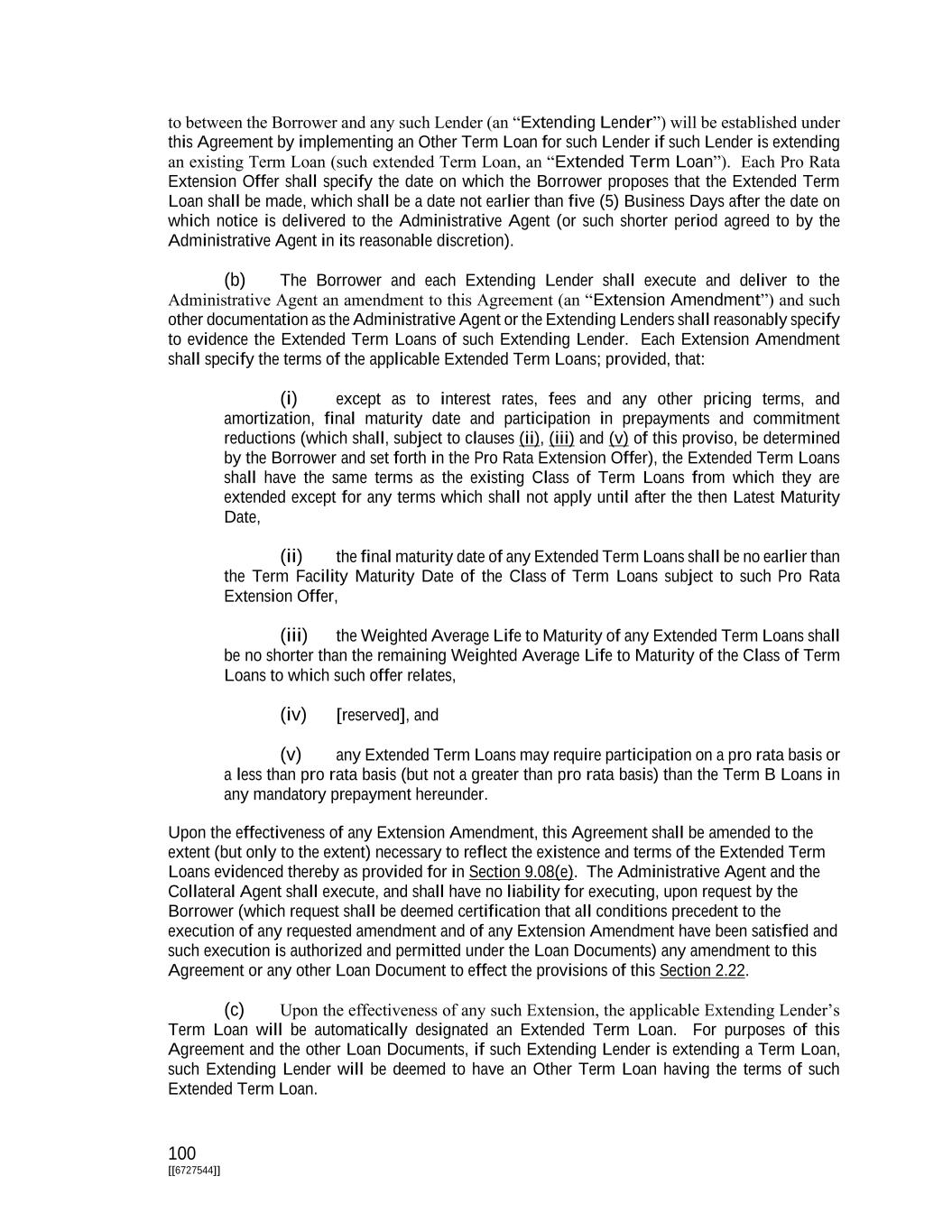 100 [[6727544]] to between the Borrower and any such Lender (an “Extending Lender”) will be established under this Agreement by implementing an Other Term Loan for such Lender if such Lender is extending an existing Term Loan (such extended Term Loan, an “Extended Term Loan”). Each Pro Rata Extension Offer shall specify the date on which the Borrower proposes that the Extended Term Loan shall be made, which shall be a date not earlier than five (5) Business Days after the date on which notice is delivered to the Administrative Agent (or such shorter period agreed to by the Administrative Agent in its reasonable discretion). (b) The Borrower and each Extending Lender shall execute and deliver to the Administrative Agent an amendment to this Agreement (an “Extension Amendment”) and such other documentation as the Administrative Agent or the Extending Lenders shall reasonably specify to evidence the Extended Term Loans of such Extending Lender. Each Extension Amendment shall specify the terms of the applicable Extended Term Loans; provided, that: (i) except as to interest rates, fees and any other pricing terms, and amortization, final maturity date and participation in prepayments and commitment reductions (which shall, subject to clauses (ii), (iii) and (v) of this proviso, be determined by the Borrower and set forth in the Pro Rata Extension Offer), the Extended Term Loans shall have the same terms as the existing Class of Term Loans from which they are extended except for any terms which shall not apply until after the then Latest Maturity Date, (ii) the final maturity date of any Extended Term Loans shall be no earlier than the Term Facility Maturity Date of the Class of Term Loans subject to such Pro Rata Extension Offer, (iii) the Weighted Average Life to Maturity of any Extended Term Loans shall be no shorter than the remaining Weighted Average Life to Maturity of the Class of Term Loans to which such offer relates, (iv) [reserved], and (v) any Extended Term Loans may require participation on a pro rata basis or a less than pro rata basis (but not a greater than pro rata basis) than the Term B Loans in any mandatory prepayment hereunder. Upon the effectiveness of any Extension Amendment, this Agreement shall be amended to the extent (but only to the extent) necessary to reflect the existence and terms of the Extended Term Loans evidenced thereby as provided for in Section 9.08(e). The Administrative Agent and the Collateral Agent shall execute, and shall have no liability for executing, upon request by the Borrower (which request shall be deemed certification that all conditions precedent to the execution of any requested amendment and of any Extension Amendment have been satisfied and such execution is authorized and permitted under the Loan Documents) any amendment to this Agreement or any other Loan Document to effect the provisions of this Section 2.22. (c) Upon the effectiveness of any such Extension, the applicable Extending Lender’s Term Loan will be automatically designated an Extended Term Loan. For purposes of this Agreement and the other Loan Documents, if such Extending Lender is extending a Term Loan, such Extending Lender will be deemed to have an Other Term Loan having the terms of such Extended Term Loan.