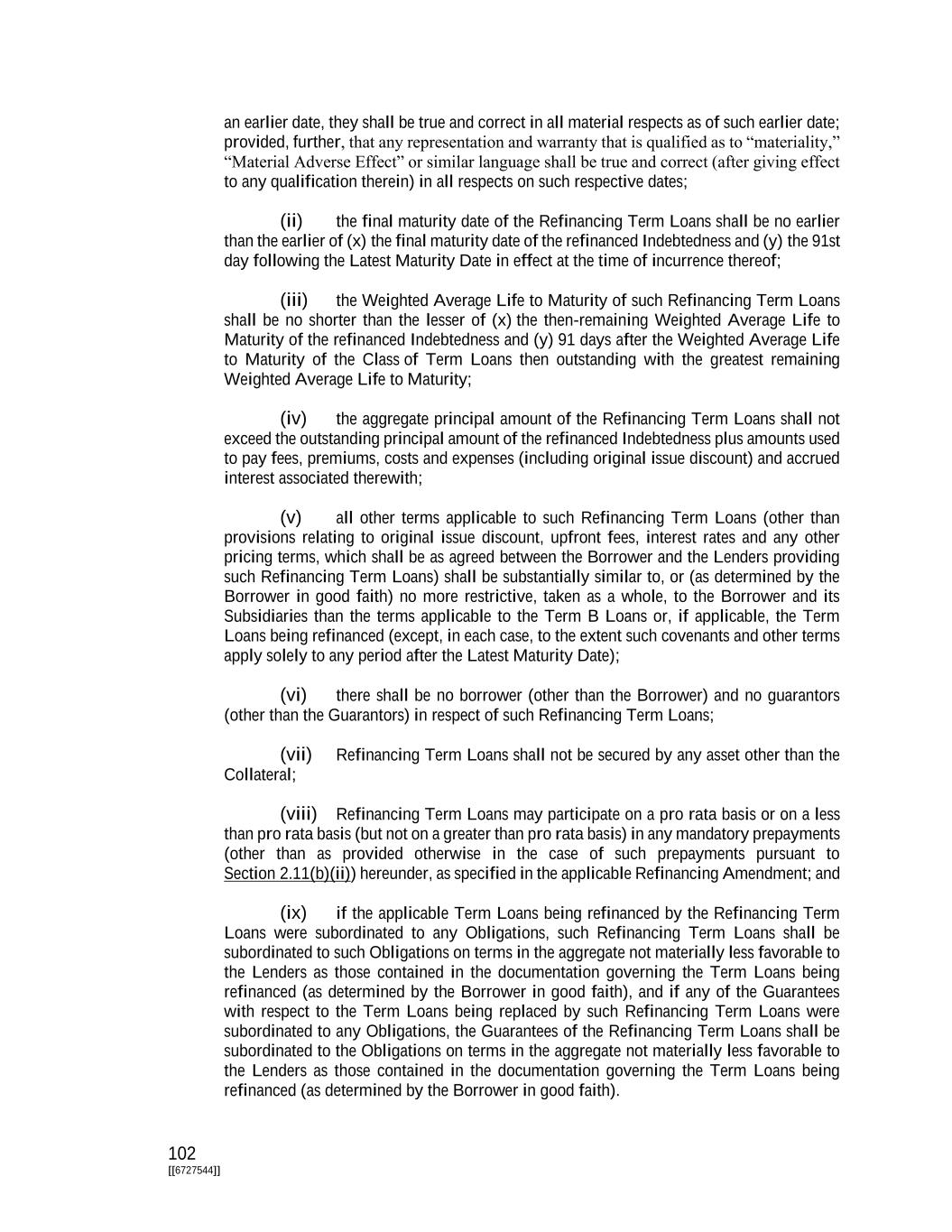 102 [[6727544]] an earlier date, they shall be true and correct in all material respects as of such earlier date; provided, further, that any representation and warranty that is qualified as to “materiality,” “Material Adverse Effect” or similar language shall be true and correct (after giving effect to any qualification therein) in all respects on such respective dates; (ii) the final maturity date of the Refinancing Term Loans shall be no earlier than the earlier of (x) the final maturity date of the refinanced Indebtedness and (y) the 91st day following the Latest Maturity Date in effect at the time of incurrence thereof; (iii) the Weighted Average Life to Maturity of such Refinancing Term Loans shall be no shorter than the lesser of (x) the then-remaining Weighted Average Life to Maturity of the refinanced Indebtedness and (y) 91 days after the Weighted Average Life to Maturity of the Class of Term Loans then outstanding with the greatest remaining Weighted Average Life to Maturity; (iv) the aggregate principal amount of the Refinancing Term Loans shall not exceed the outstanding principal amount of the refinanced Indebtedness plus amounts used to pay fees, premiums, costs and expenses (including original issue discount) and accrued interest associated therewith; (v) all other terms applicable to such Refinancing Term Loans (other than provisions relating to original issue discount, upfront fees, interest rates and any other pricing terms, which shall be as agreed between the Borrower and the Lenders providing such Refinancing Term Loans) shall be substantially similar to, or (as determined by the Borrower in good faith) no more restrictive, taken as a whole, to the Borrower and its Subsidiaries than the terms applicable to the Term B Loans or, if applicable, the Term Loans being refinanced (except, in each case, to the extent such covenants and other terms apply solely to any period after the Latest Maturity Date); (vi) there shall be no borrower (other than the Borrower) and no guarantors (other than the Guarantors) in respect of such Refinancing Term Loans; (vii) Refinancing Term Loans shall not be secured by any asset other than the Collateral; (viii) Refinancing Term Loans may participate on a pro rata basis or on a less than pro rata basis (but not on a greater than pro rata basis) in any mandatory prepayments (other than as provided otherwise in the case of such prepayments pursuant to Section 2.11(b)(ii)) hereunder, as specified in the applicable Refinancing Amendment; and (ix) if the applicable Term Loans being refinanced by the Refinancing Term Loans were subordinated to any Obligations, such Refinancing Term Loans shall be subordinated to such Obligations on terms in the aggregate not materially less favorable to the Lenders as those contained in the documentation governing the Term Loans being refinanced (as determined by the Borrower in good faith), and if any of the Guarantees with respect to the Term Loans being replaced by such Refinancing Term Loans were subordinated to any Obligations, the Guarantees of the Refinancing Term Loans shall be subordinated to the Obligations on terms in the aggregate not materially less favorable to the Lenders as those contained in the documentation governing the Term Loans being refinanced (as determined by the Borrower in good faith).