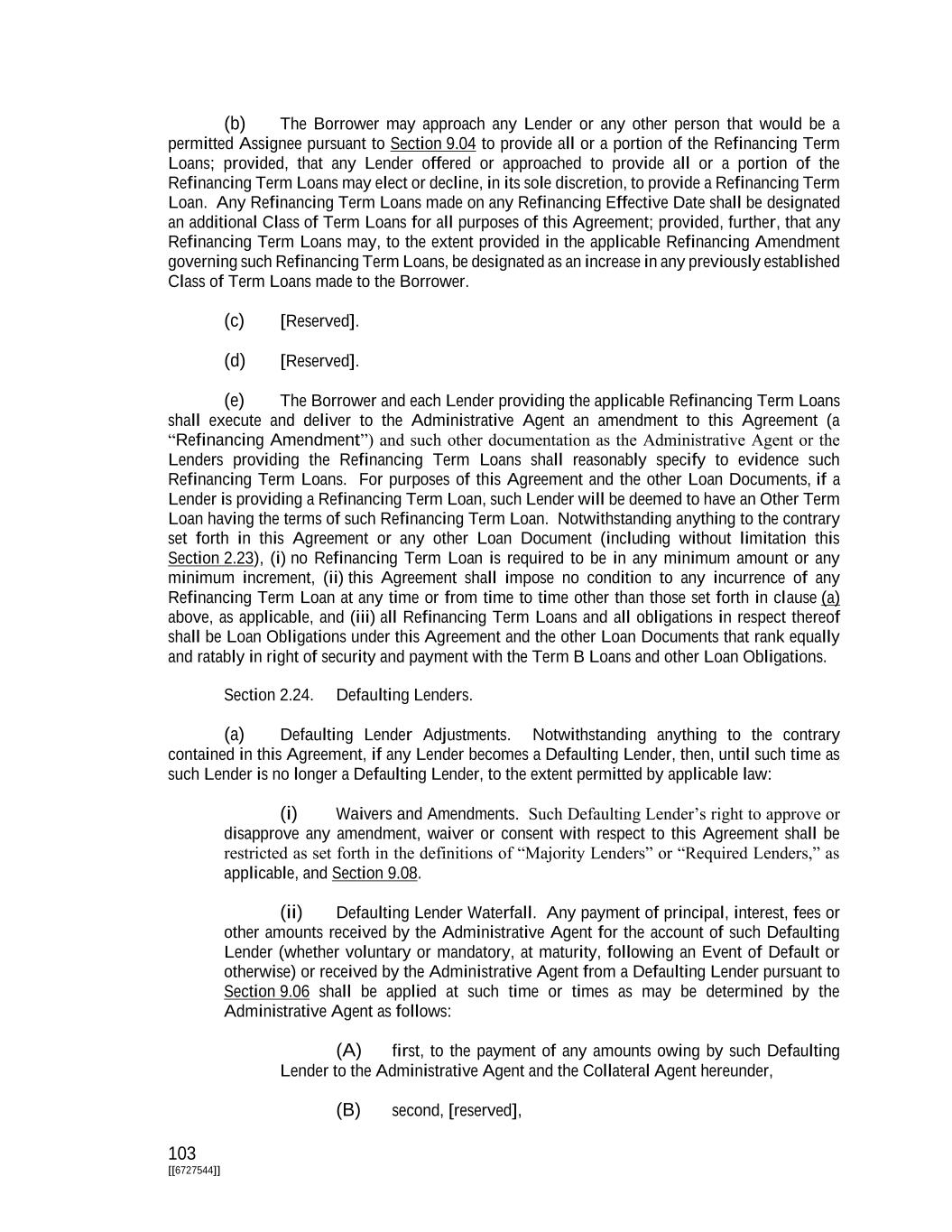 103 [[6727544]] (b) The Borrower may approach any Lender or any other person that would be a permitted Assignee pursuant to Section 9.04 to provide all or a portion of the Refinancing Term Loans; provided, that any Lender offered or approached to provide all or a portion of the Refinancing Term Loans may elect or decline, in its sole discretion, to provide a Refinancing Term Loan. Any Refinancing Term Loans made on any Refinancing Effective Date shall be designated an additional Class of Term Loans for all purposes of this Agreement; provided, further, that any Refinancing Term Loans may, to the extent provided in the applicable Refinancing Amendment governing such Refinancing Term Loans, be designated as an increase in any previously established Class of Term Loans made to the Borrower. (c) [Reserved]. (d) [Reserved]. (e) The Borrower and each Lender providing the applicable Refinancing Term Loans shall execute and deliver to the Administrative Agent an amendment to this Agreement (a “Refinancing Amendment”) and such other documentation as the Administrative Agent or the Lenders providing the Refinancing Term Loans shall reasonably specify to evidence such Refinancing Term Loans. For purposes of this Agreement and the other Loan Documents, if a Lender is providing a Refinancing Term Loan, such Lender will be deemed to have an Other Term Loan having the terms of such Refinancing Term Loan. Notwithstanding anything to the contrary set forth in this Agreement or any other Loan Document (including without limitation this Section 2.23), (i) no Refinancing Term Loan is required to be in any minimum amount or any minimum increment, (ii) this Agreement shall impose no condition to any incurrence of any Refinancing Term Loan at any time or from time to time other than those set forth in clause (a) above, as applicable, and (iii) all Refinancing Term Loans and all obligations in respect thereof shall be Loan Obligations under this Agreement and the other Loan Documents that rank equally and ratably in right of security and payment with the Term B Loans and other Loan Obligations. Section 2.24. Defaulting Lenders. (a) Defaulting Lender Adjustments. Notwithstanding anything to the contrary contained in this Agreement, if any Lender becomes a Defaulting Lender, then, until such time as such Lender is no longer a Defaulting Lender, to the extent permitted by applicable law: (i) Waivers and Amendments. Such Defaulting Lender’s right to approve or disapprove any amendment, waiver or consent with respect to this Agreement shall be restricted as set forth in the definitions of “Majority Lenders” or “Required Lenders,” as applicable, and Section 9.08. (ii) Defaulting Lender Waterfall. Any payment of principal, interest, fees or other amounts received by the Administrative Agent for the account of such Defaulting Lender (whether voluntary or mandatory, at maturity, following an Event of Default or otherwise) or received by the Administrative Agent from a Defaulting Lender pursuant to Section 9.06 shall be applied at such time or times as may be determined by the Administrative Agent as follows: (A) first, to the payment of any amounts owing by such Defaulting Lender to the Administrative Agent and the Collateral Agent hereunder, (B) second, [reserved],
