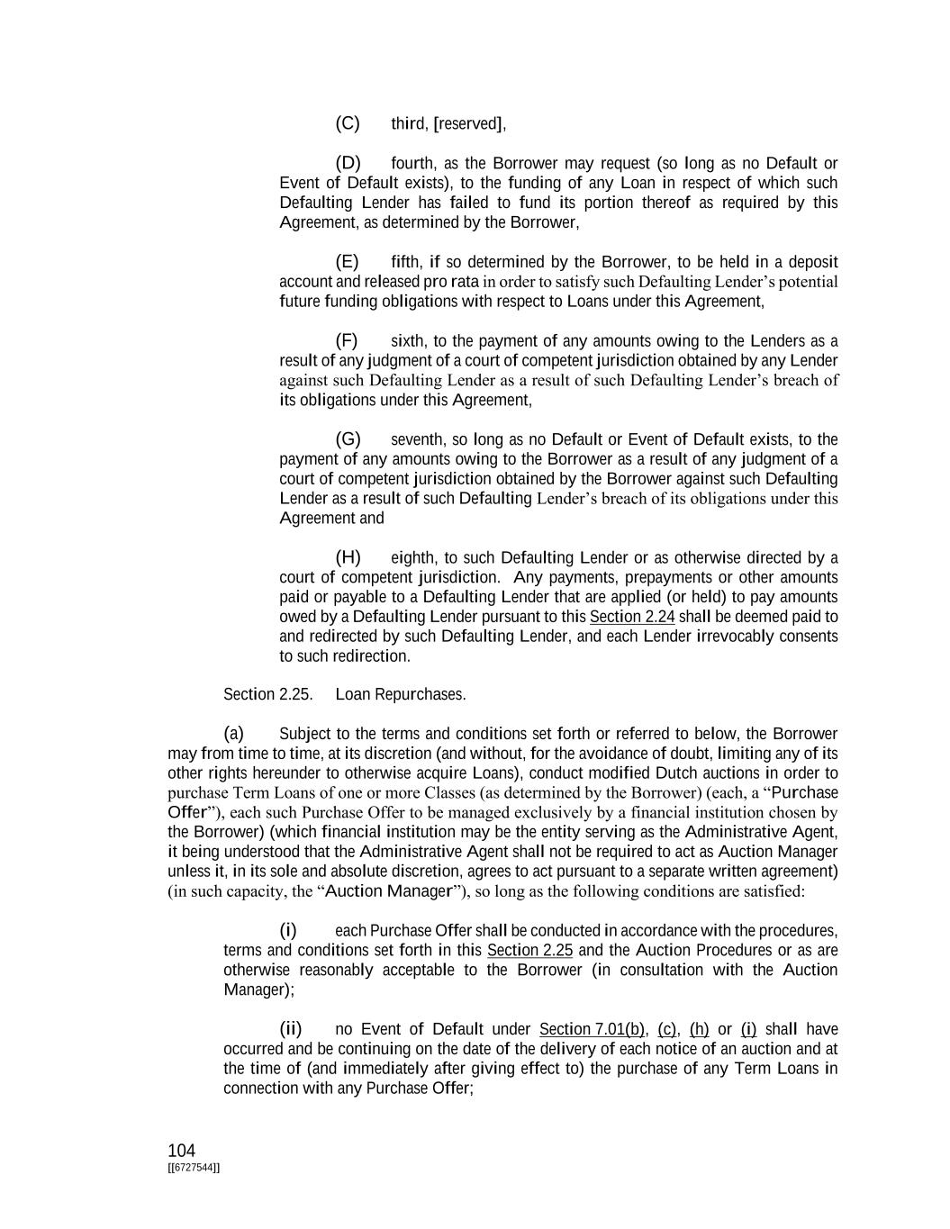 104 [[6727544]] (C) third, [reserved], (D) fourth, as the Borrower may request (so long as no Default or Event of Default exists), to the funding of any Loan in respect of which such Defaulting Lender has failed to fund its portion thereof as required by this Agreement, as determined by the Borrower, (E) fifth, if so determined by the Borrower, to be held in a deposit account and released pro rata in order to satisfy such Defaulting Lender’s potential future funding obligations with respect to Loans under this Agreement, (F) sixth, to the payment of any amounts owing to the Lenders as a result of any judgment of a court of competent jurisdiction obtained by any Lender against such Defaulting Lender as a result of such Defaulting Lender’s breach of its obligations under this Agreement, (G) seventh, so long as no Default or Event of Default exists, to the payment of any amounts owing to the Borrower as a result of any judgment of a court of competent jurisdiction obtained by the Borrower against such Defaulting Lender as a result of such Defaulting Lender’s breach of its obligations under this Agreement and (H) eighth, to such Defaulting Lender or as otherwise directed by a court of competent jurisdiction. Any payments, prepayments or other amounts paid or payable to a Defaulting Lender that are applied (or held) to pay amounts owed by a Defaulting Lender pursuant to this Section 2.24 shall be deemed paid to and redirected by such Defaulting Lender, and each Lender irrevocably consents to such redirection. Section 2.25. Loan Repurchases. (a) Subject to the terms and conditions set forth or referred to below, the Borrower may from time to time, at its discretion (and without, for the avoidance of doubt, limiting any of its other rights hereunder to otherwise acquire Loans), conduct modified Dutch auctions in order to purchase Term Loans of one or more Classes (as determined by the Borrower) (each, a “Purchase Offer”), each such Purchase Offer to be managed exclusively by a financial institution chosen by the Borrower) (which financial institution may be the entity serving as the Administrative Agent, it being understood that the Administrative Agent shall not be required to act as Auction Manager unless it, in its sole and absolute discretion, agrees to act pursuant to a separate written agreement) (in such capacity, the “Auction Manager”), so long as the following conditions are satisfied: (i) each Purchase Offer shall be conducted in accordance with the procedures, terms and conditions set forth in this Section 2.25 and the Auction Procedures or as are otherwise reasonably acceptable to the Borrower (in consultation with the Auction Manager); (ii) no Event of Default under Section 7.01(b), (c), (h) or (i) shall have occurred and be continuing on the date of the delivery of each notice of an auction and at the time of (and immediately after giving effect to) the purchase of any Term Loans in connection with any Purchase Offer;