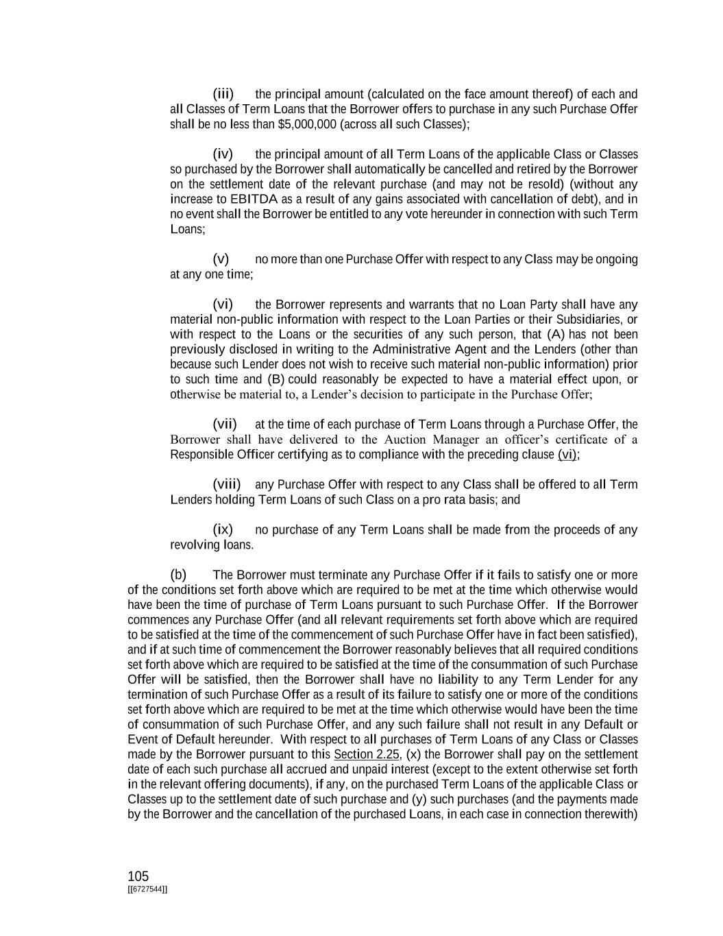 105 [[6727544]] (iii) the principal amount (calculated on the face amount thereof) of each and all Classes of Term Loans that the Borrower offers to purchase in any such Purchase Offer shall be no less than $5,000,000 (across all such Classes); (iv) the principal amount of all Term Loans of the applicable Class or Classes so purchased by the Borrower shall automatically be cancelled and retired by the Borrower on the settlement date of the relevant purchase (and may not be resold) (without any increase to EBITDA as a result of any gains associated with cancellation of debt), and in no event shall the Borrower be entitled to any vote hereunder in connection with such Term Loans; (v) no more than one Purchase Offer with respect to any Class may be ongoing at any one time; (vi) the Borrower represents and warrants that no Loan Party shall have any material non-public information with respect to the Loan Parties or their Subsidiaries, or with respect to the Loans or the securities of any such person, that (A) has not been previously disclosed in writing to the Administrative Agent and the Lenders (other than because such Lender does not wish to receive such material non-public information) prior to such time and (B) could reasonably be expected to have a material effect upon, or otherwise be material to, a Lender’s decision to participate in the Purchase Offer; (vii) at the time of each purchase of Term Loans through a Purchase Offer, the Borrower shall have delivered to the Auction Manager an officer’s certificate of a Responsible Officer certifying as to compliance with the preceding clause (vi); (viii) any Purchase Offer with respect to any Class shall be offered to all Term Lenders holding Term Loans of such Class on a pro rata basis; and (ix) no purchase of any Term Loans shall be made from the proceeds of any revolving loans. (b) The Borrower must terminate any Purchase Offer if it fails to satisfy one or more of the conditions set forth above which are required to be met at the time which otherwise would have been the time of purchase of Term Loans pursuant to such Purchase Offer. If the Borrower commences any Purchase Offer (and all relevant requirements set forth above which are required to be satisfied at the time of the commencement of such Purchase Offer have in fact been satisfied), and if at such time of commencement the Borrower reasonably believes that all required conditions set forth above which are required to be satisfied at the time of the consummation of such Purchase Offer will be satisfied, then the Borrower shall have no liability to any Term Lender for any termination of such Purchase Offer as a result of its failure to satisfy one or more of the conditions set forth above which are required to be met at the time which otherwise would have been the time of consummation of such Purchase Offer, and any such failure shall not result in any Default or Event of Default hereunder. With respect to all purchases of Term Loans of any Class or Classes made by the Borrower pursuant to this Section 2.25, (x) the Borrower shall pay on the settlement date of each such purchase all accrued and unpaid interest (except to the extent otherwise set forth in the relevant offering documents), if any, on the purchased Term Loans of the applicable Class or Classes up to the settlement date of such purchase and (y) such purchases (and the payments made by the Borrower and the cancellation of the purchased Loans, in each case in connection therewith)