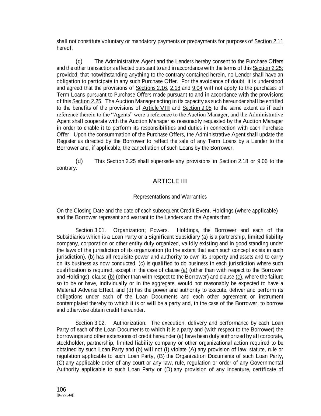 106 [[6727544]] shall not constitute voluntary or mandatory payments or prepayments for purposes of Section 2.11 hereof. (c) The Administrative Agent and the Lenders hereby consent to the Purchase Offers and the other transactions effected pursuant to and in accordance with the terms of this Section 2.25; provided, that notwithstanding anything to the contrary contained herein, no Lender shall have an obligation to participate in any such Purchase Offer. For the avoidance of doubt, it is understood and agreed that the provisions of Sections 2.16, 2.18 and 9.04 will not apply to the purchases of Term Loans pursuant to Purchase Offers made pursuant to and in accordance with the provisions of this Section 2.25. The Auction Manager acting in its capacity as such hereunder shall be entitled to the benefits of the provisions of Article VIII and Section 9.05 to the same extent as if each reference therein to the “Agents” were a reference to the Auction Manager, and the Administrative Agent shall cooperate with the Auction Manager as reasonably requested by the Auction Manager in order to enable it to perform its responsibilities and duties in connection with each Purchase Offer. Upon the consummation of the Purchase Offers, the Administrative Agent shall update the Register as directed by the Borrower to reflect the sale of any Term Loans by a Lender to the Borrower and, if applicable, the cancellation of such Loans by the Borrower. (d) This Section 2.25 shall supersede any provisions in Section 2.18 or 9.06 to the contrary. ARTICLE III Representations and Warranties On the Closing Date and the date of each subsequent Credit Event, Holdings (where applicable) and the Borrower represent and warrant to the Lenders and the Agents that: Section 3.01. Organization; Powers. Holdings, the Borrower and each of the Subsidiaries which is a Loan Party or a Significant Subsidiary (a) is a partnership, limited liability company, corporation or other entity duly organized, validly existing and in good standing under the laws of the jurisdiction of its organization (to the extent that each such concept exists in such jurisdiction), (b) has all requisite power and authority to own its property and assets and to carry on its business as now conducted, (c) is qualified to do business in each jurisdiction where such qualification is required, except in the case of clause (a) (other than with respect to the Borrower and Holdings), clause (b) (other than with respect to the Borrower) and clause (c), where the failure so to be or have, individually or in the aggregate, would not reasonably be expected to have a Material Adverse Effect, and (d) has the power and authority to execute, deliver and perform its obligations under each of the Loan Documents and each other agreement or instrument contemplated thereby to which it is or will be a party and, in the case of the Borrower, to borrow and otherwise obtain credit hereunder. Section 3.02. Authorization. The execution, delivery and performance by each Loan Party of each of the Loan Documents to which it is a party and (with respect to the Borrower) the borrowings and other extensions of credit hereunder (a) have been duly authorized by all corporate, stockholder, partnership, limited liability company or other organizational action required to be obtained by such Loan Party and (b) will not (i) violate (A) any provision of law, statute, rule or regulation applicable to such Loan Party, (B) the Organization Documents of such Loan Party, (C) any applicable order of any court or any law, rule, regulation or order of any Governmental Authority applicable to such Loan Party or (D) any provision of any indenture, certificate of