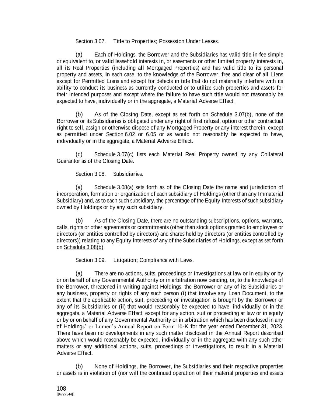 108 [[6727544]] Section 3.07. Title to Properties; Possession Under Leases. (a) Each of Holdings, the Borrower and the Subsidiaries has valid title in fee simple or equivalent to, or valid leasehold interests in, or easements or other limited property interests in, all its Real Properties (including all Mortgaged Properties) and has valid title to its personal property and assets, in each case, to the knowledge of the Borrower, free and clear of all Liens except for Permitted Liens and except for defects in title that do not materially interfere with its ability to conduct its business as currently conducted or to utilize such properties and assets for their intended purposes and except where the failure to have such title would not reasonably be expected to have, individually or in the aggregate, a Material Adverse Effect. (b) As of the Closing Date, except as set forth on Schedule 3.07(b), none of the Borrower or its Subsidiaries is obligated under any right of first refusal, option or other contractual right to sell, assign or otherwise dispose of any Mortgaged Property or any interest therein, except as permitted under Section 6.02 or 6.05 or as would not reasonably be expected to have, individually or in the aggregate, a Material Adverse Effect. (c) Schedule 3.07(c) lists each Material Real Property owned by any Collateral Guarantor as of the Closing Date. Section 3.08. Subsidiaries. (a) Schedule 3.08(a) sets forth as of the Closing Date the name and jurisdiction of incorporation, formation or organization of each subsidiary of Holdings (other than any Immaterial Subsidiary) and, as to each such subsidiary, the percentage of the Equity Interests of such subsidiary owned by Holdings or by any such subsidiary. (b) As of the Closing Date, there are no outstanding subscriptions, options, warrants, calls, rights or other agreements or commitments (other than stock options granted to employees or directors (or entities controlled by directors) and shares held by directors (or entities controlled by directors)) relating to any Equity Interests of any of the Subsidiaries of Holdings, except as set forth on Schedule 3.08(b). Section 3.09. Litigation; Compliance with Laws. (a) There are no actions, suits, proceedings or investigations at law or in equity or by or on behalf of any Governmental Authority or in arbitration now pending, or, to the knowledge of the Borrower, threatened in writing against Holdings, the Borrower or any of its Subsidiaries or any business, property or rights of any such person (i) that involve any Loan Document, to the extent that the applicable action, suit, proceeding or investigation is brought by the Borrower or any of its Subsidiaries or (ii) that would reasonably be expected to have, individually or in the aggregate, a Material Adverse Effect, except for any action, suit or proceeding at law or in equity or by or on behalf of any Governmental Authority or in arbitration which has been disclosed in any of Holdings’ or Lumen’s Annual Report on Form 10-K for the year ended December 31, 2023. There have been no developments in any such matter disclosed in the Annual Report described above which would reasonably be expected, individually or in the aggregate with any such other matters or any additional actions, suits, proceedings or investigations, to result in a Material Adverse Effect. (b) None of Holdings, the Borrower, the Subsidiaries and their respective properties or assets is in violation of (nor will the continued operation of their material properties and assets