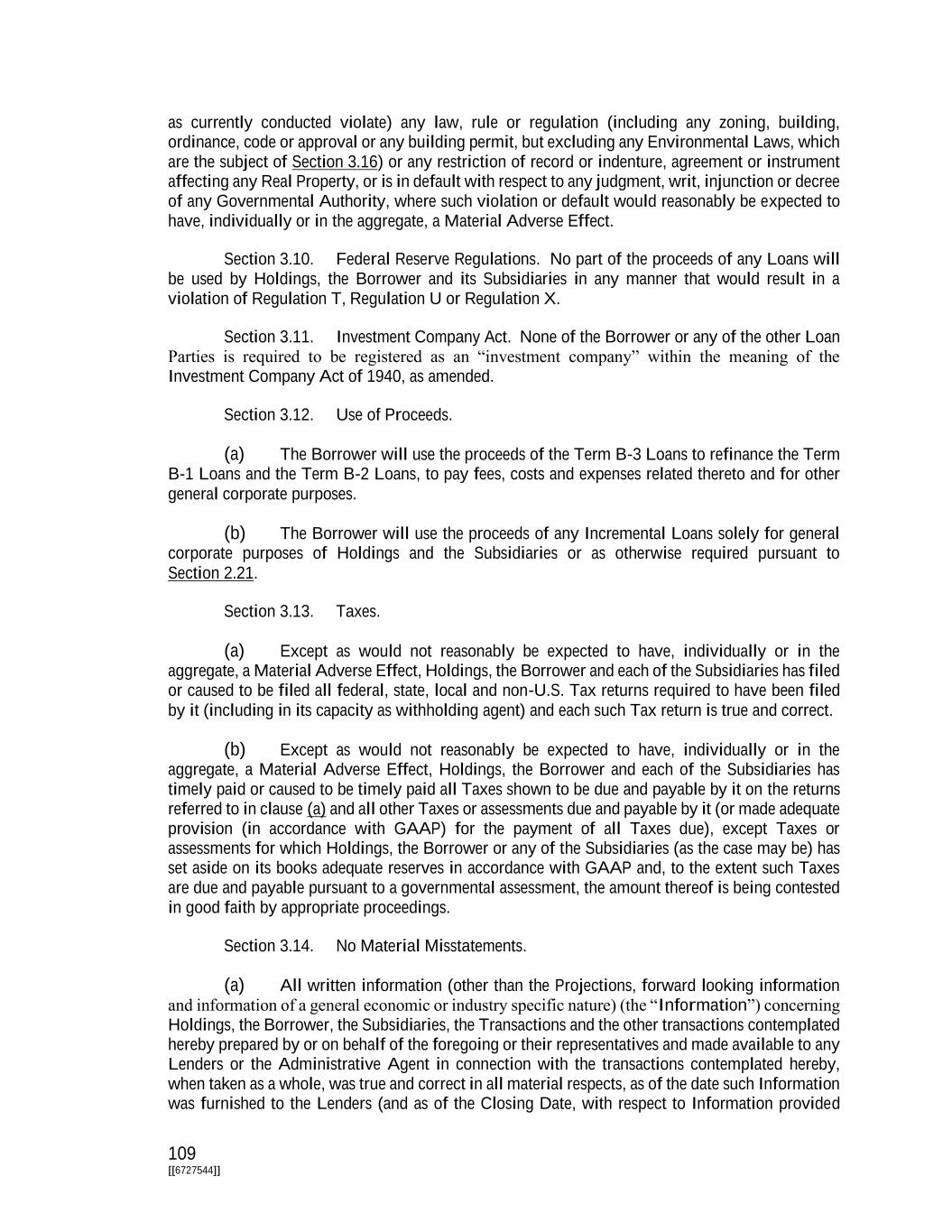 109 [[6727544]] as currently conducted violate) any law, rule or regulation (including any zoning, building, ordinance, code or approval or any building permit, but excluding any Environmental Laws, which are the subject of Section 3.16) or any restriction of record or indenture, agreement or instrument affecting any Real Property, or is in default with respect to any judgment, writ, injunction or decree of any Governmental Authority, where such violation or default would reasonably be expected to have, individually or in the aggregate, a Material Adverse Effect. Section 3.10. Federal Reserve Regulations. No part of the proceeds of any Loans will be used by Holdings, the Borrower and its Subsidiaries in any manner that would result in a violation of Regulation T, Regulation U or Regulation X. Section 3.11. Investment Company Act. None of the Borrower or any of the other Loan Parties is required to be registered as an “investment company” within the meaning of the Investment Company Act of 1940, as amended. Section 3.12. Use of Proceeds. (a) The Borrower will use the proceeds of the Term B-3 Loans to refinance the Term B-1 Loans and the Term B-2 Loans, to pay fees, costs and expenses related thereto and for other general corporate purposes. (b) The Borrower will use the proceeds of any Incremental Loans solely for general corporate purposes of Holdings and the Subsidiaries or as otherwise required pursuant to Section 2.21. Section 3.13. Taxes. (a) Except as would not reasonably be expected to have, individually or in the aggregate, a Material Adverse Effect, Holdings, the Borrower and each of the Subsidiaries has filed or caused to be filed all federal, state, local and non-U.S. Tax returns required to have been filed by it (including in its capacity as withholding agent) and each such Tax return is true and correct. (b) Except as would not reasonably be expected to have, individually or in the aggregate, a Material Adverse Effect, Holdings, the Borrower and each of the Subsidiaries has timely paid or caused to be timely paid all Taxes shown to be due and payable by it on the returns referred to in clause (a) and all other Taxes or assessments due and payable by it (or made adequate provision (in accordance with GAAP) for the payment of all Taxes due), except Taxes or assessments for which Holdings, the Borrower or any of the Subsidiaries (as the case may be) has set aside on its books adequate reserves in accordance with GAAP and, to the extent such Taxes are due and payable pursuant to a governmental assessment, the amount thereof is being contested in good faith by appropriate proceedings. Section 3.14. No Material Misstatements. (a) All written information (other than the Projections, forward looking information and information of a general economic or industry specific nature) (the “Information”) concerning Holdings, the Borrower, the Subsidiaries, the Transactions and the other transactions contemplated hereby prepared by or on behalf of the foregoing or their representatives and made available to any Lenders or the Administrative Agent in connection with the transactions contemplated hereby, when taken as a whole, was true and correct in all material respects, as of the date such Information was furnished to the Lenders (and as of the Closing Date, with respect to Information provided