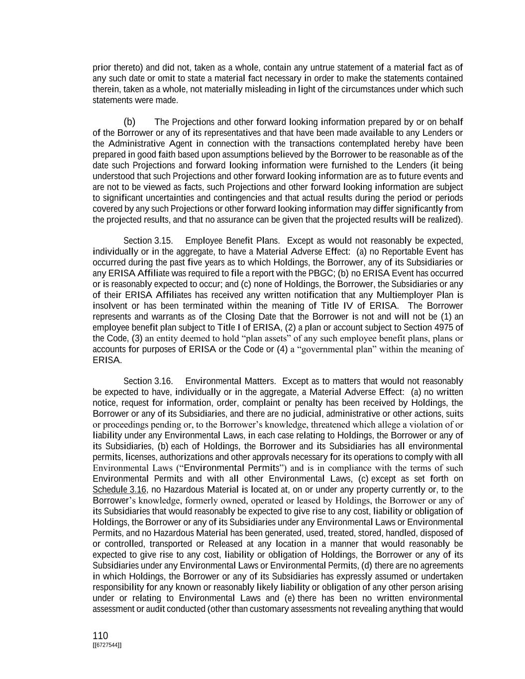 110 [[6727544]] prior thereto) and did not, taken as a whole, contain any untrue statement of a material fact as of any such date or omit to state a material fact necessary in order to make the statements contained therein, taken as a whole, not materially misleading in light of the circumstances under which such statements were made. (b) The Projections and other forward looking information prepared by or on behalf of the Borrower or any of its representatives and that have been made available to any Lenders or the Administrative Agent in connection with the transactions contemplated hereby have been prepared in good faith based upon assumptions believed by the Borrower to be reasonable as of the date such Projections and forward looking information were furnished to the Lenders (it being understood that such Projections and other forward looking information are as to future events and are not to be viewed as facts, such Projections and other forward looking information are subject to significant uncertainties and contingencies and that actual results during the period or periods covered by any such Projections or other forward looking information may differ significantly from the projected results, and that no assurance can be given that the projected results will be realized). Section 3.15. Employee Benefit Plans. Except as would not reasonably be expected, individually or in the aggregate, to have a Material Adverse Effect: (a) no Reportable Event has occurred during the past five years as to which Holdings, the Borrower, any of its Subsidiaries or any ERISA Affiliate was required to file a report with the PBGC; (b) no ERISA Event has occurred or is reasonably expected to occur; and (c) none of Holdings, the Borrower, the Subsidiaries or any of their ERISA Affiliates has received any written notification that any Multiemployer Plan is insolvent or has been terminated within the meaning of Title IV of ERISA. The Borrower represents and warrants as of the Closing Date that the Borrower is not and will not be (1) an employee benefit plan subject to Title I of ERISA, (2) a plan or account subject to Section 4975 of the Code, (3) an entity deemed to hold “plan assets” of any such employee benefit plans, plans or accounts for purposes of ERISA or the Code or (4) a “governmental plan” within the meaning of ERISA. Section 3.16. Environmental Matters. Except as to matters that would not reasonably be expected to have, individually or in the aggregate, a Material Adverse Effect: (a) no written notice, request for information, order, complaint or penalty has been received by Holdings, the Borrower or any of its Subsidiaries, and there are no judicial, administrative or other actions, suits or proceedings pending or, to the Borrower’s knowledge, threatened which allege a violation of or liability under any Environmental Laws, in each case relating to Holdings, the Borrower or any of its Subsidiaries, (b) each of Holdings, the Borrower and its Subsidiaries has all environmental permits, licenses, authorizations and other approvals necessary for its operations to comply with all Environmental Laws (“Environmental Permits”) and is in compliance with the terms of such Environmental Permits and with all other Environmental Laws, (c) except as set forth on Schedule 3.16, no Hazardous Material is located at, on or under any property currently or, to the Borrower’s knowledge, formerly owned, operated or leased by Holdings, the Borrower or any of its Subsidiaries that would reasonably be expected to give rise to any cost, liability or obligation of Holdings, the Borrower or any of its Subsidiaries under any Environmental Laws or Environmental Permits, and no Hazardous Material has been generated, used, treated, stored, handled, disposed of or controlled, transported or Released at any location in a manner that would reasonably be expected to give rise to any cost, liability or obligation of Holdings, the Borrower or any of its Subsidiaries under any Environmental Laws or Environmental Permits, (d) there are no agreements in which Holdings, the Borrower or any of its Subsidiaries has expressly assumed or undertaken responsibility for any known or reasonably likely liability or obligation of any other person arising under or relating to Environmental Laws and (e) there has been no written environmental assessment or audit conducted (other than customary assessments not revealing anything that would