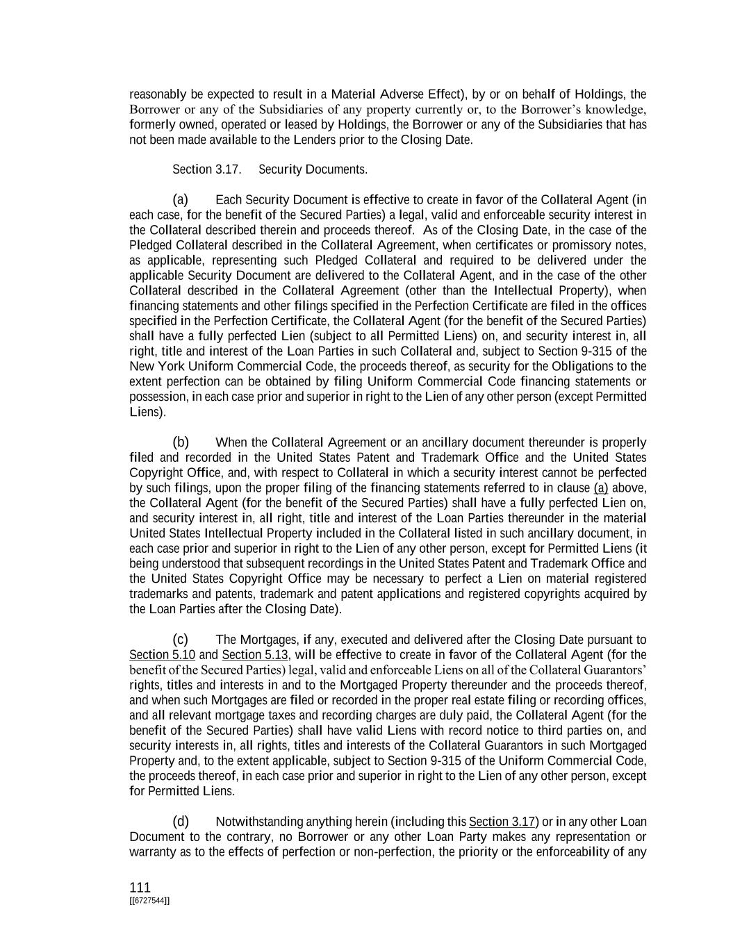 111 [[6727544]] reasonably be expected to result in a Material Adverse Effect), by or on behalf of Holdings, the Borrower or any of the Subsidiaries of any property currently or, to the Borrower’s knowledge, formerly owned, operated or leased by Holdings, the Borrower or any of the Subsidiaries that has not been made available to the Lenders prior to the Closing Date. Section 3.17. Security Documents. (a) Each Security Document is effective to create in favor of the Collateral Agent (in each case, for the benefit of the Secured Parties) a legal, valid and enforceable security interest in the Collateral described therein and proceeds thereof. As of the Closing Date, in the case of the Pledged Collateral described in the Collateral Agreement, when certificates or promissory notes, as applicable, representing such Pledged Collateral and required to be delivered under the applicable Security Document are delivered to the Collateral Agent, and in the case of the other Collateral described in the Collateral Agreement (other than the Intellectual Property), when financing statements and other filings specified in the Perfection Certificate are filed in the offices specified in the Perfection Certificate, the Collateral Agent (for the benefit of the Secured Parties) shall have a fully perfected Lien (subject to all Permitted Liens) on, and security interest in, all right, title and interest of the Loan Parties in such Collateral and, subject to Section 9-315 of the New York Uniform Commercial Code, the proceeds thereof, as security for the Obligations to the extent perfection can be obtained by filing Uniform Commercial Code financing statements or possession, in each case prior and superior in right to the Lien of any other person (except Permitted Liens). (b) When the Collateral Agreement or an ancillary document thereunder is properly filed and recorded in the United States Patent and Trademark Office and the United States Copyright Office, and, with respect to Collateral in which a security interest cannot be perfected by such filings, upon the proper filing of the financing statements referred to in clause (a) above, the Collateral Agent (for the benefit of the Secured Parties) shall have a fully perfected Lien on, and security interest in, all right, title and interest of the Loan Parties thereunder in the material United States Intellectual Property included in the Collateral listed in such ancillary document, in each case prior and superior in right to the Lien of any other person, except for Permitted Liens (it being understood that subsequent recordings in the United States Patent and Trademark Office and the United States Copyright Office may be necessary to perfect a Lien on material registered trademarks and patents, trademark and patent applications and registered copyrights acquired by the Loan Parties after the Closing Date). (c) The Mortgages, if any, executed and delivered after the Closing Date pursuant to Section 5.10 and Section 5.13, will be effective to create in favor of the Collateral Agent (for the benefit of the Secured Parties) legal, valid and enforceable Liens on all of the Collateral Guarantors’ rights, titles and interests in and to the Mortgaged Property thereunder and the proceeds thereof, and when such Mortgages are filed or recorded in the proper real estate filing or recording offices, and all relevant mortgage taxes and recording charges are duly paid, the Collateral Agent (for the benefit of the Secured Parties) shall have valid Liens with record notice to third parties on, and security interests in, all rights, titles and interests of the Collateral Guarantors in such Mortgaged Property and, to the extent applicable, subject to Section 9-315 of the Uniform Commercial Code, the proceeds thereof, in each case prior and superior in right to the Lien of any other person, except for Permitted Liens. (d) Notwithstanding anything herein (including this Section 3.17) or in any other Loan Document to the contrary, no Borrower or any other Loan Party makes any representation or warranty as to the effects of perfection or non-perfection, the priority or the enforceability of any