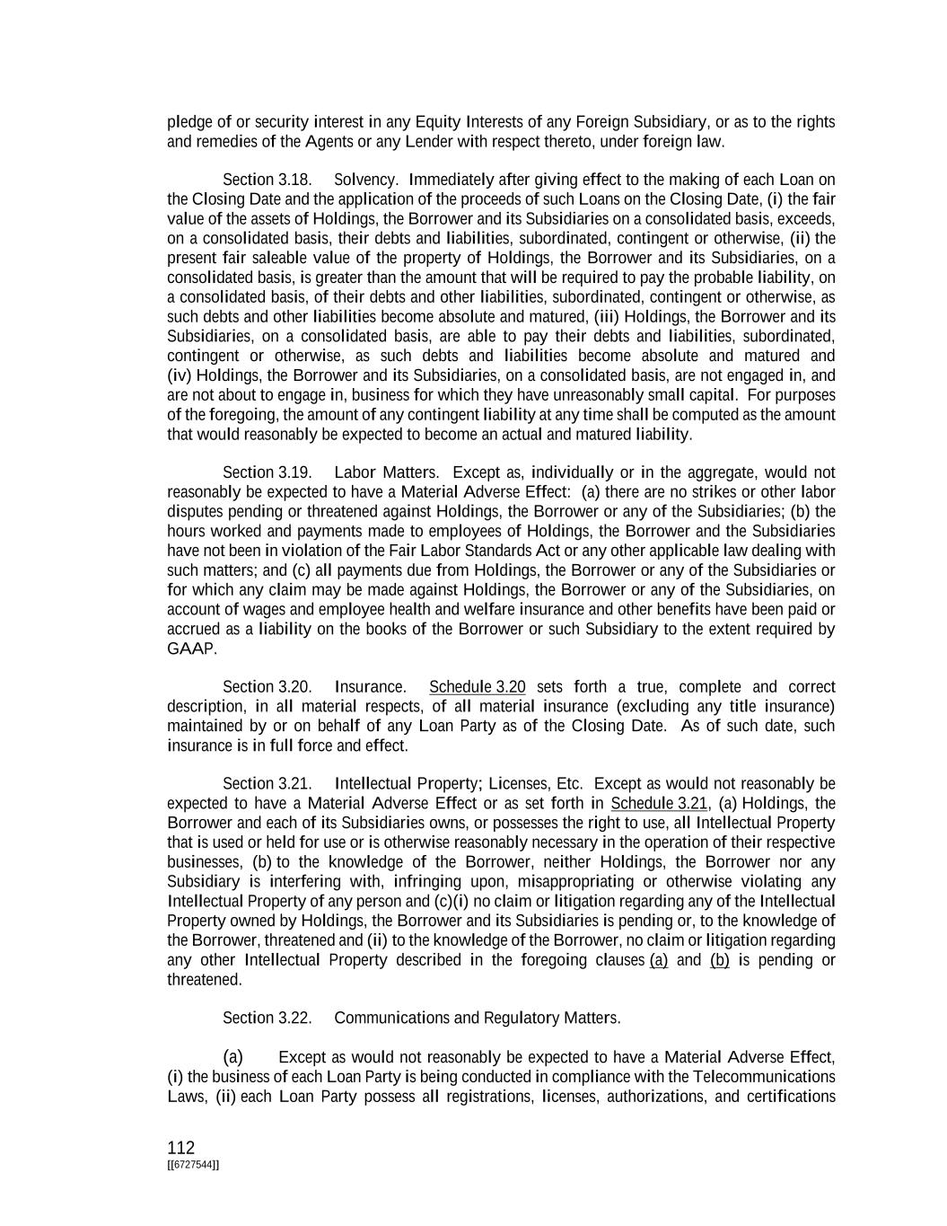 112 [[6727544]] pledge of or security interest in any Equity Interests of any Foreign Subsidiary, or as to the rights and remedies of the Agents or any Lender with respect thereto, under foreign law. Section 3.18. Solvency. Immediately after giving effect to the making of each Loan on the Closing Date and the application of the proceeds of such Loans on the Closing Date, (i) the fair value of the assets of Holdings, the Borrower and its Subsidiaries on a consolidated basis, exceeds, on a consolidated basis, their debts and liabilities, subordinated, contingent or otherwise, (ii) the present fair saleable value of the property of Holdings, the Borrower and its Subsidiaries, on a consolidated basis, is greater than the amount that will be required to pay the probable liability, on a consolidated basis, of their debts and other liabilities, subordinated, contingent or otherwise, as such debts and other liabilities become absolute and matured, (iii) Holdings, the Borrower and its Subsidiaries, on a consolidated basis, are able to pay their debts and liabilities, subordinated, contingent or otherwise, as such debts and liabilities become absolute and matured and (iv) Holdings, the Borrower and its Subsidiaries, on a consolidated basis, are not engaged in, and are not about to engage in, business for which they have unreasonably small capital. For purposes of the foregoing, the amount of any contingent liability at any time shall be computed as the amount that would reasonably be expected to become an actual and matured liability. Section 3.19. Labor Matters. Except as, individually or in the aggregate, would not reasonably be expected to have a Material Adverse Effect: (a) there are no strikes or other labor disputes pending or threatened against Holdings, the Borrower or any of the Subsidiaries; (b) the hours worked and payments made to employees of Holdings, the Borrower and the Subsidiaries have not been in violation of the Fair Labor Standards Act or any other applicable law dealing with such matters; and (c) all payments due from Holdings, the Borrower or any of the Subsidiaries or for which any claim may be made against Holdings, the Borrower or any of the Subsidiaries, on account of wages and employee health and welfare insurance and other benefits have been paid or accrued as a liability on the books of the Borrower or such Subsidiary to the extent required by GAAP. Section 3.20. Insurance. Schedule 3.20 sets forth a true, complete and correct description, in all material respects, of all material insurance (excluding any title insurance) maintained by or on behalf of any Loan Party as of the Closing Date. As of such date, such insurance is in full force and effect. Section 3.21. Intellectual Property; Licenses, Etc. Except as would not reasonably be expected to have a Material Adverse Effect or as set forth in Schedule 3.21, (a) Holdings, the Borrower and each of its Subsidiaries owns, or possesses the right to use, all Intellectual Property that is used or held for use or is otherwise reasonably necessary in the operation of their respective businesses, (b) to the knowledge of the Borrower, neither Holdings, the Borrower nor any Subsidiary is interfering with, infringing upon, misappropriating or otherwise violating any Intellectual Property of any person and (c)(i) no claim or litigation regarding any of the Intellectual Property owned by Holdings, the Borrower and its Subsidiaries is pending or, to the knowledge of the Borrower, threatened and (ii) to the knowledge of the Borrower, no claim or litigation regarding any other Intellectual Property described in the foregoing clauses (a) and (b) is pending or threatened. Section 3.22. Communications and Regulatory Matters. (a) Except as would not reasonably be expected to have a Material Adverse Effect, (i) the business of each Loan Party is being conducted in compliance with the Telecommunications Laws, (ii) each Loan Party possess all registrations, licenses, authorizations, and certifications