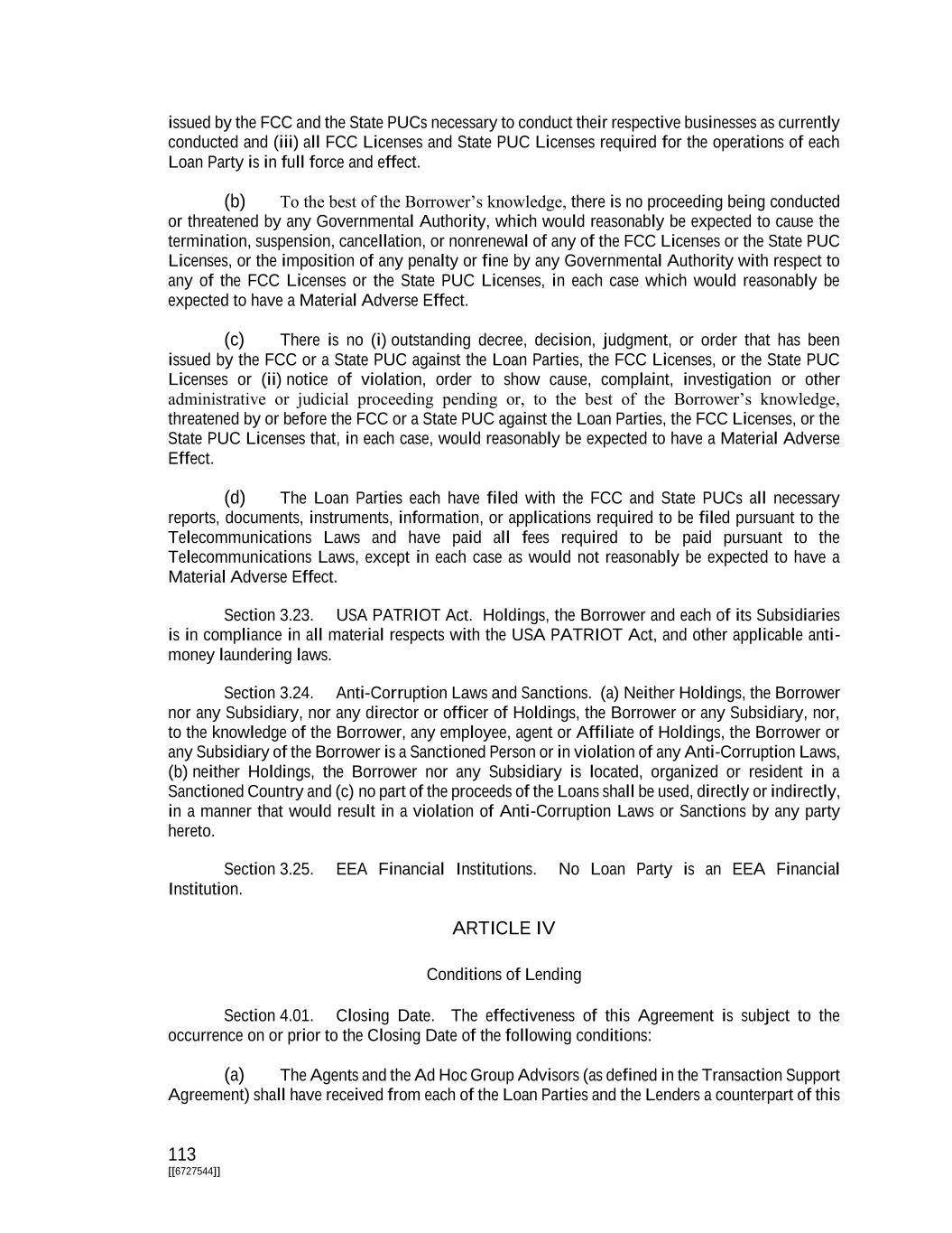 113 [[6727544]] issued by the FCC and the State PUCs necessary to conduct their respective businesses as currently conducted and (iii) all FCC Licenses and State PUC Licenses required for the operations of each Loan Party is in full force and effect. (b) To the best of the Borrower’s knowledge, there is no proceeding being conducted or threatened by any Governmental Authority, which would reasonably be expected to cause the termination, suspension, cancellation, or nonrenewal of any of the FCC Licenses or the State PUC Licenses, or the imposition of any penalty or fine by any Governmental Authority with respect to any of the FCC Licenses or the State PUC Licenses, in each case which would reasonably be expected to have a Material Adverse Effect. (c) There is no (i) outstanding decree, decision, judgment, or order that has been issued by the FCC or a State PUC against the Loan Parties, the FCC Licenses, or the State PUC Licenses or (ii) notice of violation, order to show cause, complaint, investigation or other administrative or judicial proceeding pending or, to the best of the Borrower’s knowledge, threatened by or before the FCC or a State PUC against the Loan Parties, the FCC Licenses, or the State PUC Licenses that, in each case, would reasonably be expected to have a Material Adverse Effect. (d) The Loan Parties each have filed with the FCC and State PUCs all necessary reports, documents, instruments, information, or applications required to be filed pursuant to the Telecommunications Laws and have paid all fees required to be paid pursuant to the Telecommunications Laws, except in each case as would not reasonably be expected to have a Material Adverse Effect. Section 3.23. USA PATRIOT Act. Holdings, the Borrower and each of its Subsidiaries is in compliance in all material respects with the USA PATRIOT Act, and other applicable anti- money laundering laws. Section 3.24. Anti-Corruption Laws and Sanctions. (a) Neither Holdings, the Borrower nor any Subsidiary, nor any director or officer of Holdings, the Borrower or any Subsidiary, nor, to the knowledge of the Borrower, any employee, agent or Affiliate of Holdings, the Borrower or any Subsidiary of the Borrower is a Sanctioned Person or in violation of any Anti-Corruption Laws, (b) neither Holdings, the Borrower nor any Subsidiary is located, organized or resident in a Sanctioned Country and (c) no part of the proceeds of the Loans shall be used, directly or indirectly, in a manner that would result in a violation of Anti-Corruption Laws or Sanctions by any party hereto. Section 3.25. EEA Financial Institutions. No Loan Party is an EEA Financial Institution. ARTICLE IV Conditions of Lending Section 4.01. Closing Date. The effectiveness of this Agreement is subject to the occurrence on or prior to the Closing Date of the following conditions: (a) The Agents and the Ad Hoc Group Advisors (as defined in the Transaction Support Agreement) shall have received from each of the Loan Parties and the Lenders a counterpart of this
