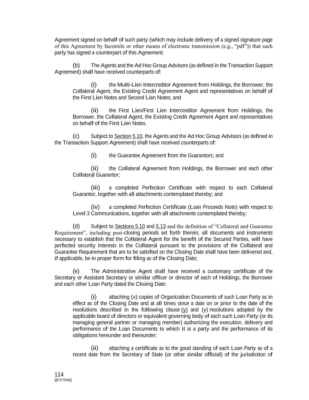 114 [[6727544]] Agreement signed on behalf of such party (which may include delivery of a signed signature page of this Agreement by facsimile or other means of electronic transmission (e.g., “pdf”)) that such party has signed a counterpart of this Agreement. (b) The Agents and the Ad Hoc Group Advisors (as defined in the Transaction Support Agreement) shall have received counterparts of: (i) the Multi-Lien Intercreditor Agreement from Holdings, the Borrower, the Collateral Agent, the Existing Credit Agreement Agent and representatives on behalf of the First Lien Notes and Second Lien Notes; and (ii) the First Lien/First Lien Intercreditor Agreement from Holdings, the Borrower, the Collateral Agent, the Existing Credit Agreement Agent and representatives on behalf of the First Lien Notes. (c) Subject to Section 5.10, the Agents and the Ad Hoc Group Advisors (as defined in the Transaction Support Agreement) shall have received counterparts of: (i) the Guarantee Agreement from the Guarantors; and (ii) the Collateral Agreement from Holdings, the Borrower and each other Collateral Guarantor; (iii) a completed Perfection Certificate with respect to each Collateral Guarantor, together with all attachments contemplated thereby; and (iv) a completed Perfection Certificate (Loan Proceeds Note) with respect to Level 3 Communications, together with all attachments contemplated thereby; (d) Subject to Sections 5.10 and 5.13 and the definition of “Collateral and Guarantee Requirement”, including post-closing periods set forth therein, all documents and instruments necessary to establish that the Collateral Agent for the benefit of the Secured Parties, will have perfected security interests in the Collateral pursuant to the provisions of the Collateral and Guarantee Requirement that are to be satisfied on the Closing Date shall have been delivered and, if applicable, be in proper form for filing as of the Closing Date; (e) The Administrative Agent shall have received a customary certificate of the Secretary or Assistant Secretary or similar officer or director of each of Holdings, the Borrower and each other Loan Party dated the Closing Date: (i) attaching (x) copies of Organization Documents of such Loan Party as in effect as of the Closing Date and at all times since a date on or prior to the date of the resolutions described in the following clause (y) and (y) resolutions adopted by the applicable board of directors or equivalent governing body of each such Loan Party (or its managing general partner or managing member) authorizing the execution, delivery and performance of the Loan Documents to which it is a party and the performance of its obligations hereunder and thereunder; (ii) attaching a certificate as to the good standing of each Loan Party as of a recent date from the Secretary of State (or other similar official) of the jurisdiction of