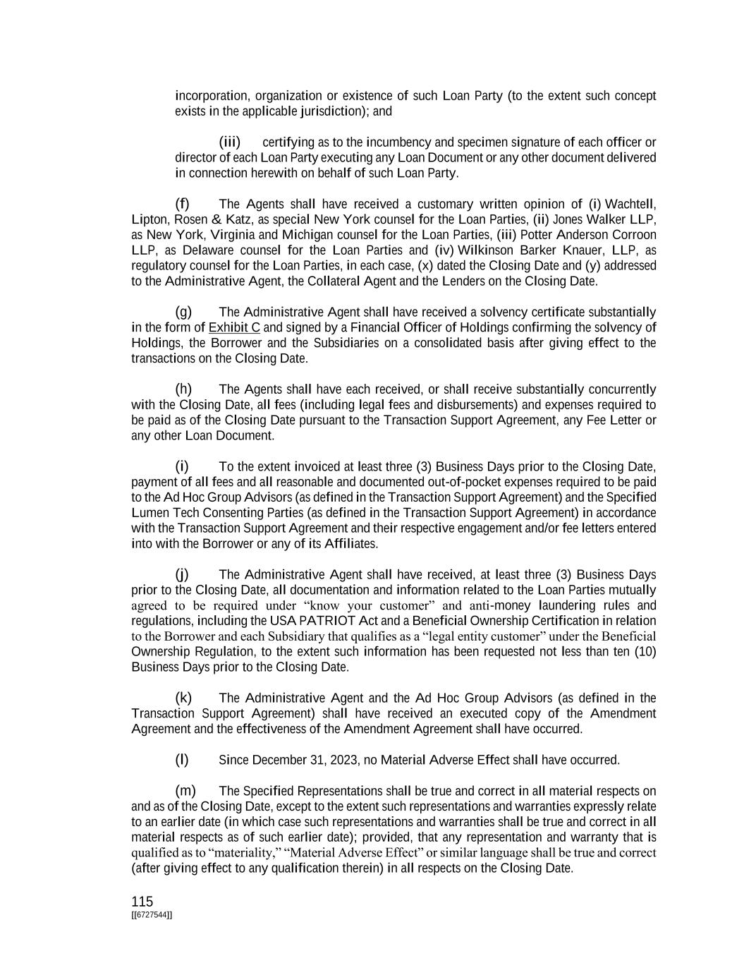 115 [[6727544]] incorporation, organization or existence of such Loan Party (to the extent such concept exists in the applicable jurisdiction); and (iii) certifying as to the incumbency and specimen signature of each officer or director of each Loan Party executing any Loan Document or any other document delivered in connection herewith on behalf of such Loan Party. (f) The Agents shall have received a customary written opinion of (i) Wachtell, Lipton, Rosen & Katz, as special New York counsel for the Loan Parties, (ii) Jones Walker LLP, as New York, Virginia and Michigan counsel for the Loan Parties, (iii) Potter Anderson Corroon LLP, as Delaware counsel for the Loan Parties and (iv) Wilkinson Barker Knauer, LLP, as regulatory counsel for the Loan Parties, in each case, (x) dated the Closing Date and (y) addressed to the Administrative Agent, the Collateral Agent and the Lenders on the Closing Date. (g) The Administrative Agent shall have received a solvency certificate substantially in the form of Exhibit C and signed by a Financial Officer of Holdings confirming the solvency of Holdings, the Borrower and the Subsidiaries on a consolidated basis after giving effect to the transactions on the Closing Date. (h) The Agents shall have each received, or shall receive substantially concurrently with the Closing Date, all fees (including legal fees and disbursements) and expenses required to be paid as of the Closing Date pursuant to the Transaction Support Agreement, any Fee Letter or any other Loan Document. (i) To the extent invoiced at least three (3) Business Days prior to the Closing Date, payment of all fees and all reasonable and documented out-of-pocket expenses required to be paid to the Ad Hoc Group Advisors (as defined in the Transaction Support Agreement) and the Specified Lumen Tech Consenting Parties (as defined in the Transaction Support Agreement) in accordance with the Transaction Support Agreement and their respective engagement and/or fee letters entered into with the Borrower or any of its Affiliates. (j) The Administrative Agent shall have received, at least three (3) Business Days prior to the Closing Date, all documentation and information related to the Loan Parties mutually agreed to be required under “know your customer” and anti-money laundering rules and regulations, including the USA PATRIOT Act and a Beneficial Ownership Certification in relation to the Borrower and each Subsidiary that qualifies as a “legal entity customer” under the Beneficial Ownership Regulation, to the extent such information has been requested not less than ten (10) Business Days prior to the Closing Date. (k) The Administrative Agent and the Ad Hoc Group Advisors (as defined in the Transaction Support Agreement) shall have received an executed copy of the Amendment Agreement and the effectiveness of the Amendment Agreement shall have occurred. (l) Since December 31, 2023, no Material Adverse Effect shall have occurred. (m) The Specified Representations shall be true and correct in all material respects on and as of the Closing Date, except to the extent such representations and warranties expressly relate to an earlier date (in which case such representations and warranties shall be true and correct in all material respects as of such earlier date); provided, that any representation and warranty that is qualified as to “materiality,” “Material Adverse Effect” or similar language shall be true and correct (after giving effect to any qualification therein) in all respects on the Closing Date.