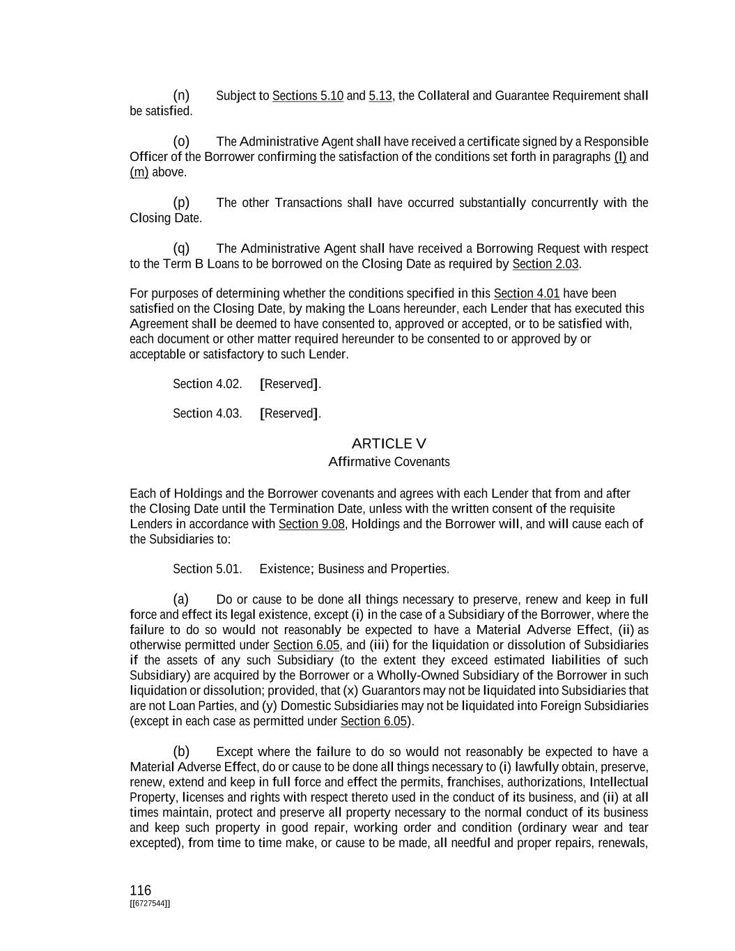 116 [[6727544]] (n) Subject to Sections 5.10 and 5.13, the Collateral and Guarantee Requirement shall be satisfied. (o) The Administrative Agent shall have received a certificate signed by a Responsible Officer of the Borrower confirming the satisfaction of the conditions set forth in paragraphs (l) and (m) above. (p) The other Transactions shall have occurred substantially concurrently with the Closing Date. (q) The Administrative Agent shall have received a Borrowing Request with respect to the Term B Loans to be borrowed on the Closing Date as required by Section 2.03. For purposes of determining whether the conditions specified in this Section 4.01 have been satisfied on the Closing Date, by making the Loans hereunder, each Lender that has executed this Agreement shall be deemed to have consented to, approved or accepted, or to be satisfied with, each document or other matter required hereunder to be consented to or approved by or acceptable or satisfactory to such Lender. Section 4.02. [Reserved]. Section 4.03. [Reserved]. ARTICLE V Affirmative Covenants Each of Holdings and the Borrower covenants and agrees with each Lender that from and after the Closing Date until the Termination Date, unless with the written consent of the requisite Lenders in accordance with Section 9.08, Holdings and the Borrower will, and will cause each of the Subsidiaries to: Section 5.01. Existence; Business and Properties. (a) Do or cause to be done all things necessary to preserve, renew and keep in full force and effect its legal existence, except (i) in the case of a Subsidiary of the Borrower, where the failure to do so would not reasonably be expected to have a Material Adverse Effect, (ii) as otherwise permitted under Section 6.05, and (iii) for the liquidation or dissolution of Subsidiaries if the assets of any such Subsidiary (to the extent they exceed estimated liabilities of such Subsidiary) are acquired by the Borrower or a Wholly-Owned Subsidiary of the Borrower in such liquidation or dissolution; provided, that (x) Guarantors may not be liquidated into Subsidiaries that are not Loan Parties, and (y) Domestic Subsidiaries may not be liquidated into Foreign Subsidiaries (except in each case as permitted under Section 6.05). (b) Except where the failure to do so would not reasonably be expected to have a Material Adverse Effect, do or cause to be done all things necessary to (i) lawfully obtain, preserve, renew, extend and keep in full force and effect the permits, franchises, authorizations, Intellectual Property, licenses and rights with respect thereto used in the conduct of its business, and (ii) at all times maintain, protect and preserve all property necessary to the normal conduct of its business and keep such property in good repair, working order and condition (ordinary wear and tear excepted), from time to time make, or cause to be made, all needful and proper repairs, renewals,