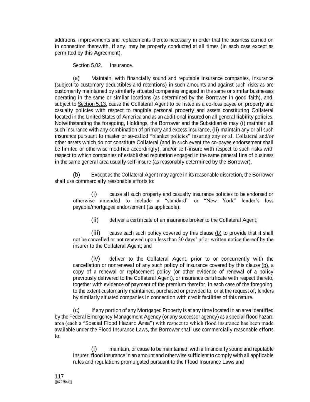 117 [[6727544]] additions, improvements and replacements thereto necessary in order that the business carried on in connection therewith, if any, may be properly conducted at all times (in each case except as permitted by this Agreement). Section 5.02. Insurance. (a) Maintain, with financially sound and reputable insurance companies, insurance (subject to customary deductibles and retentions) in such amounts and against such risks as are customarily maintained by similarly situated companies engaged in the same or similar businesses operating in the same or similar locations (as determined by the Borrower in good faith), and, subject to Section 5.13, cause the Collateral Agent to be listed as a co-loss payee on property and casualty policies with respect to tangible personal property and assets constituting Collateral located in the United States of America and as an additional insured on all general liability policies. Notwithstanding the foregoing, Holdings, the Borrower and the Subsidiaries may (i) maintain all such insurance with any combination of primary and excess insurance, (ii) maintain any or all such insurance pursuant to master or so-called “blanket policies” insuring any or all Collateral and/or other assets which do not constitute Collateral (and in such event the co-payee endorsement shall be limited or otherwise modified accordingly), and/or self-insure with respect to such risks with respect to which companies of established reputation engaged in the same general line of business in the same general area usually self-insure (as reasonably determined by the Borrower). (b) Except as the Collateral Agent may agree in its reasonable discretion, the Borrower shall use commercially reasonable efforts to: (i) cause all such property and casualty insurance policies to be endorsed or otherwise amended to include a “standard” or “New York” lender’s loss payable/mortgagee endorsement (as applicable); (ii) deliver a certificate of an insurance broker to the Collateral Agent; (iii) cause each such policy covered by this clause (b) to provide that it shall not be cancelled or not renewed upon less than 30 days’ prior written notice thereof by the insurer to the Collateral Agent; and (iv) deliver to the Collateral Agent, prior to or concurrently with the cancellation or nonrenewal of any such policy of insurance covered by this clause (b), a copy of a renewal or replacement policy (or other evidence of renewal of a policy previously delivered to the Collateral Agent), or insurance certificate with respect thereto, together with evidence of payment of the premium therefor, in each case of the foregoing, to the extent customarily maintained, purchased or provided to, or at the request of, lenders by similarly situated companies in connection with credit facilities of this nature. (c) If any portion of any Mortgaged Property is at any time located in an area identified by the Federal Emergency Management Agency (or any successor agency) as a special flood hazard area (each a “Special Flood Hazard Area”) with respect to which flood insurance has been made available under the Flood Insurance Laws, the Borrower shall use commercially reasonable efforts to: (i) maintain, or cause to be maintained, with a financially sound and reputable insurer, flood insurance in an amount and otherwise sufficient to comply with all applicable rules and regulations promulgated pursuant to the Flood Insurance Laws and