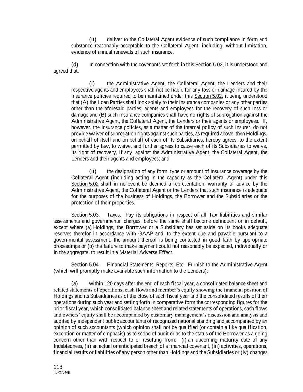 118 [[6727544]] (ii) deliver to the Collateral Agent evidence of such compliance in form and substance reasonably acceptable to the Collateral Agent, including, without limitation, evidence of annual renewals of such insurance. (d) In connection with the covenants set forth in this Section 5.02, it is understood and agreed that: (i) the Administrative Agent, the Collateral Agent, the Lenders and their respective agents and employees shall not be liable for any loss or damage insured by the insurance policies required to be maintained under this Section 5.02, it being understood that (A) the Loan Parties shall look solely to their insurance companies or any other parties other than the aforesaid parties, agents and employees for the recovery of such loss or damage and (B) such insurance companies shall have no rights of subrogation against the Administrative Agent, the Collateral Agent, the Lenders or their agents or employees. If, however, the insurance policies, as a matter of the internal policy of such insurer, do not provide waiver of subrogation rights against such parties, as required above, then Holdings, on behalf of itself and on behalf of each of its Subsidiaries, hereby agrees, to the extent permitted by law, to waive, and further agrees to cause each of its Subsidiaries to waive, its right of recovery, if any, against the Administrative Agent, the Collateral Agent, the Lenders and their agents and employees; and (ii) the designation of any form, type or amount of insurance coverage by the Collateral Agent (including acting in the capacity as the Collateral Agent) under this Section 5.02 shall in no event be deemed a representation, warranty or advice by the Administrative Agent, the Collateral Agent or the Lenders that such insurance is adequate for the purposes of the business of Holdings, the Borrower and the Subsidiaries or the protection of their properties. Section 5.03. Taxes. Pay its obligations in respect of all Tax liabilities and similar assessments and governmental charges, before the same shall become delinquent or in default, except where (a) Holdings, the Borrower or a Subsidiary has set aside on its books adequate reserves therefor in accordance with GAAP and, to the extent due and payable pursuant to a governmental assessment, the amount thereof is being contested in good faith by appropriate proceedings or (b) the failure to make payment could not reasonably be expected, individually or in the aggregate, to result in a Material Adverse Effect. Section 5.04. Financial Statements, Reports, Etc. Furnish to the Administrative Agent (which will promptly make available such information to the Lenders): (a) within 120 days after the end of each fiscal year, a consolidated balance sheet and related statements of operations, cash flows and member’s equity showing the financial position of Holdings and its Subsidiaries as of the close of such fiscal year and the consolidated results of their operations during such year and setting forth in comparative form the corresponding figures for the prior fiscal year, which consolidated balance sheet and related statements of operations, cash flows and owners’ equity shall be accompanied by customary management’s discussion and analysis and audited by independent public accountants of recognized national standing and accompanied by an opinion of such accountants (which opinion shall not be qualified (or contain a like qualification, exception or matter of emphasis) as to scope of audit or as to the status of the Borrower as a going concern other than with respect to or resulting from: (i) an upcoming maturity date of any Indebtedness, (ii) an actual or anticipated breach of a financial covenant, (iii) activities, operations, financial results or liabilities of any person other than Holdings and the Subsidiaries or (iv) changes
