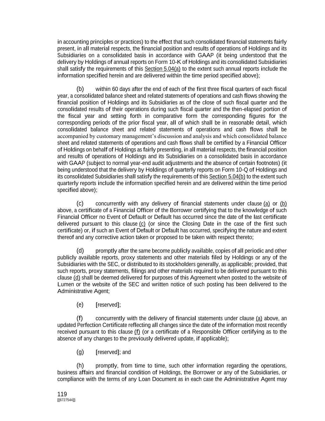 119 [[6727544]] in accounting principles or practices) to the effect that such consolidated financial statements fairly present, in all material respects, the financial position and results of operations of Holdings and its Subsidiaries on a consolidated basis in accordance with GAAP (it being understood that the delivery by Holdings of annual reports on Form 10-K of Holdings and its consolidated Subsidiaries shall satisfy the requirements of this Section 5.04(a) to the extent such annual reports include the information specified herein and are delivered within the time period specified above); (b) within 60 days after the end of each of the first three fiscal quarters of each fiscal year, a consolidated balance sheet and related statements of operations and cash flows showing the financial position of Holdings and its Subsidiaries as of the close of such fiscal quarter and the consolidated results of their operations during such fiscal quarter and the then-elapsed portion of the fiscal year and setting forth in comparative form the corresponding figures for the corresponding periods of the prior fiscal year, all of which shall be in reasonable detail, which consolidated balance sheet and related statements of operations and cash flows shall be accompanied by customary management’s discussion and analysis and which consolidated balance sheet and related statements of operations and cash flows shall be certified by a Financial Officer of Holdings on behalf of Holdings as fairly presenting, in all material respects, the financial position and results of operations of Holdings and its Subsidiaries on a consolidated basis in accordance with GAAP (subject to normal year-end audit adjustments and the absence of certain footnotes) (it being understood that the delivery by Holdings of quarterly reports on Form 10-Q of Holdings and its consolidated Subsidiaries shall satisfy the requirements of this Section 5.04(b) to the extent such quarterly reports include the information specified herein and are delivered within the time period specified above); (c) concurrently with any delivery of financial statements under clause (a) or (b) above, a certificate of a Financial Officer of the Borrower certifying that to the knowledge of such Financial Officer no Event of Default or Default has occurred since the date of the last certificate delivered pursuant to this clause (c) (or since the Closing Date in the case of the first such certificate) or, if such an Event of Default or Default has occurred, specifying the nature and extent thereof and any corrective action taken or proposed to be taken with respect thereto; (d) promptly after the same become publicly available, copies of all periodic and other publicly available reports, proxy statements and other materials filed by Holdings or any of the Subsidiaries with the SEC, or distributed to its stockholders generally, as applicable; provided, that such reports, proxy statements, filings and other materials required to be delivered pursuant to this clause (d) shall be deemed delivered for purposes of this Agreement when posted to the website of Lumen or the website of the SEC and written notice of such posting has been delivered to the Administrative Agent; (e) [reserved]; (f) concurrently with the delivery of financial statements under clause (a) above, an updated Perfection Certificate reflecting all changes since the date of the information most recently received pursuant to this clause (f) (or a certificate of a Responsible Officer certifying as to the absence of any changes to the previously delivered update, if applicable); (g) [reserved]; and (h) promptly, from time to time, such other information regarding the operations, business affairs and financial condition of Holdings, the Borrower or any of the Subsidiaries, or compliance with the terms of any Loan Document as in each case the Administrative Agent may