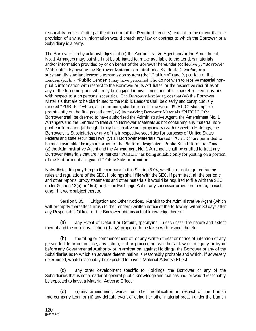 120 [[6727544]] reasonably request (acting at the direction of the Required Lenders), except to the extent that the provision of any such information would breach any law or contract to which the Borrower or a Subsidiary is a party. The Borrower hereby acknowledges that (x) the Administrative Agent and/or the Amendment No. 1 Arrangers may, but shall not be obligated to, make available to the Lenders materials and/or information provided by or on behalf of the Borrower hereunder (collectively, “Borrower Materials”) by posting the Borrower Materials on IntraLinks, Syndtrak, ClearPar, or a substantially similar electronic transmission system (the “Platform”) and (y) certain of the Lenders (each, a “Public Lender”) may have personnel who do not wish to receive material non- public information with respect to the Borrower or its Affiliates, or the respective securities of any of the foregoing, and who may be engaged in investment and other market-related activities with respect to such persons’ securities. The Borrower hereby agrees that (w) the Borrower Materials that are to be distributed to the Public Lenders shall be clearly and conspicuously marked “PUBLIC” which, at a minimum, shall mean that the word “PUBLIC” shall appear prominently on the first page thereof, (x) by marking Borrower Materials “PUBLIC,” the Borrower shall be deemed to have authorized the Administrative Agent, the Amendment No. 1 Arrangers and the Lenders to treat such Borrower Materials as not containing any material non- public information (although it may be sensitive and proprietary) with respect to Holdings, the Borrower, its Subsidiaries or any of their respective securities for purposes of United States Federal and state securities laws, (y) all Borrower Materials marked “PUBLIC” are permitted to be made available through a portion of the Platform designated “Public Side Information” and (z) the Administrative Agent and the Amendment No. 1 Arrangers shall be entitled to treat any Borrower Materials that are not marked “PUBLIC” as being suitable only for posting on a portion of the Platform not designated “Public Side Information.” Notwithstanding anything to the contrary in this Section 5.04, whether or not required by the rules and regulations of the SEC, Holdings shall file with the SEC, if permitted, all the periodic and other reports, proxy statements and other materials it would be required to file with the SEC under Section 13(a) or 15(d) under the Exchange Act or any successor provision thereto, in each case, if it were subject thereto. Section 5.05. Litigation and Other Notices. Furnish to the Administrative Agent (which will promptly thereafter furnish to the Lenders) written notice of the following within 30 days after any Responsible Officer of the Borrower obtains actual knowledge thereof: (a) any Event of Default or Default, specifying, in each case, the nature and extent thereof and the corrective action (if any) proposed to be taken with respect thereto; (b) the filing or commencement of, or any written threat or notice of intention of any person to file or commence, any action, suit or proceeding, whether at law or in equity or by or before any Governmental Authority or in arbitration, against Holdings, the Borrower or any of the Subsidiaries as to which an adverse determination is reasonably probable and which, if adversely determined, would reasonably be expected to have a Material Adverse Effect; (c) any other development specific to Holdings, the Borrower or any of the Subsidiaries that is not a matter of general public knowledge and that has had, or would reasonably be expected to have, a Material Adverse Effect; (d) (i) any amendment, waiver or other modification in respect of the Lumen Intercompany Loan or (ii) any default, event of default or other material breach under the Lumen