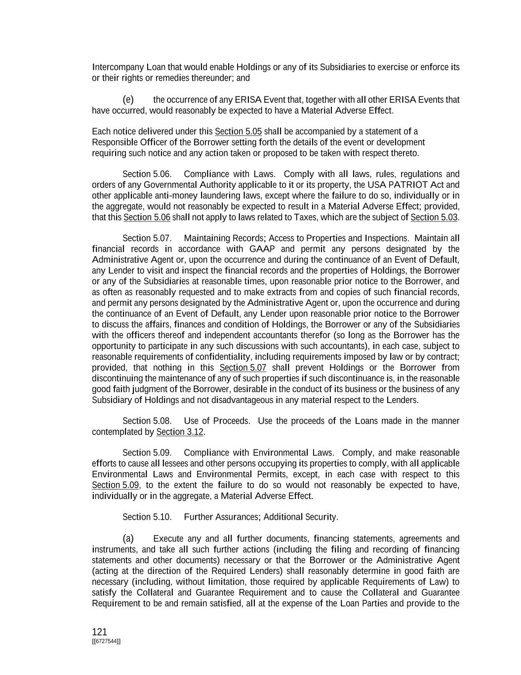 121 [[6727544]] Intercompany Loan that would enable Holdings or any of its Subsidiaries to exercise or enforce its or their rights or remedies thereunder; and (e) the occurrence of any ERISA Event that, together with all other ERISA Events that have occurred, would reasonably be expected to have a Material Adverse Effect. Each notice delivered under this Section 5.05 shall be accompanied by a statement of a Responsible Officer of the Borrower setting forth the details of the event or development requiring such notice and any action taken or proposed to be taken with respect thereto. Section 5.06. Compliance with Laws. Comply with all laws, rules, regulations and orders of any Governmental Authority applicable to it or its property, the USA PATRIOT Act and other applicable anti-money laundering laws, except where the failure to do so, individually or in the aggregate, would not reasonably be expected to result in a Material Adverse Effect; provided, that this Section 5.06 shall not apply to laws related to Taxes, which are the subject of Section 5.03. Section 5.07. Maintaining Records; Access to Properties and Inspections. Maintain all financial records in accordance with GAAP and permit any persons designated by the Administrative Agent or, upon the occurrence and during the continuance of an Event of Default, any Lender to visit and inspect the financial records and the properties of Holdings, the Borrower or any of the Subsidiaries at reasonable times, upon reasonable prior notice to the Borrower, and as often as reasonably requested and to make extracts from and copies of such financial records, and permit any persons designated by the Administrative Agent or, upon the occurrence and during the continuance of an Event of Default, any Lender upon reasonable prior notice to the Borrower to discuss the affairs, finances and condition of Holdings, the Borrower or any of the Subsidiaries with the officers thereof and independent accountants therefor (so long as the Borrower has the opportunity to participate in any such discussions with such accountants), in each case, subject to reasonable requirements of confidentiality, including requirements imposed by law or by contract; provided, that nothing in this Section 5.07 shall prevent Holdings or the Borrower from discontinuing the maintenance of any of such properties if such discontinuance is, in the reasonable good faith judgment of the Borrower, desirable in the conduct of its business or the business of any Subsidiary of Holdings and not disadvantageous in any material respect to the Lenders. Section 5.08. Use of Proceeds. Use the proceeds of the Loans made in the manner contemplated by Section 3.12. Section 5.09. Compliance with Environmental Laws. Comply, and make reasonable efforts to cause all lessees and other persons occupying its properties to comply, with all applicable Environmental Laws and Environmental Permits, except, in each case with respect to this Section 5.09, to the extent the failure to do so would not reasonably be expected to have, individually or in the aggregate, a Material Adverse Effect. Section 5.10. Further Assurances; Additional Security. (a) Execute any and all further documents, financing statements, agreements and instruments, and take all such further actions (including the filing and recording of financing statements and other documents) necessary or that the Borrower or the Administrative Agent (acting at the direction of the Required Lenders) shall reasonably determine in good faith are necessary (including, without limitation, those required by applicable Requirements of Law) to satisfy the Collateral and Guarantee Requirement and to cause the Collateral and Guarantee Requirement to be and remain satisfied, all at the expense of the Loan Parties and provide to the