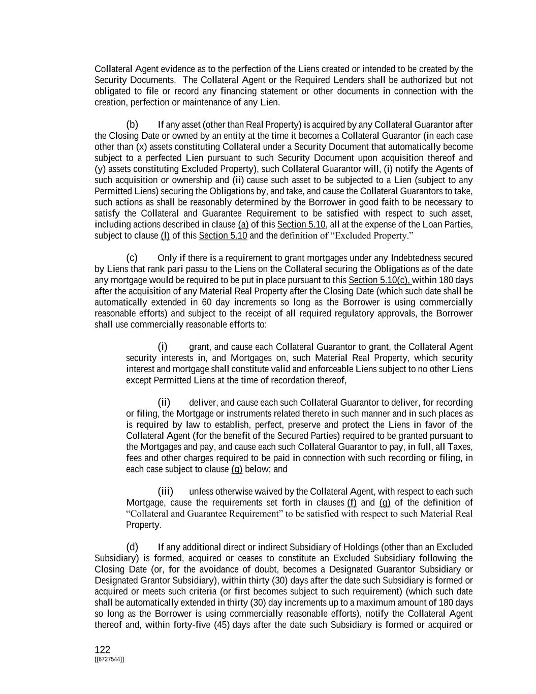 122 [[6727544]] Collateral Agent evidence as to the perfection of the Liens created or intended to be created by the Security Documents. The Collateral Agent or the Required Lenders shall be authorized but not obligated to file or record any financing statement or other documents in connection with the creation, perfection or maintenance of any Lien. (b) If any asset (other than Real Property) is acquired by any Collateral Guarantor after the Closing Date or owned by an entity at the time it becomes a Collateral Guarantor (in each case other than (x) assets constituting Collateral under a Security Document that automatically become subject to a perfected Lien pursuant to such Security Document upon acquisition thereof and (y) assets constituting Excluded Property), such Collateral Guarantor will, (i) notify the Agents of such acquisition or ownership and (ii) cause such asset to be subjected to a Lien (subject to any Permitted Liens) securing the Obligations by, and take, and cause the Collateral Guarantors to take, such actions as shall be reasonably determined by the Borrower in good faith to be necessary to satisfy the Collateral and Guarantee Requirement to be satisfied with respect to such asset, including actions described in clause (a) of this Section 5.10, all at the expense of the Loan Parties, subject to clause (l) of this Section 5.10 and the definition of “Excluded Property.” (c) Only if there is a requirement to grant mortgages under any Indebtedness secured by Liens that rank pari passu to the Liens on the Collateral securing the Obligations as of the date any mortgage would be required to be put in place pursuant to this Section 5.10(c), within 180 days after the acquisition of any Material Real Property after the Closing Date (which such date shall be automatically extended in 60 day increments so long as the Borrower is using commercially reasonable efforts) and subject to the receipt of all required regulatory approvals, the Borrower shall use commercially reasonable efforts to: (i) grant, and cause each Collateral Guarantor to grant, the Collateral Agent security interests in, and Mortgages on, such Material Real Property, which security interest and mortgage shall constitute valid and enforceable Liens subject to no other Liens except Permitted Liens at the time of recordation thereof, (ii) deliver, and cause each such Collateral Guarantor to deliver, for recording or filing, the Mortgage or instruments related thereto in such manner and in such places as is required by law to establish, perfect, preserve and protect the Liens in favor of the Collateral Agent (for the benefit of the Secured Parties) required to be granted pursuant to the Mortgages and pay, and cause each such Collateral Guarantor to pay, in full, all Taxes, fees and other charges required to be paid in connection with such recording or filing, in each case subject to clause (g) below; and (iii) unless otherwise waived by the Collateral Agent, with respect to each such Mortgage, cause the requirements set forth in clauses (f) and (g) of the definition of “Collateral and Guarantee Requirement” to be satisfied with respect to such Material Real Property. (d) If any additional direct or indirect Subsidiary of Holdings (other than an Excluded Subsidiary) is formed, acquired or ceases to constitute an Excluded Subsidiary following the Closing Date (or, for the avoidance of doubt, becomes a Designated Guarantor Subsidiary or Designated Grantor Subsidiary), within thirty (30) days after the date such Subsidiary is formed or acquired or meets such criteria (or first becomes subject to such requirement) (which such date shall be automatically extended in thirty (30) day increments up to a maximum amount of 180 days so long as the Borrower is using commercially reasonable efforts), notify the Collateral Agent thereof and, within forty-five (45) days after the date such Subsidiary is formed or acquired or