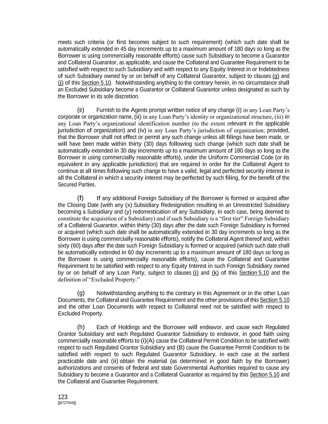 123 [[6727544]] meets such criteria (or first becomes subject to such requirement) (which such date shall be automatically extended in 45 day increments up to a maximum amount of 180 days so long as the Borrower is using commercially reasonable efforts) cause such Subsidiary to become a Guarantor and Collateral Guarantor, as applicable, and cause the Collateral and Guarantee Requirement to be satisfied with respect to such Subsidiary and with respect to any Equity Interest in or Indebtedness of such Subsidiary owned by or on behalf of any Collateral Guarantor, subject to clauses (g) and (j) of this Section 5.10. Notwithstanding anything to the contrary herein, in no circumstance shall an Excluded Subsidiary become a Guarantor or Collateral Guarantor unless designated as such by the Borrower in its sole discretion. (e) Furnish to the Agents prompt written notice of any change (i) in any Loan Party’s corporate or organization name, (ii) in any Loan Party’s identity or organizational structure, (iii) in any Loan Party’s organizational identification number (to the extent relevant in the applicable jurisdiction of organization) and (iv) in any Loan Party’s jurisdiction of organization; provided, that the Borrower shall not effect or permit any such change unless all filings have been made, or will have been made within thirty (30) days following such change (which such date shall be automatically extended in 30 day increments up to a maximum amount of 180 days so long as the Borrower is using commercially reasonable efforts), under the Uniform Commercial Code (or its equivalent in any applicable jurisdiction) that are required in order for the Collateral Agent to continue at all times following such change to have a valid, legal and perfected security interest in all the Collateral in which a security interest may be perfected by such filing, for the benefit of the Secured Parties. (f) If any additional Foreign Subsidiary of the Borrower is formed or acquired after the Closing Date (with any (x) Subsidiary Redesignation resulting in an Unrestricted Subsidiary becoming a Subsidiary and (y) redomestication of any Subsidiary, in each case, being deemed to constitute the acquisition of a Subsidiary) and if such Subsidiary is a “first tier” Foreign Subsidiary of a Collateral Guarantor, within thirty (30) days after the date such Foreign Subsidiary is formed or acquired (which such date shall be automatically extended in 30 day increments so long as the Borrower is using commercially reasonable efforts), notify the Collateral Agent thereof and, within sixty (60) days after the date such Foreign Subsidiary is formed or acquired (which such date shall be automatically extended in 60 day increments up to a maximum amount of 180 days so long as the Borrower is using commercially reasonable efforts), cause the Collateral and Guarantee Requirement to be satisfied with respect to any Equity Interest in such Foreign Subsidiary owned by or on behalf of any Loan Party, subject to clauses (i) and (k) of this Section 5.10 and the definition of “Excluded Property.” (g) Notwithstanding anything to the contrary in this Agreement or in the other Loan Documents, the Collateral and Guarantee Requirement and the other provisions of this Section 5.10 and the other Loan Documents with respect to Collateral need not be satisfied with respect to Excluded Property. (h) Each of Holdings and the Borrower will endeavor, and cause each Regulated Grantor Subsidiary and each Regulated Guarantor Subsidiary to endeavor, in good faith using commercially reasonable efforts to (i)(A) cause the Collateral Permit Condition to be satisfied with respect to such Regulated Grantor Subsidiary and (B) cause the Guarantee Permit Condition to be satisfied with respect to such Regulated Guarantor Subsidiary, in each case at the earliest practicable date and (ii) obtain the material (as determined in good faith by the Borrower) authorizations and consents of federal and state Governmental Authorities required to cause any Subsidiary to become a Guarantor and a Collateral Guarantor as required by this Section 5.10 and the Collateral and Guarantee Requirement.