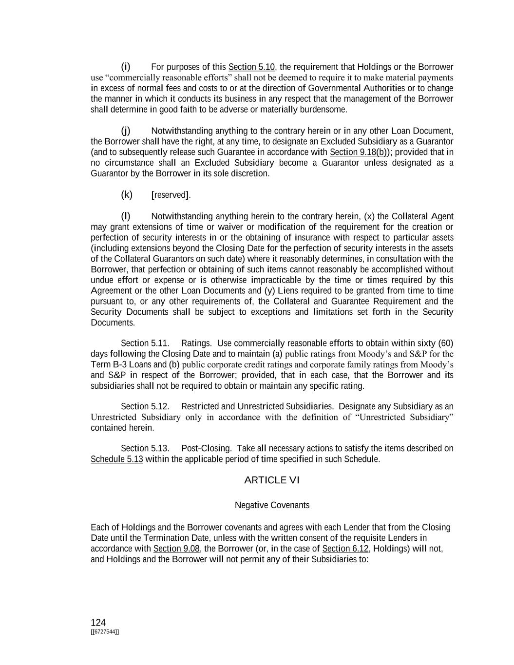 124 [[6727544]] (i) For purposes of this Section 5.10, the requirement that Holdings or the Borrower use “commercially reasonable efforts” shall not be deemed to require it to make material payments in excess of normal fees and costs to or at the direction of Governmental Authorities or to change the manner in which it conducts its business in any respect that the management of the Borrower shall determine in good faith to be adverse or materially burdensome. (j) Notwithstanding anything to the contrary herein or in any other Loan Document, the Borrower shall have the right, at any time, to designate an Excluded Subsidiary as a Guarantor (and to subsequently release such Guarantee in accordance with Section 9.18(b)); provided that in no circumstance shall an Excluded Subsidiary become a Guarantor unless designated as a Guarantor by the Borrower in its sole discretion. (k) [reserved]. (l) Notwithstanding anything herein to the contrary herein, (x) the Collateral Agent may grant extensions of time or waiver or modification of the requirement for the creation or perfection of security interests in or the obtaining of insurance with respect to particular assets (including extensions beyond the Closing Date for the perfection of security interests in the assets of the Collateral Guarantors on such date) where it reasonably determines, in consultation with the Borrower, that perfection or obtaining of such items cannot reasonably be accomplished without undue effort or expense or is otherwise impracticable by the time or times required by this Agreement or the other Loan Documents and (y) Liens required to be granted from time to time pursuant to, or any other requirements of, the Collateral and Guarantee Requirement and the Security Documents shall be subject to exceptions and limitations set forth in the Security Documents. Section 5.11. Ratings. Use commercially reasonable efforts to obtain within sixty (60) days following the Closing Date and to maintain (a) public ratings from Moody’s and S&P for the Term B-3 Loans and (b) public corporate credit ratings and corporate family ratings from Moody’s and S&P in respect of the Borrower; provided, that in each case, that the Borrower and its subsidiaries shall not be required to obtain or maintain any specific rating. Section 5.12. Restricted and Unrestricted Subsidiaries. Designate any Subsidiary as an Unrestricted Subsidiary only in accordance with the definition of “Unrestricted Subsidiary” contained herein. Section 5.13. Post-Closing. Take all necessary actions to satisfy the items described on Schedule 5.13 within the applicable period of time specified in such Schedule. ARTICLE VI Negative Covenants Each of Holdings and the Borrower covenants and agrees with each Lender that from the Closing Date until the Termination Date, unless with the written consent of the requisite Lenders in accordance with Section 9.08, the Borrower (or, in the case of Section 6.12, Holdings) will not, and Holdings and the Borrower will not permit any of their Subsidiaries to: