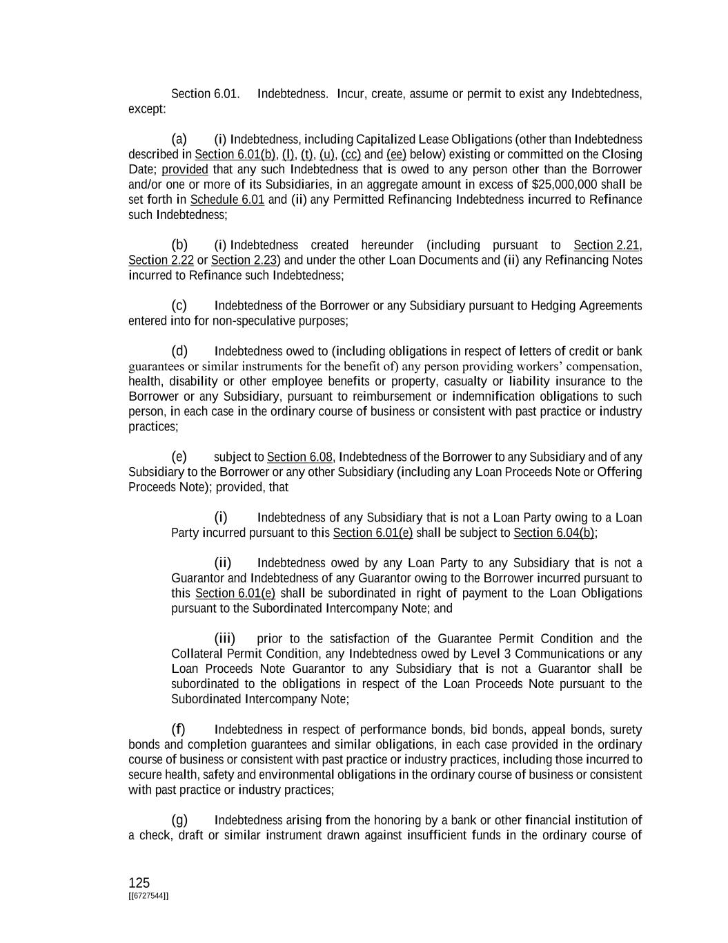 125 [[6727544]] Section 6.01. Indebtedness. Incur, create, assume or permit to exist any Indebtedness, except: (a) (i) Indebtedness, including Capitalized Lease Obligations (other than Indebtedness described in Section 6.01(b), (l), (t), (u), (cc) and (ee) below) existing or committed on the Closing Date; provided that any such Indebtedness that is owed to any person other than the Borrower and/or one or more of its Subsidiaries, in an aggregate amount in excess of $25,000,000 shall be set forth in Schedule 6.01 and (ii) any Permitted Refinancing Indebtedness incurred to Refinance such Indebtedness; (b) (i) Indebtedness created hereunder (including pursuant to Section 2.21, Section 2.22 or Section 2.23) and under the other Loan Documents and (ii) any Refinancing Notes incurred to Refinance such Indebtedness; (c) Indebtedness of the Borrower or any Subsidiary pursuant to Hedging Agreements entered into for non-speculative purposes; (d) Indebtedness owed to (including obligations in respect of letters of credit or bank guarantees or similar instruments for the benefit of) any person providing workers’ compensation, health, disability or other employee benefits or property, casualty or liability insurance to the Borrower or any Subsidiary, pursuant to reimbursement or indemnification obligations to such person, in each case in the ordinary course of business or consistent with past practice or industry practices; (e) subject to Section 6.08, Indebtedness of the Borrower to any Subsidiary and of any Subsidiary to the Borrower or any other Subsidiary (including any Loan Proceeds Note or Offering Proceeds Note); provided, that (i) Indebtedness of any Subsidiary that is not a Loan Party owing to a Loan Party incurred pursuant to this Section 6.01(e) shall be subject to Section 6.04(b); (ii) Indebtedness owed by any Loan Party to any Subsidiary that is not a Guarantor and Indebtedness of any Guarantor owing to the Borrower incurred pursuant to this Section 6.01(e) shall be subordinated in right of payment to the Loan Obligations pursuant to the Subordinated Intercompany Note; and (iii) prior to the satisfaction of the Guarantee Permit Condition and the Collateral Permit Condition, any Indebtedness owed by Level 3 Communications or any Loan Proceeds Note Guarantor to any Subsidiary that is not a Guarantor shall be subordinated to the obligations in respect of the Loan Proceeds Note pursuant to the Subordinated Intercompany Note; (f) Indebtedness in respect of performance bonds, bid bonds, appeal bonds, surety bonds and completion guarantees and similar obligations, in each case provided in the ordinary course of business or consistent with past practice or industry practices, including those incurred to secure health, safety and environmental obligations in the ordinary course of business or consistent with past practice or industry practices; (g) Indebtedness arising from the honoring by a bank or other financial institution of a check, draft or similar instrument drawn against insufficient funds in the ordinary course of