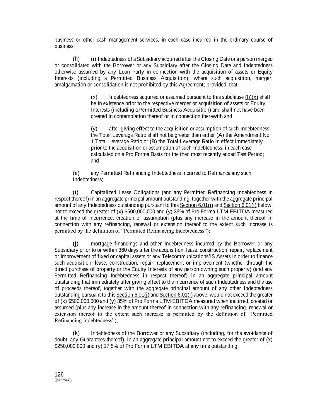 126 [[6727544]] business or other cash management services, in each case incurred in the ordinary course of business; (h) (i) Indebtedness of a Subsidiary acquired after the Closing Date or a person merged or consolidated with the Borrower or any Subsidiary after the Closing Date and Indebtedness otherwise assumed by any Loan Party in connection with the acquisition of assets or Equity Interests (including a Permitted Business Acquisition), where such acquisition, merger, amalgamation or consolidation is not prohibited by this Agreement; provided, that (x) Indebtedness acquired or assumed pursuant to this subclause (h)(x) shall be in existence prior to the respective merger or acquisition of assets or Equity Interests (including a Permitted Business Acquisition) and shall not have been created in contemplation thereof or in connection therewith and (y) after giving effect to the acquisition or assumption of such Indebtedness, the Total Leverage Ratio shall not be greater than either (A) the Amendment No. 1 Total Leverage Ratio or (B) the Total Leverage Ratio in effect immediately prior to the acquisition or assumption of such Indebtedness, in each case calculated on a Pro Forma Basis for the then most recently ended Test Period; and (ii) any Permitted Refinancing Indebtedness incurred to Refinance any such Indebtedness; (i) Capitalized Lease Obligations (and any Permitted Refinancing Indebtedness in respect thereof) in an aggregate principal amount outstanding, together with the aggregate principal amount of any Indebtedness outstanding pursuant to this Section 6.01(i) and Section 6.01(j) below, not to exceed the greater of (x) $500,000,000 and (y) 35% of Pro Forma LTM EBITDA measured at the time of incurrence, creation or assumption (plus any increase in the amount thereof in connection with any refinancing, renewal or extension thereof to the extent such increase is permitted by the definition of “Permitted Refinancing Indebtedness”); (j) mortgage financings and other Indebtedness incurred by the Borrower or any Subsidiary prior to or within 360 days after the acquisition, lease, construction, repair, replacement or improvement of fixed or capital assets or any Telecommunications/IS Assets in order to finance such acquisition, lease, construction, repair, replacement or improvement (whether through the direct purchase of property or the Equity Interests of any person owning such property) (and any Permitted Refinancing Indebtedness in respect thereof) in an aggregate principal amount outstanding that immediately after giving effect to the incurrence of such Indebtedness and the use of proceeds thereof, together with the aggregate principal amount of any other Indebtedness outstanding pursuant to this Section 6.01(j) and Section 6.01(i) above, would not exceed the greater of (x) $500,000,000 and (y) 35% of Pro Forma LTM EBITDA measured when incurred, created or assumed (plus any increase in the amount thereof in connection with any refinancing, renewal or extension thereof to the extent such increase is permitted by the definition of “Permitted Refinancing Indebtedness”); (k) Indebtedness of the Borrower or any Subsidiary (including, for the avoidance of doubt, any Guarantees thereof), in an aggregate principal amount not to exceed the greater of (x) $250,000,000 and (y) 17.5% of Pro Forma LTM EBITDA at any time outstanding;