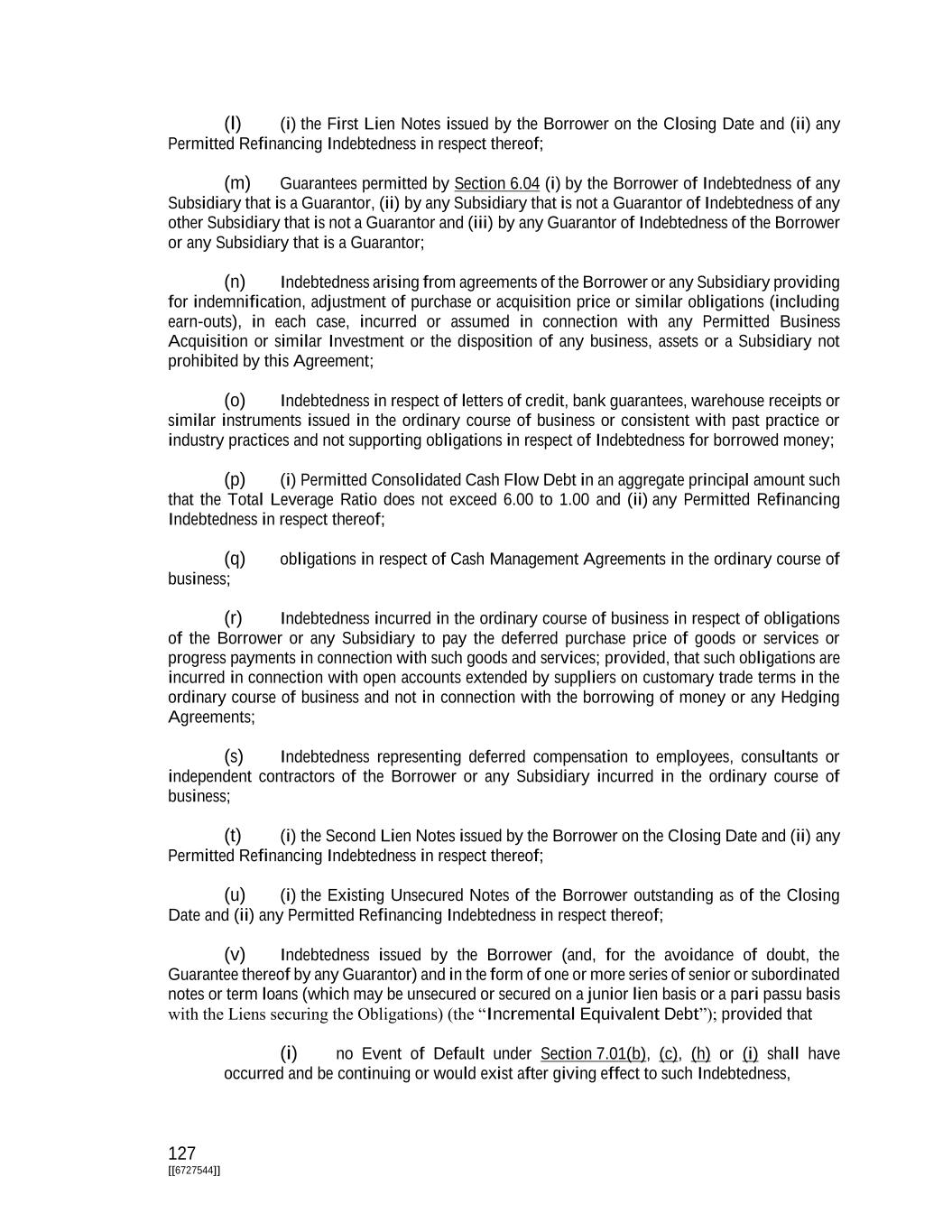 127 [[6727544]] (l) (i) the First Lien Notes issued by the Borrower on the Closing Date and (ii) any Permitted Refinancing Indebtedness in respect thereof; (m) Guarantees permitted by Section 6.04 (i) by the Borrower of Indebtedness of any Subsidiary that is a Guarantor, (ii) by any Subsidiary that is not a Guarantor of Indebtedness of any other Subsidiary that is not a Guarantor and (iii) by any Guarantor of Indebtedness of the Borrower or any Subsidiary that is a Guarantor; (n) Indebtedness arising from agreements of the Borrower or any Subsidiary providing for indemnification, adjustment of purchase or acquisition price or similar obligations (including earn-outs), in each case, incurred or assumed in connection with any Permitted Business Acquisition or similar Investment or the disposition of any business, assets or a Subsidiary not prohibited by this Agreement; (o) Indebtedness in respect of letters of credit, bank guarantees, warehouse receipts or similar instruments issued in the ordinary course of business or consistent with past practice or industry practices and not supporting obligations in respect of Indebtedness for borrowed money; (p) (i) Permitted Consolidated Cash Flow Debt in an aggregate principal amount such that the Total Leverage Ratio does not exceed 6.00 to 1.00 and (ii) any Permitted Refinancing Indebtedness in respect thereof; (q) obligations in respect of Cash Management Agreements in the ordinary course of business; (r) Indebtedness incurred in the ordinary course of business in respect of obligations of the Borrower or any Subsidiary to pay the deferred purchase price of goods or services or progress payments in connection with such goods and services; provided, that such obligations are incurred in connection with open accounts extended by suppliers on customary trade terms in the ordinary course of business and not in connection with the borrowing of money or any Hedging Agreements; (s) Indebtedness representing deferred compensation to employees, consultants or independent contractors of the Borrower or any Subsidiary incurred in the ordinary course of business; (t) (i) the Second Lien Notes issued by the Borrower on the Closing Date and (ii) any Permitted Refinancing Indebtedness in respect thereof; (u) (i) the Existing Unsecured Notes of the Borrower outstanding as of the Closing Date and (ii) any Permitted Refinancing Indebtedness in respect thereof; (v) Indebtedness issued by the Borrower (and, for the avoidance of doubt, the Guarantee thereof by any Guarantor) and in the form of one or more series of senior or subordinated notes or term loans (which may be unsecured or secured on a junior lien basis or a pari passu basis with the Liens securing the Obligations) (the “Incremental Equivalent Debt”); provided that (i) no Event of Default under Section 7.01(b), (c), (h) or (i) shall have occurred and be continuing or would exist after giving effect to such Indebtedness,