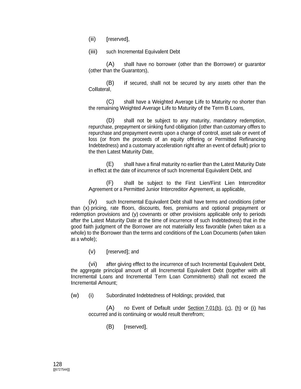 128 [[6727544]] (ii) [reserved], (iii) such Incremental Equivalent Debt (A) shall have no borrower (other than the Borrower) or guarantor (other than the Guarantors), (B) if secured, shall not be secured by any assets other than the Collateral, (C) shall have a Weighted Average Life to Maturity no shorter than the remaining Weighted Average Life to Maturity of the Term B Loans, (D) shall not be subject to any maturity, mandatory redemption, repurchase, prepayment or sinking fund obligation (other than customary offers to repurchase and prepayment events upon a change of control, asset sale or event of loss (or from the proceeds of an equity offering or Permitted Refinancing Indebtedness) and a customary acceleration right after an event of default) prior to the then Latest Maturity Date, (E) shall have a final maturity no earlier than the Latest Maturity Date in effect at the date of incurrence of such Incremental Equivalent Debt, and (F) shall be subject to the First Lien/First Lien Intercreditor Agreement or a Permitted Junior Intercreditor Agreement, as applicable, (iv) such Incremental Equivalent Debt shall have terms and conditions (other than (x) pricing, rate floors, discounts, fees, premiums and optional prepayment or redemption provisions and (y) covenants or other provisions applicable only to periods after the Latest Maturity Date at the time of incurrence of such Indebtedness) that in the good faith judgment of the Borrower are not materially less favorable (when taken as a whole) to the Borrower than the terms and conditions of the Loan Documents (when taken as a whole); (v) [reserved]; and (vi) after giving effect to the incurrence of such Incremental Equivalent Debt, the aggregate principal amount of all Incremental Equivalent Debt (together with all Incremental Loans and Incremental Term Loan Commitments) shall not exceed the Incremental Amount; (w) (i) Subordinated Indebtedness of Holdings; provided, that (A) no Event of Default under Section 7.01(b), (c), (h) or (i) has occurred and is continuing or would result therefrom; (B) [reserved],