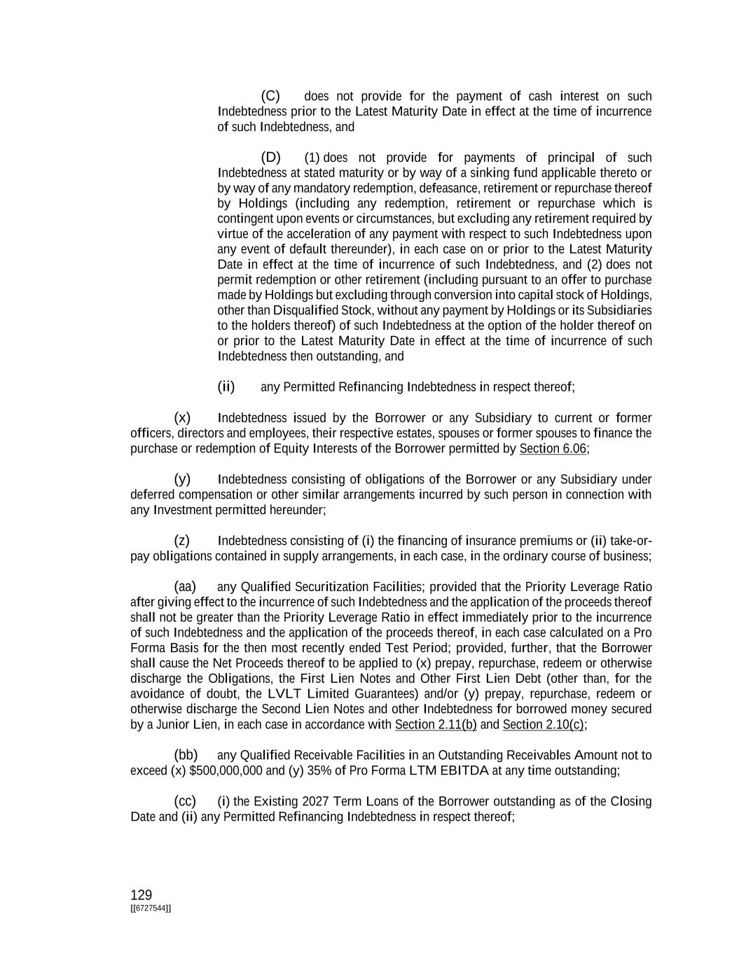 129 [[6727544]] (C) does not provide for the payment of cash interest on such Indebtedness prior to the Latest Maturity Date in effect at the time of incurrence of such Indebtedness, and (D) (1) does not provide for payments of principal of such Indebtedness at stated maturity or by way of a sinking fund applicable thereto or by way of any mandatory redemption, defeasance, retirement or repurchase thereof by Holdings (including any redemption, retirement or repurchase which is contingent upon events or circumstances, but excluding any retirement required by virtue of the acceleration of any payment with respect to such Indebtedness upon any event of default thereunder), in each case on or prior to the Latest Maturity Date in effect at the time of incurrence of such Indebtedness, and (2) does not permit redemption or other retirement (including pursuant to an offer to purchase made by Holdings but excluding through conversion into capital stock of Holdings, other than Disqualified Stock, without any payment by Holdings or its Subsidiaries to the holders thereof) of such Indebtedness at the option of the holder thereof on or prior to the Latest Maturity Date in effect at the time of incurrence of such Indebtedness then outstanding, and (ii) any Permitted Refinancing Indebtedness in respect thereof; (x) Indebtedness issued by the Borrower or any Subsidiary to current or former officers, directors and employees, their respective estates, spouses or former spouses to finance the purchase or redemption of Equity Interests of the Borrower permitted by Section 6.06; (y) Indebtedness consisting of obligations of the Borrower or any Subsidiary under deferred compensation or other similar arrangements incurred by such person in connection with any Investment permitted hereunder; (z) Indebtedness consisting of (i) the financing of insurance premiums or (ii) take-or- pay obligations contained in supply arrangements, in each case, in the ordinary course of business; (aa) any Qualified Securitization Facilities; provided that the Priority Leverage Ratio after giving effect to the incurrence of such Indebtedness and the application of the proceeds thereof shall not be greater than the Priority Leverage Ratio in effect immediately prior to the incurrence of such Indebtedness and the application of the proceeds thereof, in each case calculated on a Pro Forma Basis for the then most recently ended Test Period; provided, further, that the Borrower shall cause the Net Proceeds thereof to be applied to (x) prepay, repurchase, redeem or otherwise discharge the Obligations, the First Lien Notes and Other First Lien Debt (other than, for the avoidance of doubt, the LVLT Limited Guarantees) and/or (y) prepay, repurchase, redeem or otherwise discharge the Second Lien Notes and other Indebtedness for borrowed money secured by a Junior Lien, in each case in accordance with Section 2.11(b) and Section 2.10(c); (bb) any Qualified Receivable Facilities in an Outstanding Receivables Amount not to exceed (x) $500,000,000 and (y) 35% of Pro Forma LTM EBITDA at any time outstanding; (cc) (i) the Existing 2027 Term Loans of the Borrower outstanding as of the Closing Date and (ii) any Permitted Refinancing Indebtedness in respect thereof;