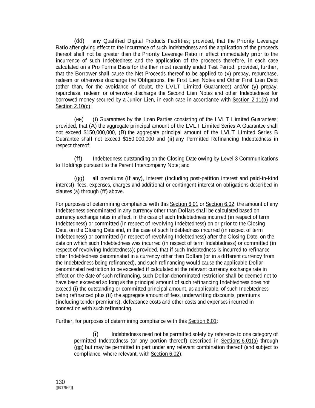 130 [[6727544]] (dd) any Qualified Digital Products Facilities; provided, that the Priority Leverage Ratio after giving effect to the incurrence of such Indebtedness and the application of the proceeds thereof shall not be greater than the Priority Leverage Ratio in effect immediately prior to the incurrence of such Indebtedness and the application of the proceeds therefore, in each case calculated on a Pro Forma Basis for the then most recently ended Test Period; provided, further, that the Borrower shall cause the Net Proceeds thereof to be applied to (x) prepay, repurchase, redeem or otherwise discharge the Obligations, the First Lien Notes and Other First Lien Debt (other than, for the avoidance of doubt, the LVLT Limited Guarantees) and/or (y) prepay, repurchase, redeem or otherwise discharge the Second Lien Notes and other Indebtedness for borrowed money secured by a Junior Lien, in each case in accordance with Section 2.11(b) and Section 2.10(c); (ee) (i) Guarantees by the Loan Parties consisting of the LVLT Limited Guarantees; provided, that (A) the aggregate principal amount of the LVLT Limited Series A Guarantee shall not exceed $150,000,000, (B) the aggregate principal amount of the LVLT Limited Series B Guarantee shall not exceed $150,000,000 and (ii) any Permitted Refinancing Indebtedness in respect thereof; (ff) Indebtedness outstanding on the Closing Date owing by Level 3 Communications to Holdings pursuant to the Parent Intercompany Note; and (gg) all premiums (if any), interest (including post-petition interest and paid-in-kind interest), fees, expenses, charges and additional or contingent interest on obligations described in clauses (a) through (ff) above. For purposes of determining compliance with this Section 6.01 or Section 6.02, the amount of any Indebtedness denominated in any currency other than Dollars shall be calculated based on currency exchange rates in effect, in the case of such Indebtedness incurred (in respect of term Indebtedness) or committed (in respect of revolving Indebtedness) on or prior to the Closing Date, on the Closing Date and, in the case of such Indebtedness incurred (in respect of term Indebtedness) or committed (in respect of revolving Indebtedness) after the Closing Date, on the date on which such Indebtedness was incurred (in respect of term Indebtedness) or committed (in respect of revolving Indebtedness); provided, that if such Indebtedness is incurred to refinance other Indebtedness denominated in a currency other than Dollars (or in a different currency from the Indebtedness being refinanced), and such refinancing would cause the applicable Dollar- denominated restriction to be exceeded if calculated at the relevant currency exchange rate in effect on the date of such refinancing, such Dollar-denominated restriction shall be deemed not to have been exceeded so long as the principal amount of such refinancing Indebtedness does not exceed (i) the outstanding or committed principal amount, as applicable, of such Indebtedness being refinanced plus (ii) the aggregate amount of fees, underwriting discounts, premiums (including tender premiums), defeasance costs and other costs and expenses incurred in connection with such refinancing. Further, for purposes of determining compliance with this Section 6.01: (i) Indebtedness need not be permitted solely by reference to one category of permitted Indebtedness (or any portion thereof) described in Sections 6.01(a) through (gg) but may be permitted in part under any relevant combination thereof (and subject to compliance, where relevant, with Section 6.02);