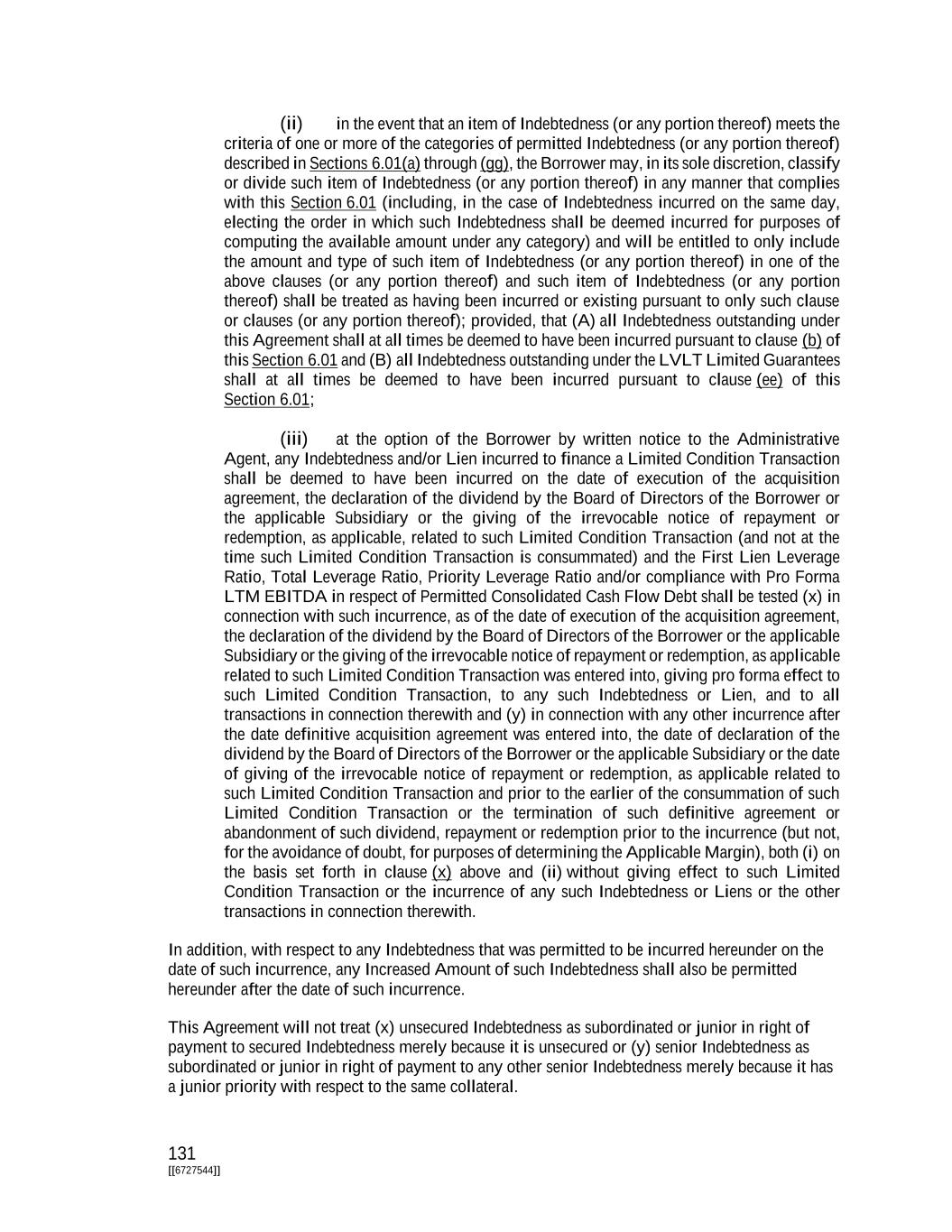 131 [[6727544]] (ii) in the event that an item of Indebtedness (or any portion thereof) meets the criteria of one or more of the categories of permitted Indebtedness (or any portion thereof) described in Sections 6.01(a) through (gg), the Borrower may, in its sole discretion, classify or divide such item of Indebtedness (or any portion thereof) in any manner that complies with this Section 6.01 (including, in the case of Indebtedness incurred on the same day, electing the order in which such Indebtedness shall be deemed incurred for purposes of computing the available amount under any category) and will be entitled to only include the amount and type of such item of Indebtedness (or any portion thereof) in one of the above clauses (or any portion thereof) and such item of Indebtedness (or any portion thereof) shall be treated as having been incurred or existing pursuant to only such clause or clauses (or any portion thereof); provided, that (A) all Indebtedness outstanding under this Agreement shall at all times be deemed to have been incurred pursuant to clause (b) of this Section 6.01 and (B) all Indebtedness outstanding under the LVLT Limited Guarantees shall at all times be deemed to have been incurred pursuant to clause (ee) of this Section 6.01; (iii) at the option of the Borrower by written notice to the Administrative Agent, any Indebtedness and/or Lien incurred to finance a Limited Condition Transaction shall be deemed to have been incurred on the date of execution of the acquisition agreement, the declaration of the dividend by the Board of Directors of the Borrower or the applicable Subsidiary or the giving of the irrevocable notice of repayment or redemption, as applicable, related to such Limited Condition Transaction (and not at the time such Limited Condition Transaction is consummated) and the First Lien Leverage Ratio, Total Leverage Ratio, Priority Leverage Ratio and/or compliance with Pro Forma LTM EBITDA in respect of Permitted Consolidated Cash Flow Debt shall be tested (x) in connection with such incurrence, as of the date of execution of the acquisition agreement, the declaration of the dividend by the Board of Directors of the Borrower or the applicable Subsidiary or the giving of the irrevocable notice of repayment or redemption, as applicable related to such Limited Condition Transaction was entered into, giving pro forma effect to such Limited Condition Transaction, to any such Indebtedness or Lien, and to all transactions in connection therewith and (y) in connection with any other incurrence after the date definitive acquisition agreement was entered into, the date of declaration of the dividend by the Board of Directors of the Borrower or the applicable Subsidiary or the date of giving of the irrevocable notice of repayment or redemption, as applicable related to such Limited Condition Transaction and prior to the earlier of the consummation of such Limited Condition Transaction or the termination of such definitive agreement or abandonment of such dividend, repayment or redemption prior to the incurrence (but not, for the avoidance of doubt, for purposes of determining the Applicable Margin), both (i) on the basis set forth in clause (x) above and (ii) without giving effect to such Limited Condition Transaction or the incurrence of any such Indebtedness or Liens or the other transactions in connection therewith. In addition, with respect to any Indebtedness that was permitted to be incurred hereunder on the date of such incurrence, any Increased Amount of such Indebtedness shall also be permitted hereunder after the date of such incurrence. This Agreement will not treat (x) unsecured Indebtedness as subordinated or junior in right of payment to secured Indebtedness merely because it is unsecured or (y) senior Indebtedness as subordinated or junior in right of payment to any other senior Indebtedness merely because it has a junior priority with respect to the same collateral.