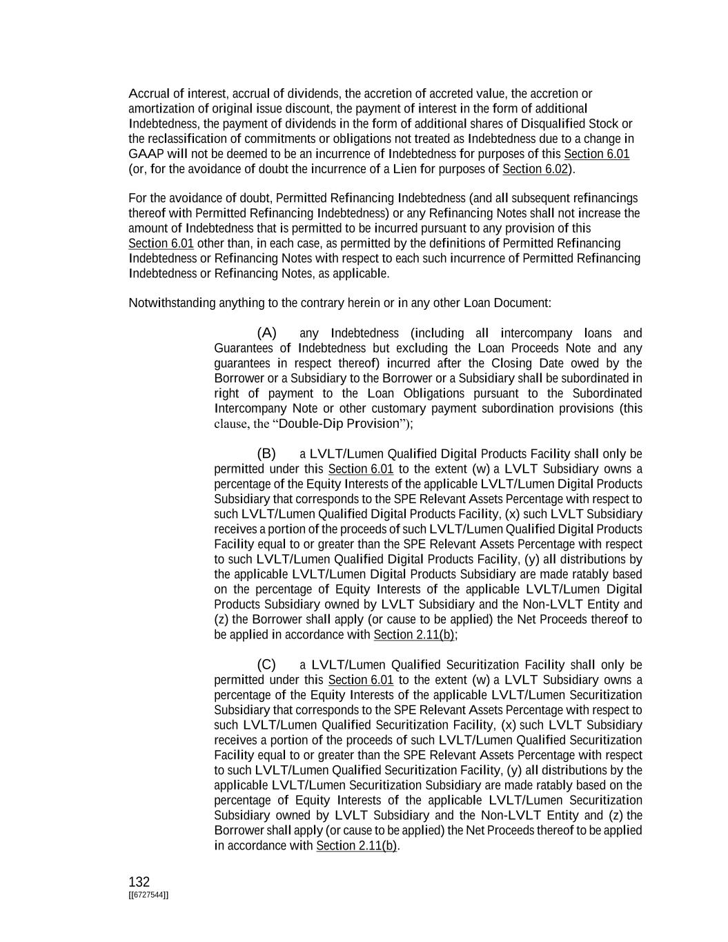 132 [[6727544]] Accrual of interest, accrual of dividends, the accretion of accreted value, the accretion or amortization of original issue discount, the payment of interest in the form of additional Indebtedness, the payment of dividends in the form of additional shares of Disqualified Stock or the reclassification of commitments or obligations not treated as Indebtedness due to a change in GAAP will not be deemed to be an incurrence of Indebtedness for purposes of this Section 6.01 (or, for the avoidance of doubt the incurrence of a Lien for purposes of Section 6.02). For the avoidance of doubt, Permitted Refinancing Indebtedness (and all subsequent refinancings thereof with Permitted Refinancing Indebtedness) or any Refinancing Notes shall not increase the amount of Indebtedness that is permitted to be incurred pursuant to any provision of this Section 6.01 other than, in each case, as permitted by the definitions of Permitted Refinancing Indebtedness or Refinancing Notes with respect to each such incurrence of Permitted Refinancing Indebtedness or Refinancing Notes, as applicable. Notwithstanding anything to the contrary herein or in any other Loan Document: (A) any Indebtedness (including all intercompany loans and Guarantees of Indebtedness but excluding the Loan Proceeds Note and any guarantees in respect thereof) incurred after the Closing Date owed by the Borrower or a Subsidiary to the Borrower or a Subsidiary shall be subordinated in right of payment to the Loan Obligations pursuant to the Subordinated Intercompany Note or other customary payment subordination provisions (this clause, the “Double-Dip Provision”); (B) a LVLT/Lumen Qualified Digital Products Facility shall only be permitted under this Section 6.01 to the extent (w) a LVLT Subsidiary owns a percentage of the Equity Interests of the applicable LVLT/Lumen Digital Products Subsidiary that corresponds to the SPE Relevant Assets Percentage with respect to such LVLT/Lumen Qualified Digital Products Facility, (x) such LVLT Subsidiary receives a portion of the proceeds of such LVLT/Lumen Qualified Digital Products Facility equal to or greater than the SPE Relevant Assets Percentage with respect to such LVLT/Lumen Qualified Digital Products Facility, (y) all distributions by the applicable LVLT/Lumen Digital Products Subsidiary are made ratably based on the percentage of Equity Interests of the applicable LVLT/Lumen Digital Products Subsidiary owned by LVLT Subsidiary and the Non-LVLT Entity and (z) the Borrower shall apply (or cause to be applied) the Net Proceeds thereof to be applied in accordance with Section 2.11(b); (C) a LVLT/Lumen Qualified Securitization Facility shall only be permitted under this Section 6.01 to the extent (w) a LVLT Subsidiary owns a percentage of the Equity Interests of the applicable LVLT/Lumen Securitization Subsidiary that corresponds to the SPE Relevant Assets Percentage with respect to such LVLT/Lumen Qualified Securitization Facility, (x) such LVLT Subsidiary receives a portion of the proceeds of such LVLT/Lumen Qualified Securitization Facility equal to or greater than the SPE Relevant Assets Percentage with respect to such LVLT/Lumen Qualified Securitization Facility, (y) all distributions by the applicable LVLT/Lumen Securitization Subsidiary are made ratably based on the percentage of Equity Interests of the applicable LVLT/Lumen Securitization Subsidiary owned by LVLT Subsidiary and the Non-LVLT Entity and (z) the Borrower shall apply (or cause to be applied) the Net Proceeds thereof to be applied in accordance with Section 2.11(b).