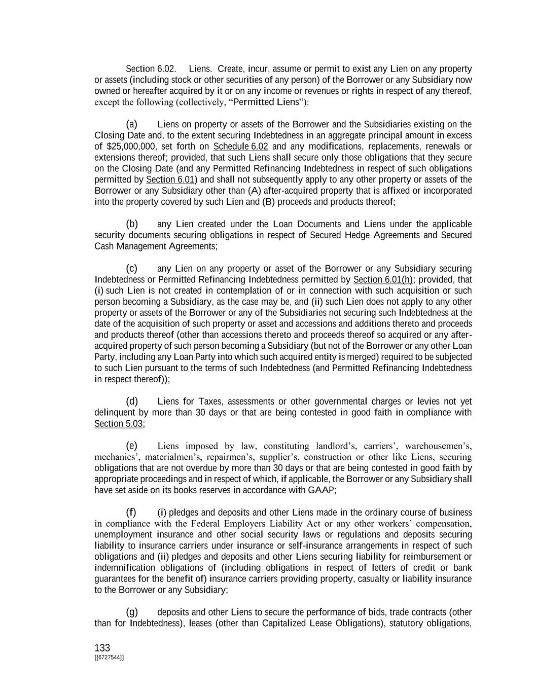 133 [[6727544]] Section 6.02. Liens. Create, incur, assume or permit to exist any Lien on any property or assets (including stock or other securities of any person) of the Borrower or any Subsidiary now owned or hereafter acquired by it or on any income or revenues or rights in respect of any thereof, except the following (collectively, “Permitted Liens”): (a) Liens on property or assets of the Borrower and the Subsidiaries existing on the Closing Date and, to the extent securing Indebtedness in an aggregate principal amount in excess of $25,000,000, set forth on Schedule 6.02 and any modifications, replacements, renewals or extensions thereof; provided, that such Liens shall secure only those obligations that they secure on the Closing Date (and any Permitted Refinancing Indebtedness in respect of such obligations permitted by Section 6.01) and shall not subsequently apply to any other property or assets of the Borrower or any Subsidiary other than (A) after-acquired property that is affixed or incorporated into the property covered by such Lien and (B) proceeds and products thereof; (b) any Lien created under the Loan Documents and Liens under the applicable security documents securing obligations in respect of Secured Hedge Agreements and Secured Cash Management Agreements; (c) any Lien on any property or asset of the Borrower or any Subsidiary securing Indebtedness or Permitted Refinancing Indebtedness permitted by Section 6.01(h); provided, that (i) such Lien is not created in contemplation of or in connection with such acquisition or such person becoming a Subsidiary, as the case may be, and (ii) such Lien does not apply to any other property or assets of the Borrower or any of the Subsidiaries not securing such Indebtedness at the date of the acquisition of such property or asset and accessions and additions thereto and proceeds and products thereof (other than accessions thereto and proceeds thereof so acquired or any after- acquired property of such person becoming a Subsidiary (but not of the Borrower or any other Loan Party, including any Loan Party into which such acquired entity is merged) required to be subjected to such Lien pursuant to the terms of such Indebtedness (and Permitted Refinancing Indebtedness in respect thereof)); (d) Liens for Taxes, assessments or other governmental charges or levies not yet delinquent by more than 30 days or that are being contested in good faith in compliance with Section 5.03; (e) Liens imposed by law, constituting landlord’s, carriers’, warehousemen’s, mechanics’, materialmen’s, repairmen’s, supplier’s, construction or other like Liens, securing obligations that are not overdue by more than 30 days or that are being contested in good faith by appropriate proceedings and in respect of which, if applicable, the Borrower or any Subsidiary shall have set aside on its books reserves in accordance with GAAP; (f) (i) pledges and deposits and other Liens made in the ordinary course of business in compliance with the Federal Employers Liability Act or any other workers’ compensation, unemployment insurance and other social security laws or regulations and deposits securing liability to insurance carriers under insurance or self-insurance arrangements in respect of such obligations and (ii) pledges and deposits and other Liens securing liability for reimbursement or indemnification obligations of (including obligations in respect of letters of credit or bank guarantees for the benefit of) insurance carriers providing property, casualty or liability insurance to the Borrower or any Subsidiary; (g) deposits and other Liens to secure the performance of bids, trade contracts (other than for Indebtedness), leases (other than Capitalized Lease Obligations), statutory obligations,