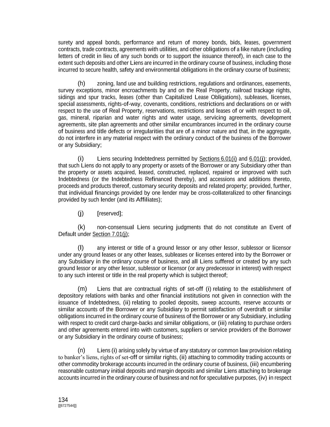 134 [[6727544]] surety and appeal bonds, performance and return of money bonds, bids, leases, government contracts, trade contracts, agreements with utilities, and other obligations of a like nature (including letters of credit in lieu of any such bonds or to support the issuance thereof), in each case to the extent such deposits and other Liens are incurred in the ordinary course of business, including those incurred to secure health, safety and environmental obligations in the ordinary course of business; (h) zoning, land use and building restrictions, regulations and ordinances, easements, survey exceptions, minor encroachments by and on the Real Property, railroad trackage rights, sidings and spur tracks, leases (other than Capitalized Lease Obligations), subleases, licenses, special assessments, rights-of-way, covenants, conditions, restrictions and declarations on or with respect to the use of Real Property, reservations, restrictions and leases of or with respect to oil, gas, mineral, riparian and water rights and water usage, servicing agreements, development agreements, site plan agreements and other similar encumbrances incurred in the ordinary course of business and title defects or irregularities that are of a minor nature and that, in the aggregate, do not interfere in any material respect with the ordinary conduct of the business of the Borrower or any Subsidiary; (i) Liens securing Indebtedness permitted by Sections 6.01(i) and 6.01(j); provided, that such Liens do not apply to any property or assets of the Borrower or any Subsidiary other than the property or assets acquired, leased, constructed, replaced, repaired or improved with such Indebtedness (or the Indebtedness Refinanced thereby), and accessions and additions thereto, proceeds and products thereof, customary security deposits and related property; provided, further, that individual financings provided by one lender may be cross-collateralized to other financings provided by such lender (and its Affiliates); (j) [reserved]; (k) non-consensual Liens securing judgments that do not constitute an Event of Default under Section 7.01(j); (l) any interest or title of a ground lessor or any other lessor, sublessor or licensor under any ground leases or any other leases, subleases or licenses entered into by the Borrower or any Subsidiary in the ordinary course of business, and all Liens suffered or created by any such ground lessor or any other lessor, sublessor or licensor (or any predecessor in interest) with respect to any such interest or title in the real property which is subject thereof; (m) Liens that are contractual rights of set-off (i) relating to the establishment of depository relations with banks and other financial institutions not given in connection with the issuance of Indebtedness, (ii) relating to pooled deposits, sweep accounts, reserve accounts or similar accounts of the Borrower or any Subsidiary to permit satisfaction of overdraft or similar obligations incurred in the ordinary course of business of the Borrower or any Subsidiary, including with respect to credit card charge-backs and similar obligations, or (iii) relating to purchase orders and other agreements entered into with customers, suppliers or service providers of the Borrower or any Subsidiary in the ordinary course of business; (n) Liens (i) arising solely by virtue of any statutory or common law provision relating to banker’s liens, rights of set-off or similar rights, (ii) attaching to commodity trading accounts or other commodity brokerage accounts incurred in the ordinary course of business, (iii) encumbering reasonable customary initial deposits and margin deposits and similar Liens attaching to brokerage accounts incurred in the ordinary course of business and not for speculative purposes, (iv) in respect