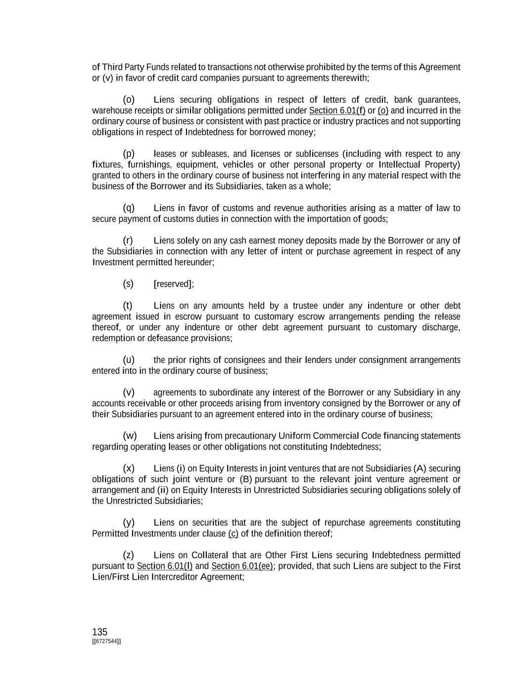 135 [[6727544]] of Third Party Funds related to transactions not otherwise prohibited by the terms of this Agreement or (v) in favor of credit card companies pursuant to agreements therewith; (o) Liens securing obligations in respect of letters of credit, bank guarantees, warehouse receipts or similar obligations permitted under Section 6.01(f) or (o) and incurred in the ordinary course of business or consistent with past practice or industry practices and not supporting obligations in respect of Indebtedness for borrowed money; (p) leases or subleases, and licenses or sublicenses (including with respect to any fixtures, furnishings, equipment, vehicles or other personal property or Intellectual Property) granted to others in the ordinary course of business not interfering in any material respect with the business of the Borrower and its Subsidiaries, taken as a whole; (q) Liens in favor of customs and revenue authorities arising as a matter of law to secure payment of customs duties in connection with the importation of goods; (r) Liens solely on any cash earnest money deposits made by the Borrower or any of the Subsidiaries in connection with any letter of intent or purchase agreement in respect of any Investment permitted hereunder; (s) [reserved]; (t) Liens on any amounts held by a trustee under any indenture or other debt agreement issued in escrow pursuant to customary escrow arrangements pending the release thereof, or under any indenture or other debt agreement pursuant to customary discharge, redemption or defeasance provisions; (u) the prior rights of consignees and their lenders under consignment arrangements entered into in the ordinary course of business; (v) agreements to subordinate any interest of the Borrower or any Subsidiary in any accounts receivable or other proceeds arising from inventory consigned by the Borrower or any of their Subsidiaries pursuant to an agreement entered into in the ordinary course of business; (w) Liens arising from precautionary Uniform Commercial Code financing statements regarding operating leases or other obligations not constituting Indebtedness; (x) Liens (i) on Equity Interests in joint ventures that are not Subsidiaries (A) securing obligations of such joint venture or (B) pursuant to the relevant joint venture agreement or arrangement and (ii) on Equity Interests in Unrestricted Subsidiaries securing obligations solely of the Unrestricted Subsidiaries; (y) Liens on securities that are the subject of repurchase agreements constituting Permitted Investments under clause (c) of the definition thereof; (z) Liens on Collateral that are Other First Liens securing Indebtedness permitted pursuant to Section 6.01(l) and Section 6.01(ee); provided, that such Liens are subject to the First Lien/First Lien Intercreditor Agreement;