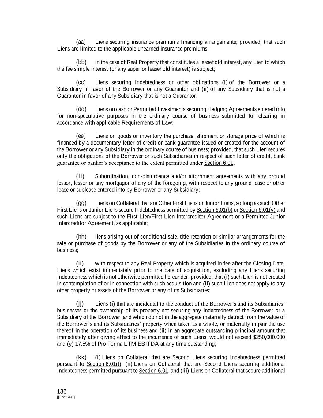 136 [[6727544]] (aa) Liens securing insurance premiums financing arrangements; provided, that such Liens are limited to the applicable unearned insurance premiums; (bb) in the case of Real Property that constitutes a leasehold interest, any Lien to which the fee simple interest (or any superior leasehold interest) is subject; (cc) Liens securing Indebtedness or other obligations (i) of the Borrower or a Subsidiary in favor of the Borrower or any Guarantor and (ii) of any Subsidiary that is not a Guarantor in favor of any Subsidiary that is not a Guarantor; (dd) Liens on cash or Permitted Investments securing Hedging Agreements entered into for non-speculative purposes in the ordinary course of business submitted for clearing in accordance with applicable Requirements of Law; (ee) Liens on goods or inventory the purchase, shipment or storage price of which is financed by a documentary letter of credit or bank guarantee issued or created for the account of the Borrower or any Subsidiary in the ordinary course of business; provided, that such Lien secures only the obligations of the Borrower or such Subsidiaries in respect of such letter of credit, bank guarantee or banker’s acceptance to the extent permitted under Section 6.01; (ff) Subordination, non-disturbance and/or attornment agreements with any ground lessor, lessor or any mortgagor of any of the foregoing, with respect to any ground lease or other lease or sublease entered into by Borrower or any Subsidiary; (gg) Liens on Collateral that are Other First Liens or Junior Liens, so long as such Other First Liens or Junior Liens secure Indebtedness permitted by Section 6.01(b) or Section 6.01(v) and such Liens are subject to the First Lien/First Lien Intercreditor Agreement or a Permitted Junior Intercreditor Agreement, as applicable; (hh) liens arising out of conditional sale, title retention or similar arrangements for the sale or purchase of goods by the Borrower or any of the Subsidiaries in the ordinary course of business; (ii) with respect to any Real Property which is acquired in fee after the Closing Date, Liens which exist immediately prior to the date of acquisition, excluding any Liens securing Indebtedness which is not otherwise permitted hereunder; provided, that (i) such Lien is not created in contemplation of or in connection with such acquisition and (ii) such Lien does not apply to any other property or assets of the Borrower or any of its Subsidiaries; (jj) Liens (i) that are incidental to the conduct of the Borrower’s and its Subsidiaries’ businesses or the ownership of its property not securing any Indebtedness of the Borrower or a Subsidiary of the Borrower, and which do not in the aggregate materially detract from the value of the Borrower’s and its Subsidiaries’ property when taken as a whole, or materially impair the use thereof in the operation of its business and (ii) in an aggregate outstanding principal amount that immediately after giving effect to the incurrence of such Liens, would not exceed $250,000,000 and (y) 17.5% of Pro Forma LTM EBITDA at any time outstanding; (kk) (i) Liens on Collateral that are Second Liens securing Indebtedness permitted pursuant to Section 6.01(t), (ii) Liens on Collateral that are Second Liens securing additional Indebtedness permitted pursuant to Section 6.01, and (iii) Liens on Collateral that secure additional