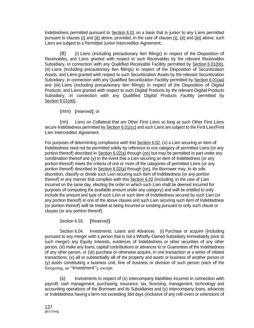 137 [[6727544]] Indebtedness permitted pursuant to Section 6.01 on a basis that is junior to any Liens permitted pursuant to clauses (i) and (ii) above; provided, in the case of clauses (i), (ii) and (iii) above, such Liens are subject to a Permitted Junior Intercreditor Agreement; (ll) (i) Liens (including precautionary lien filings) in respect of the Disposition of Receivables, and Liens granted with respect to such Receivables by the relevant Receivables Subsidiary, in connection with any Qualified Receivable Facility permitted by Section 6.01(bb), (ii) Liens (including precautionary lien filings) in respect of the Disposition of Securitization Assets, and Liens granted with respect to such Securitization Assets by the relevant Securitization Subsidiary, in connection with any Qualified Securitization Facility permitted by Section 6.01(aa) and (iii) Liens (including precautionary lien filings) in respect of the Disposition of Digital Products, and Liens granted with respect to such Digital Products by the relevant Digital Products Subsidiary, in connection with any Qualified Digital Products Facility permitted by Section 6.01(dd); (mm) [reserved]; or (nn) Liens on Collateral that are Other First Liens so long as such Other First Liens secure Indebtedness permitted by Section 6.01(cc) and such Liens are subject to the First Lien/First Lien Intercreditor Agreement. For purposes of determining compliance with this Section 6.02, (x) a Lien securing an item of Indebtedness need not be permitted solely by reference to one category of permitted Liens (or any portion thereof) described in Section 6.02(a) through (nn) but may be permitted in part under any combination thereof and (y) in the event that a Lien securing an item of Indebtedness (or any portion thereof) meets the criteria of one or more of the categories of permitted Liens (or any portion thereof) described in Section 6.02(a) through (nn), the Borrower may, in its sole discretion, classify or divide such Lien securing such item of Indebtedness (or any portion thereof) in any manner that complies with this Section 6.02 (including, in the case of Lien incurred on the same day, electing the order in which such Lien shall be deemed incurred for purposes of computing the available amount under any category) and will be entitled to only include the amount and type of such Lien or such item of Indebtedness secured by such Lien (or any portion thereof) in one of the above clauses and such Lien securing such item of Indebtedness (or portion thereof) will be treated as being incurred or existing pursuant to only such clause or clauses (or any portion thereof). Section 6.03. [Reserved]. Section 6.04. Investments, Loans and Advances. (i) Purchase or acquire (including pursuant to any merger with a person that is not a Wholly-Owned Subsidiary immediately prior to such merger) any Equity Interests, evidences of Indebtedness or other securities of any other person, (ii) make any loans, capital contributions or advances to or Guarantees of the Indebtedness of any other person, or (iii) purchase or otherwise acquire, in one transaction or a series of related transactions, (x) all or substantially all of the property and assets or business of another person or (y) assets constituting a business unit, line of business or division of such person (each of the foregoing, an “Investment”), except: (a) Investments in respect of (x) intercompany liabilities incurred in connection with payroll, cash management, purchasing, insurance, tax, licensing, management, technology and accounting operations of the Borrower and its Subsidiaries and (y) intercompany loans, advances or Indebtedness having a term not exceeding 364 days (inclusive of any roll-overs or extensions of