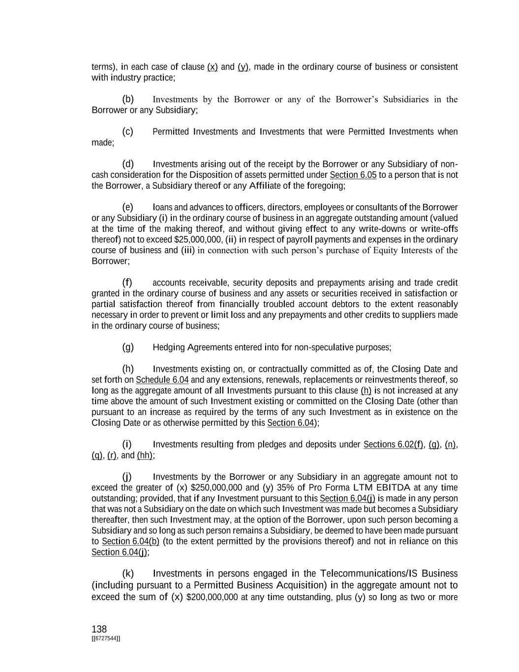 138 [[6727544]] terms), in each case of clause (x) and (y), made in the ordinary course of business or consistent with industry practice; (b) Investments by the Borrower or any of the Borrower’s Subsidiaries in the Borrower or any Subsidiary; (c) Permitted Investments and Investments that were Permitted Investments when made; (d) Investments arising out of the receipt by the Borrower or any Subsidiary of non- cash consideration for the Disposition of assets permitted under Section 6.05 to a person that is not the Borrower, a Subsidiary thereof or any Affiliate of the foregoing; (e) loans and advances to officers, directors, employees or consultants of the Borrower or any Subsidiary (i) in the ordinary course of business in an aggregate outstanding amount (valued at the time of the making thereof, and without giving effect to any write-downs or write-offs thereof) not to exceed $25,000,000, (ii) in respect of payroll payments and expenses in the ordinary course of business and (iii) in connection with such person’s purchase of Equity Interests of the Borrower; (f) accounts receivable, security deposits and prepayments arising and trade credit granted in the ordinary course of business and any assets or securities received in satisfaction or partial satisfaction thereof from financially troubled account debtors to the extent reasonably necessary in order to prevent or limit loss and any prepayments and other credits to suppliers made in the ordinary course of business; (g) Hedging Agreements entered into for non-speculative purposes; (h) Investments existing on, or contractually committed as of, the Closing Date and set forth on Schedule 6.04 and any extensions, renewals, replacements or reinvestments thereof, so long as the aggregate amount of all Investments pursuant to this clause (h) is not increased at any time above the amount of such Investment existing or committed on the Closing Date (other than pursuant to an increase as required by the terms of any such Investment as in existence on the Closing Date or as otherwise permitted by this Section 6.04); (i) Investments resulting from pledges and deposits under Sections 6.02(f), (g), (n), (q), (r), and (hh); (j) Investments by the Borrower or any Subsidiary in an aggregate amount not to exceed the greater of (x) $250,000,000 and (y) 35% of Pro Forma LTM EBITDA at any time outstanding; provided, that if any Investment pursuant to this Section 6.04(j) is made in any person that was not a Subsidiary on the date on which such Investment was made but becomes a Subsidiary thereafter, then such Investment may, at the option of the Borrower, upon such person becoming a Subsidiary and so long as such person remains a Subsidiary, be deemed to have been made pursuant to Section 6.04(b) (to the extent permitted by the provisions thereof) and not in reliance on this Section 6.04(j); (k) Investments in persons engaged in the Telecommunications/IS Business (including pursuant to a Permitted Business Acquisition) in the aggregate amount not to exceed the sum of (x) $200,000,000 at any time outstanding, plus (y) so long as two or more