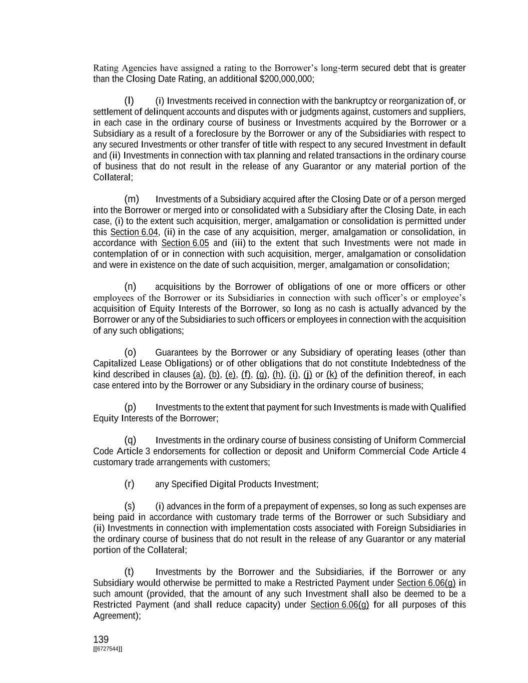139 [[6727544]] Rating Agencies have assigned a rating to the Borrower’s long-term secured debt that is greater than the Closing Date Rating, an additional $200,000,000; (l) (i) Investments received in connection with the bankruptcy or reorganization of, or settlement of delinquent accounts and disputes with or judgments against, customers and suppliers, in each case in the ordinary course of business or Investments acquired by the Borrower or a Subsidiary as a result of a foreclosure by the Borrower or any of the Subsidiaries with respect to any secured Investments or other transfer of title with respect to any secured Investment in default and (ii) Investments in connection with tax planning and related transactions in the ordinary course of business that do not result in the release of any Guarantor or any material portion of the Collateral; (m) Investments of a Subsidiary acquired after the Closing Date or of a person merged into the Borrower or merged into or consolidated with a Subsidiary after the Closing Date, in each case, (i) to the extent such acquisition, merger, amalgamation or consolidation is permitted under this Section 6.04, (ii) in the case of any acquisition, merger, amalgamation or consolidation, in accordance with Section 6.05 and (iii) to the extent that such Investments were not made in contemplation of or in connection with such acquisition, merger, amalgamation or consolidation and were in existence on the date of such acquisition, merger, amalgamation or consolidation; (n) acquisitions by the Borrower of obligations of one or more officers or other employees of the Borrower or its Subsidiaries in connection with such officer’s or employee’s acquisition of Equity Interests of the Borrower, so long as no cash is actually advanced by the Borrower or any of the Subsidiaries to such officers or employees in connection with the acquisition of any such obligations; (o) Guarantees by the Borrower or any Subsidiary of operating leases (other than Capitalized Lease Obligations) or of other obligations that do not constitute Indebtedness of the kind described in clauses (a), (b), (e), (f), (g), (h), (i), (j) or (k) of the definition thereof, in each case entered into by the Borrower or any Subsidiary in the ordinary course of business; (p) Investments to the extent that payment for such Investments is made with Qualified Equity Interests of the Borrower; (q) Investments in the ordinary course of business consisting of Uniform Commercial Code Article 3 endorsements for collection or deposit and Uniform Commercial Code Article 4 customary trade arrangements with customers; (r) any Specified Digital Products Investment; (s) (i) advances in the form of a prepayment of expenses, so long as such expenses are being paid in accordance with customary trade terms of the Borrower or such Subsidiary and (ii) Investments in connection with implementation costs associated with Foreign Subsidiaries in the ordinary course of business that do not result in the release of any Guarantor or any material portion of the Collateral; (t) Investments by the Borrower and the Subsidiaries, if the Borrower or any Subsidiary would otherwise be permitted to make a Restricted Payment under Section 6.06(g) in such amount (provided, that the amount of any such Investment shall also be deemed to be a Restricted Payment (and shall reduce capacity) under Section 6.06(g) for all purposes of this Agreement);