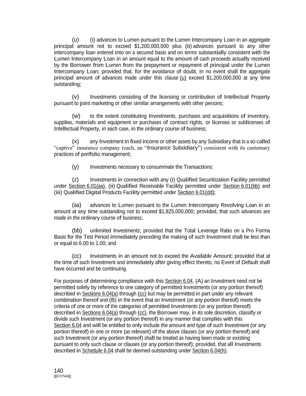 140 [[6727544]] (u) (i) advances to Lumen pursuant to the Lumen Intercompany Loan in an aggregate principal amount not to exceed $1,200,000,000 plus (ii) advances pursuant to any other intercompany loan entered into on a secured basis and on terms substantially consistent with the Lumen Intercompany Loan in an amount equal to the amount of cash proceeds actually received by the Borrower from Lumen from the prepayment or repayment of principal under the Lumen Intercompany Loan; provided that, for the avoidance of doubt, in no event shall the aggregate principal amount of advances made under this clause (u) exceed $1,200,000,000 at any time outstanding; (v) Investments consisting of the licensing or contribution of Intellectual Property pursuant to joint marketing or other similar arrangements with other persons; (w) to the extent constituting Investments, purchases and acquisitions of inventory, supplies, materials and equipment or purchases of contract rights, or licenses or sublicenses of Intellectual Property, in each case, in the ordinary course of business; (x) any Investment in fixed income or other assets by any Subsidiary that is a so-called “captive” insurance company (each, an “Insurance Subsidiary”) consistent with its customary practices of portfolio management; (y) Investments necessary to consummate the Transactions; (z) Investments in connection with any (i) Qualified Securitization Facility permitted under Section 6.01(aa), (ii) Qualified Receivable Facility permitted under Section 6.01(bb) and (iii) Qualified Digital Products Facility permitted under Section 6.01(dd); (aa) advances to Lumen pursuant to the Lumen Intercompany Revolving Loan in an amount at any time outstanding not to exceed $1,825,000,000; provided, that such advances are made in the ordinary course of business; (bb) unlimited Investments; provided that the Total Leverage Ratio on a Pro Forma Basis for the Test Period immediately preceding the making of such Investment shall be less than or equal to 6.00 to 1.00; and (cc) Investments in an amount not to exceed the Available Amount; provided that at the time of such Investment and immediately after giving effect thereto, no Event of Default shall have occurred and be continuing. For purposes of determining compliance with this Section 6.04, (A) an Investment need not be permitted solely by reference to one category of permitted Investments (or any portion thereof) described in Sections 6.04(a) through (cc) but may be permitted in part under any relevant combination thereof and (B) in the event that an Investment (or any portion thereof) meets the criteria of one or more of the categories of permitted Investments (or any portion thereof) described in Sections 6.04(a) through (cc), the Borrower may, in its sole discretion, classify or divide such Investment (or any portion thereof) in any manner that complies with this Section 6.04 and will be entitled to only include the amount and type of such Investment (or any portion thereof) in one or more (as relevant) of the above clauses (or any portion thereof) and such Investment (or any portion thereof) shall be treated as having been made or existing pursuant to only such clause or clauses (or any portion thereof); provided, that all Investments described in Schedule 6.04 shall be deemed outstanding under Section 6.04(h).