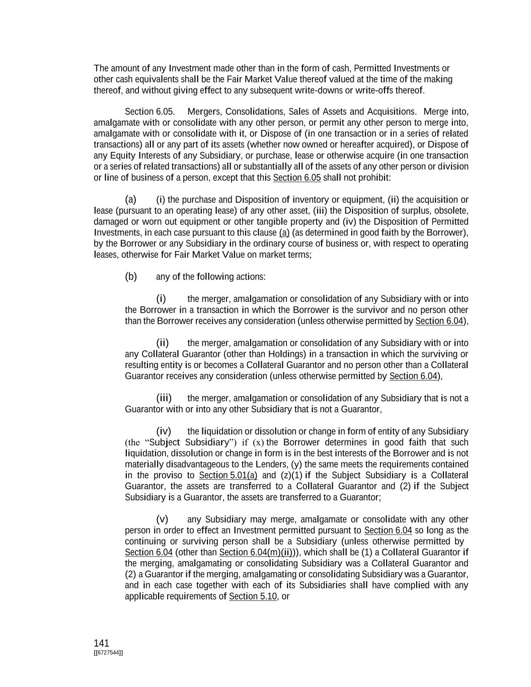 141 [[6727544]] The amount of any Investment made other than in the form of cash, Permitted Investments or other cash equivalents shall be the Fair Market Value thereof valued at the time of the making thereof, and without giving effect to any subsequent write-downs or write-offs thereof. Section 6.05. Mergers, Consolidations, Sales of Assets and Acquisitions. Merge into, amalgamate with or consolidate with any other person, or permit any other person to merge into, amalgamate with or consolidate with it, or Dispose of (in one transaction or in a series of related transactions) all or any part of its assets (whether now owned or hereafter acquired), or Dispose of any Equity Interests of any Subsidiary, or purchase, lease or otherwise acquire (in one transaction or a series of related transactions) all or substantially all of the assets of any other person or division or line of business of a person, except that this Section 6.05 shall not prohibit: (a) (i) the purchase and Disposition of inventory or equipment, (ii) the acquisition or lease (pursuant to an operating lease) of any other asset, (iii) the Disposition of surplus, obsolete, damaged or worn out equipment or other tangible property and (iv) the Disposition of Permitted Investments, in each case pursuant to this clause (a) (as determined in good faith by the Borrower), by the Borrower or any Subsidiary in the ordinary course of business or, with respect to operating leases, otherwise for Fair Market Value on market terms; (b) any of the following actions: (i) the merger, amalgamation or consolidation of any Subsidiary with or into the Borrower in a transaction in which the Borrower is the survivor and no person other than the Borrower receives any consideration (unless otherwise permitted by Section 6.04), (ii) the merger, amalgamation or consolidation of any Subsidiary with or into any Collateral Guarantor (other than Holdings) in a transaction in which the surviving or resulting entity is or becomes a Collateral Guarantor and no person other than a Collateral Guarantor receives any consideration (unless otherwise permitted by Section 6.04), (iii) the merger, amalgamation or consolidation of any Subsidiary that is not a Guarantor with or into any other Subsidiary that is not a Guarantor, (iv) the liquidation or dissolution or change in form of entity of any Subsidiary (the “Subject Subsidiary”) if (x) the Borrower determines in good faith that such liquidation, dissolution or change in form is in the best interests of the Borrower and is not materially disadvantageous to the Lenders, (y) the same meets the requirements contained in the proviso to Section 5.01(a) and (z)(1) if the Subject Subsidiary is a Collateral Guarantor, the assets are transferred to a Collateral Guarantor and (2) if the Subject Subsidiary is a Guarantor, the assets are transferred to a Guarantor; (v) any Subsidiary may merge, amalgamate or consolidate with any other person in order to effect an Investment permitted pursuant to Section 6.04 so long as the continuing or surviving person shall be a Subsidiary (unless otherwise permitted by Section 6.04 (other than Section 6.04(m)(ii))), which shall be (1) a Collateral Guarantor if the merging, amalgamating or consolidating Subsidiary was a Collateral Guarantor and (2) a Guarantor if the merging, amalgamating or consolidating Subsidiary was a Guarantor, and in each case together with each of its Subsidiaries shall have complied with any applicable requirements of Section 5.10, or